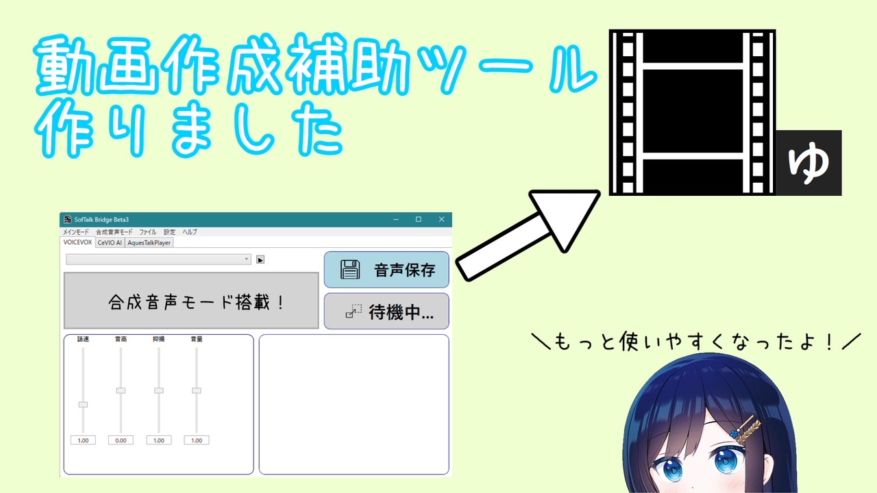 補足<br>「動画作成ツール」と名乗っていますが、仕組み上wavファイルが読み込めればどのソフトでも使えます。<br>そう、エクスプローラーであってもね<br><br>------------------------------------------------------------------------------------------<br><br>8月上旬にあげたかったな・・・・<br><br>SofTalk Bridgeに大型アップデートが来ました!<br>ソフト内で作成できるようになってます!<br><br>動画内のSigna Talkの紹介動画<br><a href="https://www.nicovideo.jp/watch/sm45313069" target="_blank" rel="noopener nofollow">https://www.nicovideo.jp/watch/sm45313069</a><br><br>AviUtl ExEdit2 Beta7<br>CeVIO AI:双葉湊音<br>BGM:昼下がりの気分<br>フォント:けいふぉんと、うずらふぉんと<br>立ち絵:双葉湊音(ユメのオワリ様)<br><br>サイト: <a href="https://softalk-bridge.shidunami.com" target="_blank" rel="noopener nofollow">https://softalk-bridge.shidunami.com</a><br>ご要望・不具合: <a href="https://forms.gle/w6nt2E7vhqCwZK82A" target="_blank" rel="noopener nofollow">https://forms.gle/w6nt2E7vhqCwZK82A</a>