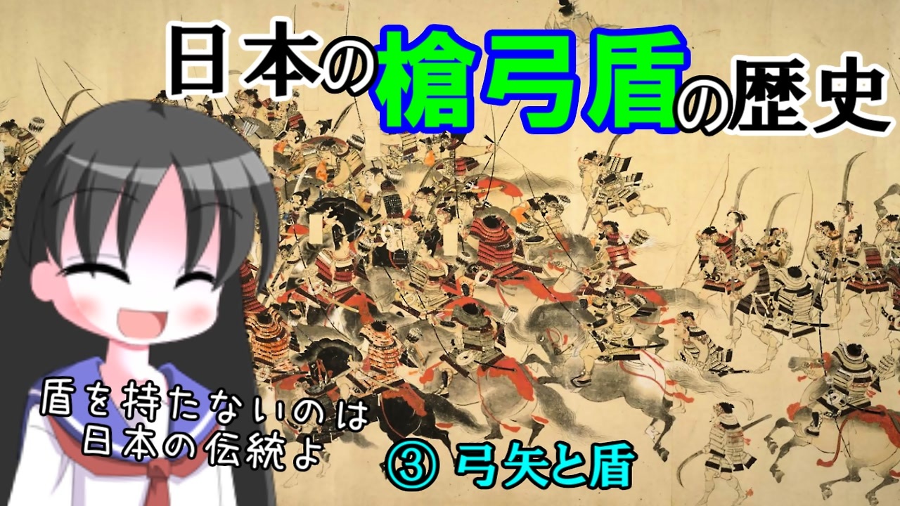 ネットで興味を持ったものを動画にまとめてみました。<br>間違いが多いと思いますが、温かい目で見てください。<br><br>本動画は槍、弓、盾のの変遷について解説するものです。<br>第3回は弓と盾の話です。<br><br>キャラ絵はキャラクターなんとか機のものを使用しています。<br>(K.Hみっくす ふぁーすとえでぃしょん)<br><a href="http://khmix.sakura.ne.jp/download.shtml" target="_blank" rel="noopener nofollow">http://khmix.sakura.ne.jp/download.shtml</a><br />ーーーーーーーーーーーーーーーーーーーーーー<br>歴史解説動画シリーズ<br><a href="https://www.nicovideo.jp/series/223250" target="_blank" rel="noopener">series/223250</a><br>◎ 日本語はなぜ三種類の文字をつかうのか(三部作)<br>◎ 本当に淀君と呼んではいけないのか<br>◎ 日本最古のアンケートの質問は何か<br>◎ 天正十年、明智光秀が見た天変は何か<br>◎ フランクからフランスに変わったのはいつか(ニ部作)<br>◎ 古代中世近代の時代区分はどう変わってきたのか(六部作)<br>◎ なすの諺の由来はなにか(ニ部作)<br>◎ フランスの尊厳王はイギリス獅子心王のライバル足りえるのか<br>◎ 佐賀滋賀須賀瀬賀蘇我伊賀甲賀<br>◎ なぜ飛鳥・長谷・日下・春日はこう読むのか<br>◎ なぜ日本は車は左側通行なのか<br>◎ 古代中国の様子は漢字からわかるのか(二部作)<br>◎ 気候変化は歴史にどのように関わるのか(三部作)<br>◎ 鎌倉幕府の成立年はいつか<br>◎ 一年の始まりはどのように決まったのか(七部作)<br>◎ 猫は日本史にどのような影響を与えたか(二部作)<br>◎ 本当に日本書紀にそう書いているのか<br>◎ 東洋西洋と太平洋はどう関係するのか(二部作)<br>◎ 騎虎の勢い、下りるを得ず<br>◎ 望遠鏡の歴史はどのようなものか(三部作)<br>◎ どうしてドイツと呼ぶのか(四部作)<br>◎ 南シナ海の白人王国にどうような歴史があるのか<br>◎ 筆記用具の歴史(四部作)<br>◎いろは歌と五十音はどのようにかわったか(五部作)<br>◎ アンティキティラの機械とは何か<br>◎ん、ヴそして濁点はどのようにしてできたのか(二部作)<br>◎曹操と孔明の兵法(四部作)<br>◎槍弓盾の歴史はどのようなものか(三部作)<br>◎シュリーマンは日本に何を見たのか(二部作)<br>ーーーーーーーーーーーーーーーーーーーーーー