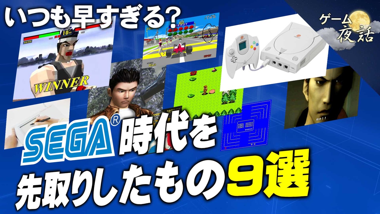 前回の動画にギフト・ニコニ広告して下さった方、ありがとうございました。<br>原則、毎週金曜日の更新を予定しています。<br><br>▼ゲーム夜話マイリスト<br><a href="https://www.nicovideo.jp/mylist/56973971" target="_blank" rel="noopener nofollow">https://www.nicovideo.jp/mylist/56973971</a><br><br>🔽第227回「セガが時代を先取りしたもの9選」<br>今回は、時代を先取りするでおなじみの、セガの先駆者としての挑戦の歴史を振り返るという企画です。<br><br>✅関連動画<br>🔽「セガサターン・ドリームキャストの誕生秘話」<br>前編:<a href="https://www.nicovideo.jp/watch/sm42830256" class="watch">sm42830256</a><br>中編:<a href="https://www.nicovideo.jp/watch/sm42853380" class="watch">sm42853380</a><br>後編:<a href="https://www.nicovideo.jp/watch/sm42874810" class="watch">sm42874810</a><br><br>🔽「セガVS任天堂 ハード戦争の歴史」<br>前編:<a href="https://www.nicovideo.jp/watch/sm40979307" class="watch">sm40979307</a><br>後編:<a href="https://www.nicovideo.jp/watch/sm41001457" class="watch">sm41001457</a><br><br>🔽「3Dゲームの夜明け~バーチャファイターの誕生秘話」<br>前編:<a href="https://www.nicovideo.jp/watch/sm35129257" class="watch">sm35129257</a><br>後編:<a href="https://www.nicovideo.jp/watch/sm35165683" class="watch">sm35165683</a><br><br>🔽「開発費70億円~シェンムー誕生秘話」<br>前編:<a href="https://www.nicovideo.jp/watch/sm42095766" class="watch">sm42095766</a><br>中編:<a href="https://www.nicovideo.jp/watch/sm42140797" class="watch">sm42140797</a><br>後編:<a href="https://www.nicovideo.jp/watch/sm42150165" class="watch">sm42150165</a><br><br>🔽「龍が如く」の解説動画~ターゲットを絞って成功<br>前編:<a href="https://www.nicovideo.jp/watch/sm32104987" class="watch">sm32104987</a><br>後編:<a href="https://www.nicovideo.jp/watch/sm32146682" class="watch">sm32146682</a><br><br>■ゲーム夜話「X(旧:ツイッター」<a href="https://twitter.com/gameyawa" target="_blank" rel="noopener nofollow">https://twitter.com/gameyawa</a><br><br>🔽参考・引用元<br>「UFOキャッチャーが人の心を“つかみ”続けている理由」<br><a href="https://www.itmedia.co.jp/business/articles/1709/20/news012.html" target="_blank" rel="noopener nofollow">https://www.itmedia.co.jp/business/articles/1709/20/news012.html</a><br><br>「現代の通信速度はこんなに違う! 歴代のインターネット回線との差」<br><a href="https://flets-w.com/chienetta/technology/nrt_ser-cat36_modern-internet-speed.html" target="_blank" rel="noopener nofollow">https://flets-w.com/chienetta/technology/nrt_ser-cat36_modern-internet-speed.html</a>