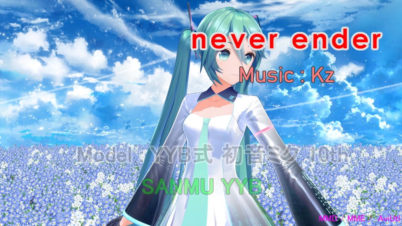 祝 初音ミク誕生祭2025。<br>YYB様の初音ミク 10thモデルをお借りして構成しています。<br>以前、ぴるら式初音ミク vampireをお借りして、Ray-MMDの構成を(<a href="https://www.nicovideo.jp/watch/sm44818337" class="watch">sm44818337</a>)作りましたが、<br>明るいステージで Yちゃん 10thモデルで構成してみたいと作りました。<br>ということで、原点にもどってMMDとMMEの構成です。<br><br>6ステージをつなげて、Yちゃんを含めた全体の色調を揃えるようにしました。<br>これにはステージの「揺らぐお花畑」と合わせるため、「白花畑_昼」で提供されているスカイドームを組み合わせて色の構成を揃えています。<br>ステージは、ちょっとノイズが乗っていますが、理解が足りていない・・かも。<br><br>このMMD作品は、下記の方々の作品をお借りして構成しています。<br>各作者様、感謝とお礼を申し上げます。<br>本当にありがとうございます。<br><br><br>楽曲 :<br> 「never ender」 : kz 様<br><br>モーション :<br> 【MMD】 never ender 【モーショントレース】 : そらと 様<br><br> トレース元動画 : 足太ぺんた様<br> <br>カメラモーション :オリジナル(<a href="https://www.nicovideo.jp/watch/sm44890953" class="watch">sm44890953</a>で配布したもの)<br> <br>モデル :<br> YYB Hatsune Miku_10th : 三目YYB 様<br><br>ステージ:<br> 揺らぐお花畑 : hiro K 様<br><br>スカイドーム :<br> 手描きスカイドーム青:Ai 様<br> --- 白花畑_昼 に同梱されているものをお借りしました ----<br><br>エフェクト:<br> AutoLuminous Ver.4.2 : そぼろ 様<br> 超高品質セルフシャドウエフェクト Ver.2.4 : そぼろ 様<br><br>ツール:<br> MMD : 樋口優 様<br> MME : 舞力介入P 様<br> AviUtl : KENくん 様<br><br>■■ お礼 ■■<br>ミーネンロイマー様(2回)、Katie T様、さどんです♪様、xf108様、01Pvocalo様、sunwillshine様、muka様、すなこなつも様、touketu2様、YTひまわり様、Kheyi様、木花佐久夜様、ひでくん様、こしひかり様、けいたぼ様、クロ151様、kawayan様、Green .g様、まっつぁん様、airiswhite様、touketu様、ヒイロユイ様(2回)<br>ニコニコ広告、ありがとうございました。