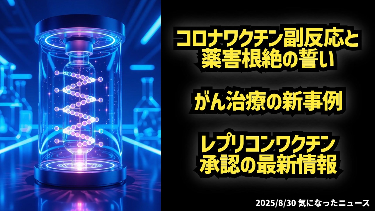◆コロナワクチン副反応と薬害根絶の誓い 厚労省会見◆がん治療の新事例◆レプリコンワクチン承認の最新情報<br><br>あらすじ<br>厚生労働省での薬害根絶の誓いでは、コロナワクチン副作用を訴える患者の声が注目を集めた。大臣は会釈で応じたが、信頼回復は課題に。一方、アメリカではステージ4の大腸がん患者がイベルメクチンで腫瘍縮小の事例が話題。科学的検証は未完だ。Meiji Seika ファルマのレプリコンワクチンは変異株対応で承認、秋接種へ。医療の進展と課題が交錯する話題を追う。<br><br>◆今回の台本<a href="https://keiichiro8140.hatenablog.com/entry/20250830000111" target="_blank" rel="noopener nofollow">https://keiichiro8140.hatenablog.com/entry/20250830000111</a><br><br>◆もしも(BAN)の時のためのマイリンク集<a href="https://lit.link/K16_888" target="_blank" rel="noopener nofollow">https://lit.link/K16_888</a><br><br>◆チャンネル登録よろしくお願いします<a href="https://www.youtube.com/@K16news888" target="_blank" rel="noopener nofollow">https://www.youtube.com/@K16news888</a><br><br>ご覧いただきありがとうございます<br>m(_ _)m<br>気になったニュース 2025/8/30<br><br />著作権、肖像権に配慮して作成しております。<br><br>◆気になったニュースの台本!?<br>メモ代わりに作った台本をそのままあげてます<br><a href="https://keiichiro8140.hatenablog.com/." target="_blank" rel="noopener nofollow">https://keiichiro8140.hatenablog.com/.</a><br><br><br>ここからはシリーズ紹介<br><br><br>◆ ワクチン解毒・デトックス<br><a href="https://x.gd/fZweg" target="_blank" rel="noopener nofollow">https://x.gd/fZweg</a><br><br>◆ウイリアム・マキス博士のがん治療(イベルメクチン・フェンベンダゾール等)<br><a href="https://x.gd/AtFYS" target="_blank" rel="noopener nofollow">https://x.gd/AtFYS</a><br><br>◆予防接種健康被害救済制度<br><a href="https://x.gd/0xK9x" target="_blank" rel="noopener nofollow">https://x.gd/0xK9x</a><br><br>◆気になったニュース #1501~<br><br>◆ 【ショートver】気になったニュース<br><a href="https://x.gd/7MxXC" target="_blank" rel="noopener nofollow">https://x.gd/7MxXC</a><br><br>◆ 気になったニュース #1001~<br><a href="https://x.gd/Lp8gv" target="_blank" rel="noopener nofollow">https://x.gd/Lp8gv</a><br><br>◆ 気になったニュース #501~<br><a href="https://x.gd/EmbS4" target="_blank" rel="noopener nofollow">https://x.gd/EmbS4</a><br><br>◆ 気になったニュース #1~#500<br><a href="https://x.gd/uPhNb" target="_blank" rel="noopener nofollow">https://x.gd/uPhNb</a><br><br>◆ X(旧Twitter)・テレグラムで気になった情報<br><a href="https://x.gd/YG6FT" target="_blank" rel="noopener nofollow">https://x.gd/YG6FT</a><br><br>◆ 日比谷5万人パレードデ⚪生放送アーカイブ動画<br><a href="https://x.gd/3CHJv" target="_blank" rel="noopener nofollow">https://x.gd/3CHJv</a><br><br>◆日比谷5万人パレード⚪モのマイリスト作ってみました<br><a href="https://nico.ms/mylist/76828848?ref=sp_other" target="_blank" rel="noopener nofollow">https://nico.ms/mylist/76828848?ref=sp_other</a><br><br>◆3.30 令和の百姓⚪⚪<br><a href="https://www.nicovideo.jp/series/511791?ref=garage_share_other" target="_blank" rel="noopener nofollow">https://www.nicovideo.jp/series/511791?ref=garage_share_other</a><br><br>◆ 及川幸久さんの【XNEWS】シリーズ<br><a href="https://x.gd/3k78K" target="_blank" rel="noopener nofollow">https://x.gd/3k78K</a><br><br>◆これまでの動画<a href="https://x.gd/sPXoJ" target="_blank" rel="noopener nofollow">https://x.gd/sPXoJ</a><br><br>◆もしも(BAN)の時のためのマイリンク集<a href="https://lit.link/K-16_News44" target="_blank" rel="noopener nofollow">https://lit.link/K-16_News44</a><br><br>