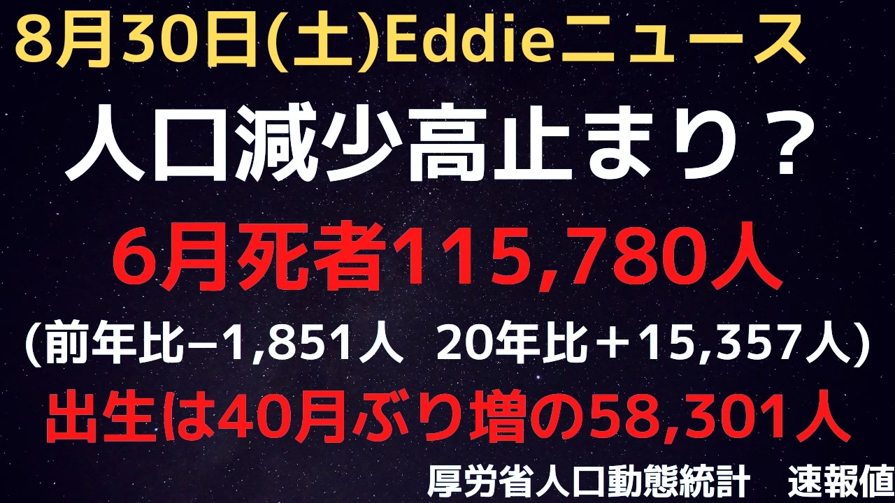 参考URL<br><a href="https://www.mhlw.go.jp/toukei/saikin/hw/jinkou/geppo/s2025/dl/202506.pdf" target="_blank" rel="noopener nofollow">https://www.mhlw.go.jp/toukei/saikin/hw/jinkou/geppo/s2025/dl/202506.pdf</a><br />Eddieと申します。<br>少し引棒めいたニュースを集めて喋っています。<br>よろしくお願いします。<br><br>23時過ぎYouTubeライブ配信(マイペース配信中)<br>「Eddieのホンマやと思うニュース3」<br><a href="https://www.youtube.com/channel/UCKaftD6X-qeHC5Vd9CMCedw" target="_blank" rel="noopener nofollow">https://www.youtube.com/channel/UCKaftD6X-qeHC5Vd9CMCedw</a><br><br>ニコ生は毎週土曜21時半〜(もしくは日曜21時半〜)<br><br>twitter<br>@Eddie2travel<br><br>YouTubeライブ配信1000回記念グッズなど販売中<br><a href="https://suzuri.jp/Eddie-Homma3" target="_blank" rel="noopener nofollow">https://suzuri.jp/Eddie-Homma3</a><br><br>