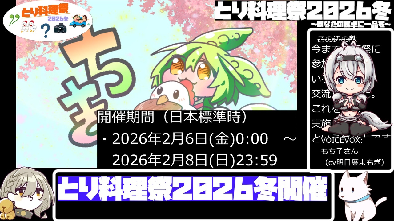ロゴ:<a href="https://commons.nicovideo.jp/works/nc430006" target="_blank" rel="noopener nofollow">https://commons.nicovideo.jp/works/nc430006</a><br><br>【レギュレーション】<br>開催期間(日本標準時)<br>・2026年2月6日(金)0:00 ~ 2026年2月8日(日)23:59<br> ◆フライングはなし。応援動画はOK。<br> 遅刻はいつまでもお待ちしております(まとめ動画にのらなかったらごめんなさい)<br><br>参加方法(レギュレーション)<br> ◆「とり」をメインとした動画をニコニコ動画にアップすること<br> youtube、Twitterまで手が回らない・・・<br> ◆以下の禁止事項に該当しないこと<br> 法律や倫理的、衛生的にNGなこと<br> 特に食べ物を粗末にすること、食用以外のものを食べること<br> ◆動画の中で「とり」をどう「料理」したのか明示すること<br> ◆「とり料理祭2026冬」でタグロックを行う<br> ※企画告知動画の親作品登録は任意<br> ◆ほかの投稿祭との同時投稿は相手側のレギュレーションに準じる<br><br>お題枠<br>・ご飯のおとも<br>・酒の肴<br /><br>編集に使用させていただいているものは、プロフィールみてね!<br><a href="https://www.nicovideo.jp/user/311366" target="_blank" rel="noopener nofollow">https://www.nicovideo.jp/user/311366</a><br><br>読み上げ:VOICEVOX もち子(cv明日葉よもぎ)、ずんだもん、四国めたん、青山龍星、WhiteCUL、伊織弓鶴、COEIROINK:猫米茶<br><br><strong>過去の動画にコメント、いいね!、ギフト、広告、フォロー、マイリストありがとうございました!</strong><br><br>とり料理祭ありがとうございました!<br>2023参加作品はこちら ⇒ <a href="https://www.nicovideo.jp/mylist/75430531" target="_blank" rel="noopener nofollow">https://www.nicovideo.jp/mylist/75430531</a><br>2024冬参加作品はこちら ⇒ <a href="https://www.nicovideo.jp/mylist/75862737" target="_blank" rel="noopener nofollow">https://www.nicovideo.jp/mylist/75862737</a><br>2024夏参加作品はこちら ⇒ <a href="https://www.nicovideo.jp/mylist/76572716" target="_blank" rel="noopener nofollow">https://www.nicovideo.jp/mylist/76572716</a><br>2025冬参加作品はこちら ⇒ <a href="https://www.nicovideo.jp/mylist/77171241" target="_blank" rel="noopener nofollow">https://www.nicovideo.jp/mylist/77171241</a><br>2025夏参加作品はこちら ⇒ <a href="https://www.nicovideo.jp/mylist/77600849" target="_blank" rel="noopener nofollow">https://www.nicovideo.jp/mylist/77600849</a><br><br>このその日ごとになんか出す定食屋か駄菓子屋のごとき動画を継続して投稿するために<br>スポンサーをひっそり募集しております、あなたも一口いかが?<br><a href="https://creator-support.nicovideo.jp/registration/311366" target="_blank" rel="noopener nofollow">https://creator-support.nicovideo.jp/registration/311366</a>