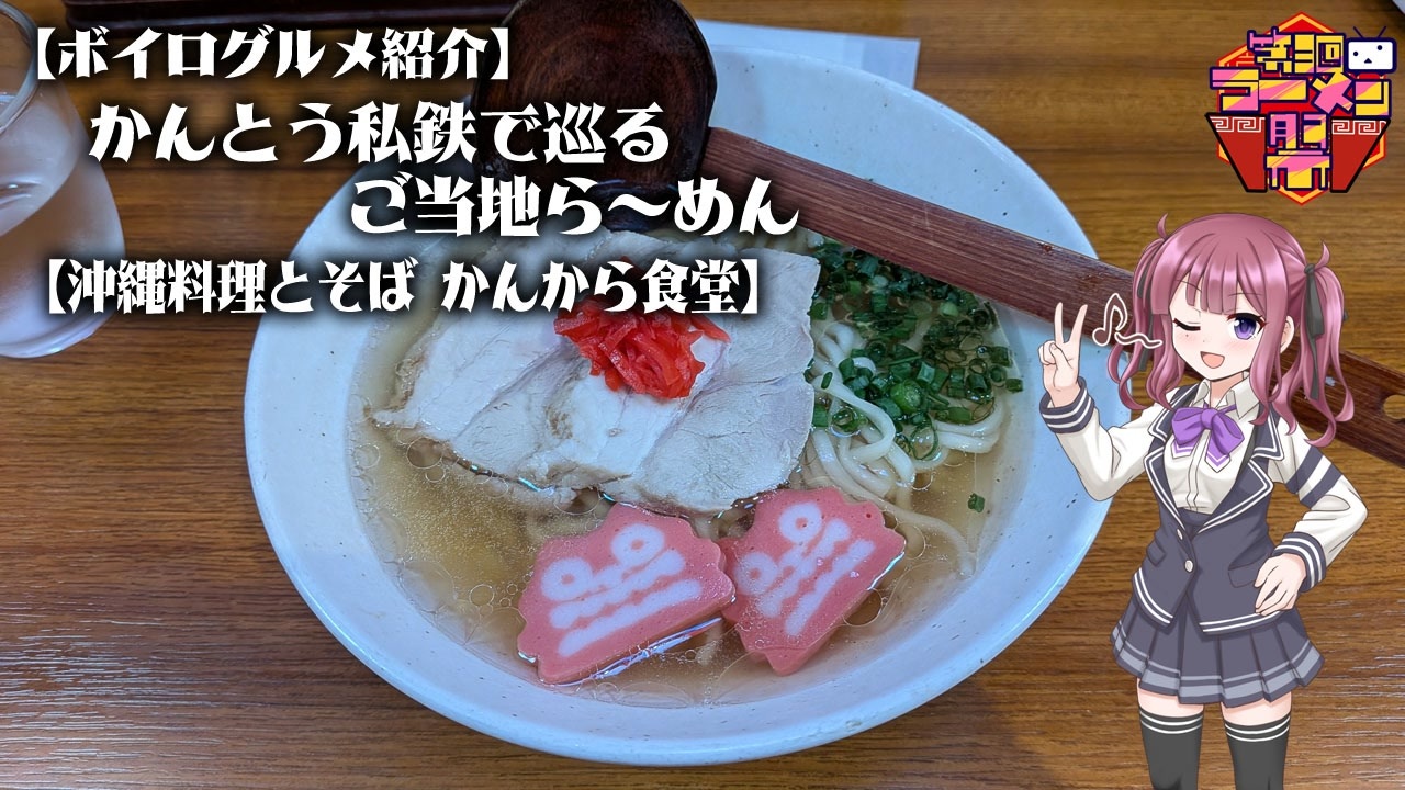 <span style="color: #ff0000; font-size: 16px;"><strong>本動画は、アクロ様(<a href="https://www.nicovideo.jp/user/30818455" target="_blank" rel="noopener">user/30818455</a>)主催の第三回ニコニコラーメン祭への投稿動画になります。</strong></span><br><br>この動画は、ボイスロイド(CeVIO含む)による関東私鉄沿線で食べることが出来るご当地ラーメンについての紹介動画で、今回は沖縄県のご当地グルメの一つで、沖縄そばや沖縄料理のお店である『沖縄料理とそば かんから食堂』の紹介動画になります。<br>なお、今回の紹介(進行)役ボイロは、夏色花梨、さとうささら、琴葉葵になります。<br>また、Discordにラーメンについての雑談や情報交換が出来るサーバーを開設したので、ラーメン好きな方の参加をお待ちしています。<br> ⇒れいむそふぃあのら~めん談話室 <a href="https://discord.gg/kZv5GrZ2mQ" target="_blank" rel="noopener nofollow">https://discord.gg/kZv5GrZ2mQ</a><br><br>【紹介したラーメン店】<br> 沖縄料理とそば かんから食堂(東京都渋谷区渋谷3-18-6)<br> ・営業時間:11:00~28:00<br> ・定休日:無休<br> ・アクセス:東急・京王・東京メトロ・JR渋谷駅から徒歩1分<br> ・決済方法:現金のみ<br><br>【参考サイト】<br> Wikipedia<br> ラーメンデータベース <a href="https://ramendb.supleks.jp/" target="_blank" rel="noopener nofollow">https://ramendb.supleks.jp/</a><br> 新横浜ラーメン博物館 <a href="https://www.raumen.co.jp/" target="_blank" rel="noopener nofollow">https://www.raumen.co.jp/</a><br> 有限会社 オフィスりょう次 <a href="https://www.ryoji-family.co.jp/" target="_blank" rel="noopener nofollow">https://www.ryoji-family.co.jp/</a><br> 我部祖河食堂 <a href="https://www.gabusokasoba.com/" target="_blank" rel="noopener nofollow">https://www.gabusokasoba.com/</a><br><br>【使用ソフトトーク】<br> CeVIO(夏色花梨、さとうささら)、VOICEROID2(琴葉葵)<br><br>【使用素材サイト】<br> ニコニコ静画 <a href="https://seiga.nicovideo.jp/" target="_blank" rel="noopener nofollow">https://seiga.nicovideo.jp/</a><br> ・ボイスロイド立ち絵:ふにちか様 <a href="https://www.nicovideo.jp/user/1399358" target="_blank" rel="noopener">user/1399358</a>、マッチャー様 <a href="https://www.nicovideo.jp/user/86990607" target="_blank" rel="noopener">user/86990607</a><br> ・日帰り旅行祭2023・2024テーマソング:いとーじ様 <a href="https://www.nicovideo.jp/user/96289286" target="_blank" rel="noopener">user/96289286</a><br> ニコニ・コモンズ <a href="https://commons.nicovideo.jp/materials/" target="_blank" rel="noopener nofollow">https://commons.nicovideo.jp/materials/</a><br>