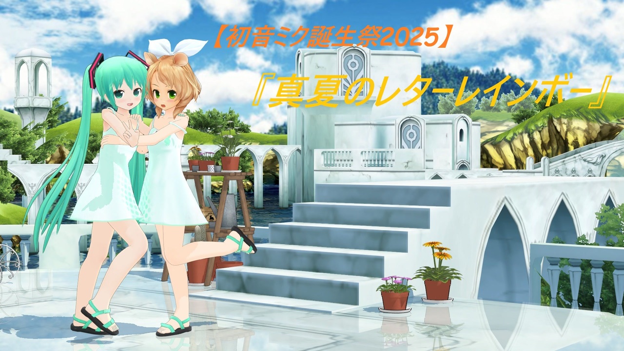 <span style="color: #00ff00; font-size: 24px;"><strong>今日の本命はこちらです(爆)<br>ミクさんお誕生日おめでとー!</strong></span><br><br>今は配布が終了してしまった ぴくちぃ式ミクちゃんとお揃いのワンピを着た(ぴくちぃ式ミクちゃんを改変)マリエルさんで夏と言えばこの曲が最初に思い浮かぶ『真夏のレターレインボー』を踊ってもらいました。<br><br>【楽曲】<br>@まさたか 様【初音ミク】真夏のレターレインボー【オリジナル曲&PV】(<a href="https://www.nicovideo.jp/watch/sm21605926" class="watch">sm21605926</a>)<br>【モーション】<br>トレース元:足太ぺんた 様【足太ぺんた】真夏のレターレインボー full 踊ってみた【オリジナル】(<a href="https://www.nicovideo.jp/watch/sm26481215" class="watch">sm26481215</a>)<br>モーショントレース&配布:0729robo 様【MMD】真夏のレターレインボーfull【モーショントレース】(<a href="https://www.nicovideo.jp/watch/sm27102085" class="watch">sm27102085</a>)<br>カメラ:BOON 様 ※配布動画削除<br>【ステージ】<br>かにひランド:かにひら 様(<a href="https://www.nicovideo.jp/watch/sm13760761" class="watch">sm13760761</a>)<br>親水公園ウッドデッキ:asado様 親水公園 (修正)更新版 UPしました。(<a href="https://seiga.nicovideo.jp/seiga/im4968693" target="_blank" rel="noopener">im4968693</a>)<br>【アクセサリ他】<br>植木鉢とか棚:とりそば様の鉢花セット(<a href="https://seiga.nicovideo.jp/seiga/im7857027" target="_blank" rel="noopener">im7857027</a>)、パラソル付きガーデンテーブル(<a href="https://seiga.nicovideo.jp/seiga/im6125097" target="_blank" rel="noopener">im6125097</a>)<br>ベンチ:Akinon様 ベンチ01(<a href="https://seiga.nicovideo.jp/seiga/im5955263" target="_blank" rel="noopener">im5955263</a>)<br>ケーキスタンドセット:キャベツ鉢 様 ケーキスタンドセットver1.0(<a href="https://seiga.nicovideo.jp/seiga/im5320718" target="_blank" rel="noopener">im5320718</a>)<br>ティセット:帽子屋 様【MMDアクセサリ】フランス紅茶店で出てきそうなティーセット(<a href="https://seiga.nicovideo.jp/seiga/im2064664" target="_blank" rel="noopener">im2064664</a>)<br>【モデル】<br>ぴくちぃ式ミク:ぴくちぃ 様 ※モデル配布終了<br>マリエルさん:かにひら 様(<a href="https://www.nicovideo.jp/watch/sm13760761" class="watch">sm13760761</a>)※ボディはぴくちぃ式ミクちゃん<br>マリエルさんの被り物:帽子類の出自が不明となっております。ご存知の方はご教示願えると助かります。<br><br>※麦わら帽子のツバに腕がめり込むのは如何ともし難い仕様です(爆<br><br>【広告御礼】<br>クロ151 様、かつサンド 様(そこです!見えそうで見えないのが良いのです!(今回はちょっとチラチラしてますが)大量投入ありがとうございます!)、シロミミズク 様、はやぶさからす 様、L3 様(おめでとー!&かわいいー ありがとうー)、昼寝 様(我慢大事!)、えどーん 様、氷結果実 様(ユノアさんが欲しがったらどうしよう…… 追加感謝です)、sunafukin 様、針井 原也 様、CBX250S 様、xf108 様、giolum 様、名無し 様、Masa 様(爽やかワンピ可愛いですよね)、どりーむまっぷ 様、onono M 様<br><br />【これまでに投稿した動画リスト】<a href="https://www.nicovideo.jp/mylist/79114913" target="_blank" rel="noopener">mylist/79114913</a><br>【これまでに投稿した静画リスト】<a href="https://seiga.nicovideo.jp/user/illust/7589339" target="_blank" rel="noopener">user/illust/7589339</a><br><br>【その他、常用ツールなど】<br>MikuMikuDance:樋口優 様(<a href="https://www.nicovideo.jp/watch/sm2420025" class="watch">sm2420025</a>)<br>つんでれんこ:窓屋 様(<a href="https://www.nicovideo.jp/watch/sm7634361" class="watch">sm7634361</a>)<br>VMDサイジング:miu 様(<a href="https://seiga.nicovideo.jp/seiga/im9755721" target="_blank" rel="noopener">im9755721</a>)<br>PMXE:とある工房 様<br>MME:舞力介入P 様(<a href="https://www.nicovideo.jp/watch/sm12149815" class="watch">sm12149815</a>)<br>MikuMikuTelop:そぼろ様(<a href="https://www.nicovideo.jp/watch/sm15635052" class="watch">sm15635052</a>)<br>AutoLuminous:そぼろ 様(<a href="https://www.nicovideo.jp/watch/sm19843111" class="watch">sm19843111</a>)<br>スカイドーム:怪獣対若大将P 様、seasalt 様<br>なんやかんや色々なエフェクト:ビームマンP 様<br>とても便利なPMXEプラグイン:L3 様(<a href="https://www.nicovideo.jp/watch/sm44255948" class="watch">sm44255948</a>)<br>葉っぱとか柵とかの周囲を綺麗にするシェーダ:おたもん 様(<a href="https://seiga.nicovideo.jp/seiga/im3131306" target="_blank" rel="noopener">im3131306</a>)<br>大理石を鏡のように綺麗にする魔法:針金P 様「WorkingFloor2.fx ver0.0.8」<br>その他、書ききれないものはコンテンツツリーにて。<br>また、当方使用のモデルは俺得仕様改変したりしておりますのでご了承下さい。