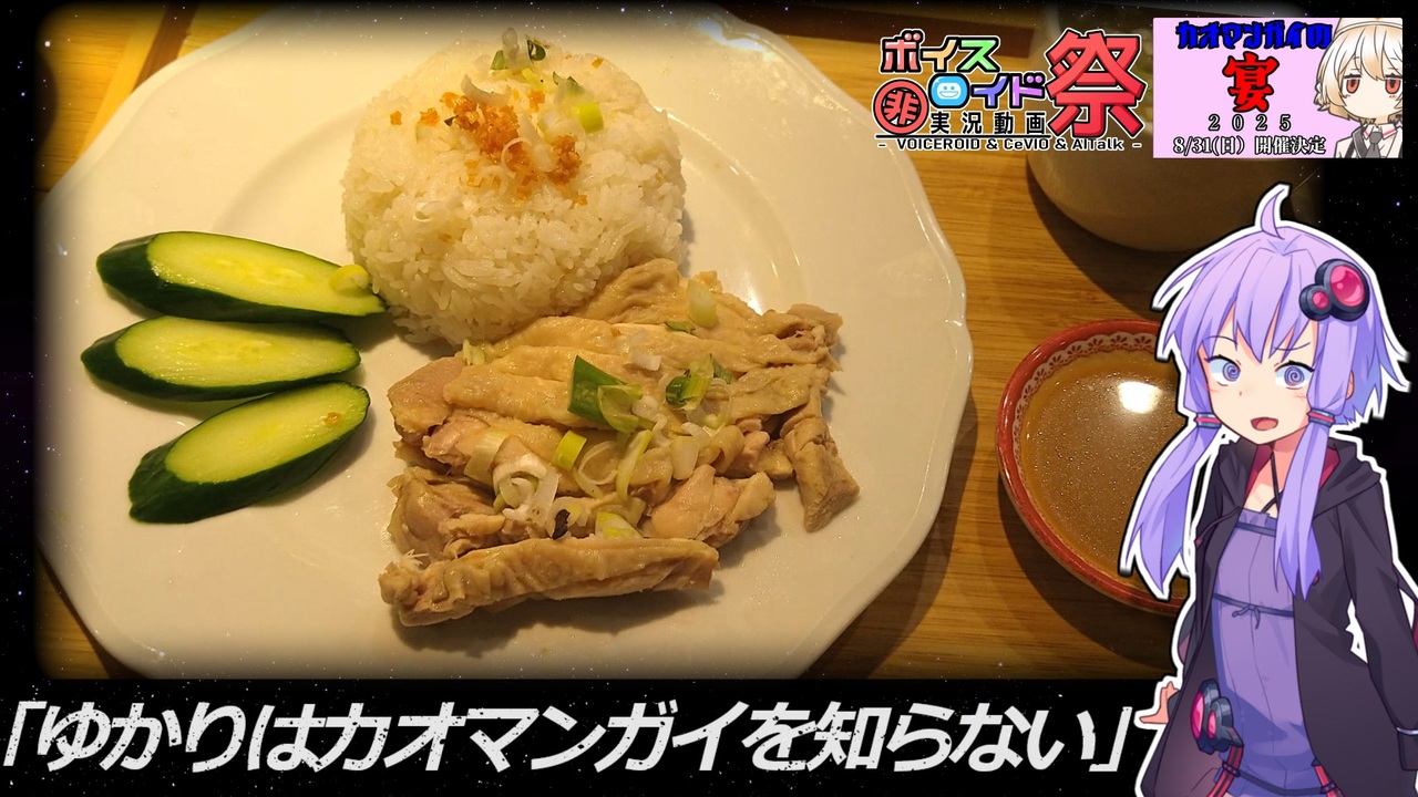 ???「彼女はカオマンガイに魂を囚われてしまったのだ」<br>というわけでカオマンガイの何たるかを知らなかった麹菌憑き結月ゆかりは本物のカオマンガイを求めてお店に行ったのであった<br><br><span style="font-size: 16px;"><strong>本動画は物体Bさん主催の「カオマンガイの宴2025(告知動画:<a href="https://www.nicovideo.jp/watch/sm45195512" class="watch">sm45195512</a>)」の参加動画となります<br>カオマンガイリレーの仕掛けに始まり、楽しい企画をありがとうございました!!<br>そして第11回ひじき祭(<a href="https://www.nicovideo.jp/watch/sm44932816" class="watch">sm44932816</a>)にも同時参加!<br>久々のひじき祭参戦である!!</strong></span><br><br><br><br>普段は料理やゲームや旅行やダジャレなど割と節操なく動画作ってます<br>・ゆかりキッチン(<a href="https://www.nicovideo.jp/series/165962" target="_blank" rel="noopener">series/165962</a>) ←メインシリーズ<br>・ゆかりキッチン・プチ(<a href="https://www.nicovideo.jp/series/388293" target="_blank" rel="noopener">series/388293</a>) ←サブシリーズ<br>・きりたん& al.のゲーム実況(<a href="https://www.nicovideo.jp/series/223053" target="_blank" rel="noopener">series/223053</a>)<br>・VOICEROIDクソダジャレ部(<a href="https://www.nicovideo.jp/series/248252" target="_blank" rel="noopener">series/248252</a>)<br>・あかりのふらっと探訪記(<a href="https://www.nicovideo.jp/series/320229" target="_blank" rel="noopener">series/320229</a>)<br>・我が家のボイロの気ままにグルメ(?)(<a href="https://www.nicovideo.jp/series/391509" target="_blank" rel="noopener">series/391509</a>)<br>・それ以外のやつ(<a href="https://www.nicovideo.jp/series/350456" target="_blank" rel="noopener">series/350456</a>)<br>