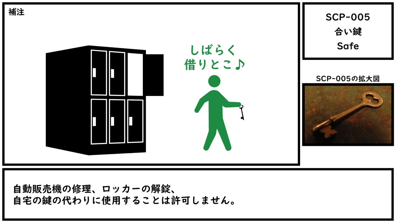 ミステリーもへったくれもありゃしない。 <br><br>原語版タイトル: SCP-005 - Skeleton Key<br>訳者: 訳者不明<br>原語版作者: Unknown Author<br>ソース: <a href="http://scp-jp.wikidot.com/scp-005" target="_blank" rel="noopener nofollow">http://scp-jp.wikidot.com/scp-005</a><br>原語版ソース: <a href="http://scp-wiki.wikidot.com/scp-005" target="_blank" rel="noopener nofollow">http://scp-wiki.wikidot.com/scp-005</a><br>ライセンス: CC BY-SA 3.0<br>作成年: 2013<br>原語版作成年: 2008 <br><br>この作品は株式会社アクエストのライセンス(ID:AQALCNTUSR02072507)に基づいて生成された音声データを含んでいます。