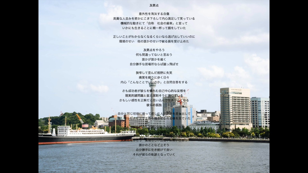 こんばんは。ボカコレ2025夏、なんとか滑り込みで間に合いました。<br>目指せランクイン🔥 よろしくお願いします。<br><br><br><br>⚫︎音楽:カンパニュラ<br><a href="https://x.com/hanatootya" target="_blank" rel="noopener nofollow">https://x.com/hanatootya</a><br><br>⚫︎お写真:莉沙さん(piaproよりお借りしました。感謝)<br><a href="https://piapro.jp/t/oO4J" target="_blank" rel="noopener nofollow">https://piapro.jp/t/oO4J</a><br><br>⚫︎歌:ゲキヤク<br><br>----<br><br>及第点<br><br>意外性を淘汰する自傷<br>高貴な人並みを密かにこき下ろして内心満足して笑っている <br>機械的な動きにて「自称 社会の歯車」と宣って<br>いかにも生きることに精一杯って顔をしていた <br><br>正しいことがわからなくなるくらいなら逃げ出していいのに<br>環境のせい 他の誰かのせいで被る損を受け止めた <br><br>及第点をやろう<br>何も間違ってないと言おう <br>誰かが誰かを裁く<br>自分勝手な居場所ならば蹴っ飛ばせ <br><br>狭窄して歪んだ視野に失笑<br>痛覚を頼りに歩く日々 <br>内心「こんなことでいいのか」と自問自答をする <br><br>さも成功者が彼らを憐れむ自己中心的な妄想を<br>現実的諸問題と捉え深刻そうに論じている <br>さもしい感性を正解だと思い込んで生きづらくなる <br>彼らの孤独 <br><br>自分と同じ坩堝に嵌って悲しむ人に両手を差し出して<br>隠し持ったナイフで手首を掻き切られる様を見ていた <br><br>そんな彼らのことが嫌いになれない人たちも <br>生きづらいまま理想の先ばかりを狭窄した視野で見ている <br><br>及第点をやろう 素晴らしい出会いに笑い合おう <br>誰かのことなど止そう<br>自分勝手に生き続けて良い <br>それが彼らの軌跡となっていく