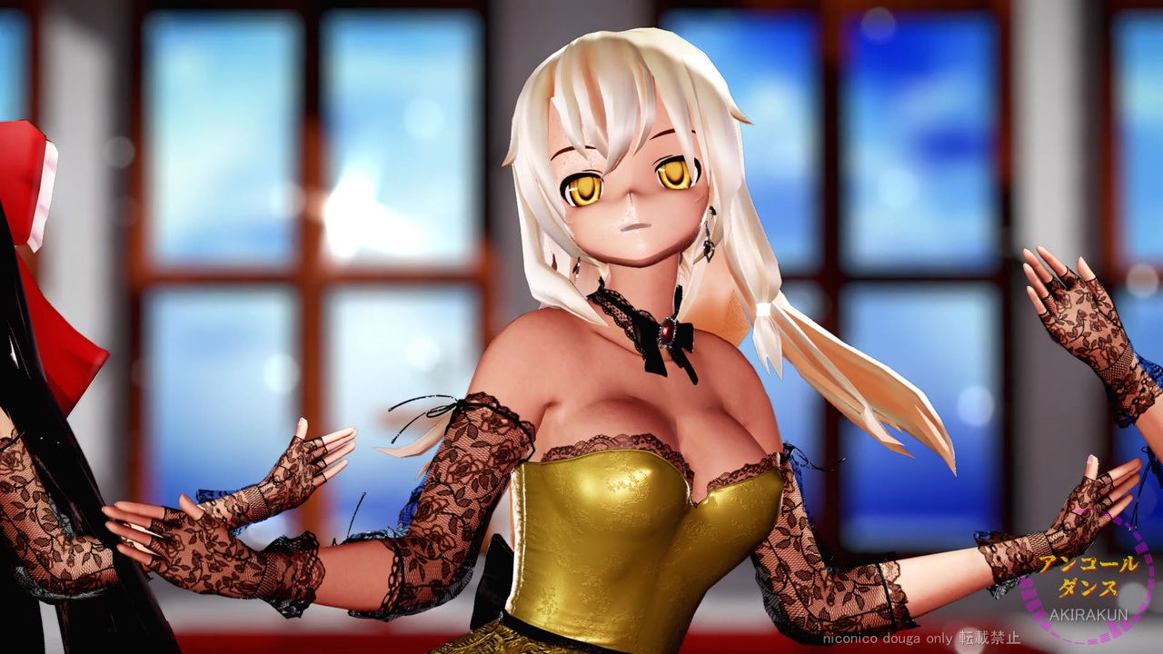 3人に踊ってもらいました。この作品は「東方project」の2次創作です。<br>現在、作成リクエストは受け付けていません。<br><br><br>【楽曲】:「アンコールダンス」:MIMI様 <a href="https://www.nicovideo.jp/watch/sm44755576" class="watch">sm44755576</a><br><br>【トレース元】:みさみさ様 <a href="https://www.nicovideo.jp/watch/sm45124760" class="watch">sm45124760</a><br><br>【モーション・カメラ】:satano 様 <a href="https://www.nicovideo.jp/watch/sm45323196" class="watch">sm45323196</a><br><br>【リップ】:ねこまんま(猫飯)様 <a href="https://www.nicovideo.jp/watch/sm45328702" class="watch">sm45328702</a><br><br><br>■スカイドーム<br>まばゆい月光 TD8:怪獣対若大将P 様 <a href="https://seiga.nicovideo.jp/seiga/im6013794" target="_blank" rel="noopener">im6013794</a><br><br>■ステージ<br>コレクションカーテンステージ:栗ごはん様 <a href="https://seiga.nicovideo.jp/seiga/im11246770" target="_blank" rel="noopener">im11246770</a><br>窓ステージ:竜 ミヤ様 <a href="https://seiga.nicovideo.jp/seiga/im11577275" target="_blank" rel="noopener">im11577275</a><br>絵画の洋館:NOB 様 <a href="https://seiga.nicovideo.jp/seiga/im10674142" target="_blank" rel="noopener">im10674142</a><br>紅魔館:フレスベルク様 <a href="https://www.nicovideo.jp/watch/sm22298599" class="watch">sm22298599</a><br><br>■モデル<br>霊夢、魔理沙、アリス:にがもん様、しえら様<br>衣装:ゴスロリスタイル:アールビット様 <a href="https://seiga.nicovideo.jp/seiga/im11599067" target="_blank" rel="noopener">im11599067</a><br><br>■エフェクト<br>Ray-mmd-1.5.2:Rui様<br>初心者マテリアル:さらしな様<br>肌マテリアル:MARUSU様<br>Arlvit_dds:アールビット様<br>AutoLuminous4:そぼろ様<br>空中に漂う埃:化身バレッタ様<br>ikBokeh_v020a:ikeno様<br><br><br>MikuMikuDance:樋口優様<br>MMEffect :舞力介入P様<br>PMDE、PmxE:極北P様<br>AviUtl :KENくん様<br>・Aviutl + x264guiExでエンコード:rigaya様<br>Ut Video Codec suite:ゆーむP様<br>上海アリス幻楽団・東方project(ZUN様)<br><br><br>mylist ③<a href="https://www.nicovideo.jp/mylist/75586824" target="_blank" rel="noopener">mylist/75586824</a> ② <a href="https://www.nicovideo.jp/mylist/72970530" target="_blank" rel="noopener">mylist/72970530</a> ① <a href="https://www.nicovideo.jp/mylist/63690967" target="_blank" rel="noopener">mylist/63690967</a> 旧 <a href="https://www.nicovideo.jp/mylist/61238351" target="_blank" rel="noopener">mylist/61238351</a><br><br> ※動画の転載は禁止です。<br>Attention,Unauthorized reproduction prohibited!!