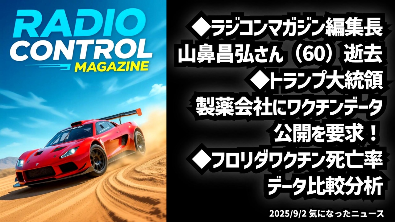 ◆ラジコンマガジン編集長逝去◆トランプ大統領、製薬会社にワクチンデータ公開を要求!◆フロリダワクチン死亡率データ比較分析<br><br>あらすじ<br>人気ラジコン雑誌の編集長急逝と休刊の背景を、家族の報告から紹介します。<a href="https://x.com/fraisst/status/1962765708972142812?t=mhQm5B1Xit9EkW6cz3YaPg&s=19" target="_blank" rel="noopener nofollow">https://x.com/fraisst/status/1962765708972142812?t=mhQm5B1Xit9EkW6cz3YaPg&s=19</a><br>トランプ大統領のソーシャル投稿では、COVID治療薬のデータ公開を求める内容。製薬会社の成果評価と関連機関の議論を指摘。<a href="https://x.com/20170211febhei/status/1962539873115767036?t=pLVKzxj-dhAipTE51AhK4Q&s=19" target="_blank" rel="noopener nofollow">https://x.com/20170211febhei/status/1962539873115767036?t=pLVKzxj-dhAipTE51AhK4Q&s=19</a><br>フロリダ州の研究では、2つのmRNAワクチンの死亡率データを比較分析。統計結果と推計値を概説し、さらなる調査の重要性を考察。<a href="https://x.com/w2skwn3/status/1962749537833099600?t=071yiJVusDZ64x9lfqcTmA&s=19" target="_blank" rel="noopener nofollow">https://x.com/w2skwn3/status/1962749537833099600?t=071yiJVusDZ64x9lfqcTmA&s=19</a><br><br>◆今回の台本<a href="https://keiichiro8140.hatenablog.com/entry/250902222" target="_blank" rel="noopener nofollow">https://keiichiro8140.hatenablog.com/entry/250902222</a><br><br>◆もしも(BAN)の時のためのマイリンク集<a href="https://lit.link/K16_888" target="_blank" rel="noopener nofollow">https://lit.link/K16_888</a><br><br>新チャンネルで再出発! 登録よろしくお願いします┏○)) <a href="https://www.youtube.com/@K16news888" target="_blank" rel="noopener nofollow">https://www.youtube.com/@K16news888</a><br><br>ご覧いただきありがとうございます<br>m(_ _)m<br>気になったニュース 2025/9/2<br><br />著作権、肖像権に配慮して作成しております。<br><br>◆気になったニュースの台本!?<br>メモ代わりに作った台本をそのままあげてます<br><a href="https://keiichiro8140.hatenablog.com/." target="_blank" rel="noopener nofollow">https://keiichiro8140.hatenablog.com/.</a><br><br><br>ここからはシリーズ紹介<br><br><br>◆ ワクチン解毒・デトックス<br><a href="https://x.gd/fZweg" target="_blank" rel="noopener nofollow">https://x.gd/fZweg</a><br><br>◆ウイリアム・マキス博士のがん治療(イベルメクチン・フェンベンダゾール等)<br><a href="https://x.gd/AtFYS" target="_blank" rel="noopener nofollow">https://x.gd/AtFYS</a><br><br>◆予防接種健康被害救済制度<br><a href="https://x.gd/0xK9x" target="_blank" rel="noopener nofollow">https://x.gd/0xK9x</a><br><br>◆気になったニュース #1501~<br><br>◆ 【ショートver】気になったニュース<br><a href="https://x.gd/7MxXC" target="_blank" rel="noopener nofollow">https://x.gd/7MxXC</a><br><br>◆ 気になったニュース #1001~<br><a href="https://x.gd/Lp8gv" target="_blank" rel="noopener nofollow">https://x.gd/Lp8gv</a><br><br>◆ 気になったニュース #501~<br><a href="https://x.gd/EmbS4" target="_blank" rel="noopener nofollow">https://x.gd/EmbS4</a><br><br>◆ 気になったニュース #1~#500<br><a href="https://x.gd/uPhNb" target="_blank" rel="noopener nofollow">https://x.gd/uPhNb</a><br><br>◆ X(旧Twitter)・テレグラムで気になった情報<br><a href="https://x.gd/YG6FT" target="_blank" rel="noopener nofollow">https://x.gd/YG6FT</a><br><br>◆ 日比谷5万人パレードデ⚪生放送アーカイブ動画<br><a href="https://x.gd/3CHJv" target="_blank" rel="noopener nofollow">https://x.gd/3CHJv</a><br><br>◆日比谷5万人パレード⚪モのマイリスト作ってみました<br><a href="https://nico.ms/mylist/76828848?ref=sp_other" target="_blank" rel="noopener nofollow">https://nico.ms/mylist/76828848?ref=sp_other</a><br><br>◆3.30 令和の百姓⚪⚪<br><a href="https://www.nicovideo.jp/series/511791?ref=garage_share_other" target="_blank" rel="noopener nofollow">https://www.nicovideo.jp/series/511791?ref=garage_share_other</a><br><br>◆ 及川幸久さんの【XNEWS】シリーズ<br><a href="https://x.gd/3k78K" target="_blank" rel="noopener nofollow">https://x.gd/3k78K</a><br><br>◆これまでの動画<a href="https://x.gd/sPXoJ" target="_blank" rel="noopener nofollow">https://x.gd/sPXoJ</a><br><br>◆もしも(BAN)の時のためのマイリンク集<a href="https://lit.link/K-16_News44" target="_blank" rel="noopener nofollow">https://lit.link/K-16_News44</a><br><br>
