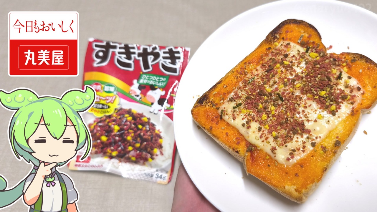 丸美屋の看板商品には「すきやき」というふりかけがあるのですが<br>アレンジレシピとして、チーズバーガー風トーストというものが掲載されていました。<br>簡単に出来そうなので作ってみることにしたのですが<br>本当にチーズバーガー風になるのでしょうか。<br><br><br><br>【参考】<br>チーズバーガー風トースト(丸美屋)<br><a href="https://www.marumiya.co.jp/cms/web/viewrecipe/1/2876" target="_blank" rel="noopener nofollow">https://www.marumiya.co.jp/cms/web/viewrecipe/1/2876</a><br>すきやき(丸美屋)<br><a href="https://www.marumiya.co.jp/cms/web/viewitem/5246/1" target="_blank" rel="noopener nofollow">https://www.marumiya.co.jp/cms/web/viewitem/5246/1</a><br>沿革(丸美屋)<br><a href="https://www.marumiya.co.jp/info/history.html" target="_blank" rel="noopener nofollow">https://www.marumiya.co.jp/info/history.html</a><br>丸美屋食品公式X 2020.07.15<br><a href="https://x.com/marumiya_jp/status/1283263062846267393" target="_blank" rel="noopener nofollow">https://x.com/marumiya_jp/status/1283263062846267393</a><br>2013年で発売50周年を迎える人気商品「すきやき」ふりかけ<br>~世代を超えて愛される人気のヒミツとは?~2013.05.17(PR TIMES)<br><a href="https://prtimes.jp/main/html/rd/p/000000001.000006905.html" target="_blank" rel="noopener nofollow">https://prtimes.jp/main/html/rd/p/000000001.000006905.html</a><br>お料理グッズキャンペーン(2025.09.01~11.09)(丸美屋)<br><a href="https://cp.marumiya.co.jp/kitchen/mark_cp.html#prize" target="_blank" rel="noopener nofollow">https://cp.marumiya.co.jp/kitchen/mark_cp.html#prize</a> <br><br>【使用した素材】(※敬称略) <br>(合成音声)VOICEVOX/ずんだもん/四国めたん<br><a href="https://voicevox.hiroshiba.jp/" target="_blank" rel="noopener nofollow">https://voicevox.hiroshiba.jp/</a> <br>(立ち絵)坂本アヒル<br> <a href="https://seiga.nicovideo.jp/seiga/im10788496?track" target="_blank" rel="noopener nofollow">https://seiga.nicovideo.jp/seiga/im10788496?track</a><br>(楽曲)甘茶の音楽工房/「楽しい麦畑」「フルーツパフェ」「お城の舞踏会」<br><a href="https://amachamusic.chagasi.com/" target="_blank" rel="noopener nofollow">https://amachamusic.chagasi.com/</a>