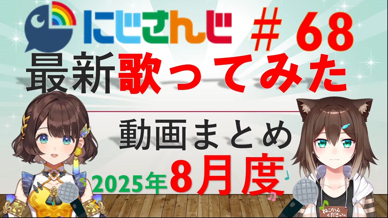 <span style="color: #00ff00;">◆</span>期間:2025年8月1日~8月31日<br><span style="color: #00ff00;">◆</span>対象:にじさんじライバーによる歌ってみた動画<br><span style="font-size: 10px;">(にじさんじのみ対象。JP・元ID・元KR・EN)</span><br><span style="color: #00ff00;">◆</span><span style="color: #262626;">参考サイト:(</span><span style="color: #262626;"><strong>↓元動画はこのページからご参照ください↓</strong></span><span style="color: #262626;">)</span><br>VMusic Ch. 様<br><a href="https://music.vtuber-ch.com/?gname=にじさんじALL" target="_blank" rel="noopener nofollow">https://music.vtuber-ch.com/?gname=にじさんじALL</a><br>にじさんじ非公式Wiki 様<br><a href="https://wikiwiki.jp/nijisanji/歌唱まとめ" target="_blank" rel="noopener nofollow">https://wikiwiki.jp/nijisanji/歌唱まとめ</a><br>にじさんじ 歌ってみた 最新順 Youtubeプレイリスト<br><a href="https://www.youtube.com/playlist?list=PLo0VKnP3BX4LlnsiHknyBjgVgSShf0ZQn" target="_blank" rel="noopener nofollow">https://www.youtube.com/playlist?list=PLo0VKnP3BX4LlnsiHknyBjgVgSShf0ZQn</a><br><br>前回(7月)の歌みたまとめ:<a href="https://www.nicovideo.jp/watch/sm45257766" class="watch">sm45257766</a><br>年間歌ってみたまとめ:<a href="https://www.nicovideo.jp/watch/sm44544012" class="watch">sm44544012</a><br><br>プレイリストは上記非公式Wiki内のプレイリストをご活用ください。<br>気になる歌動画を見つけたらぜひ、元動画をご覧ください!!<br><br>よく確認はしましたが、抜けがありましたらコメントをお願いいたします。<br><br>VMusic Ch. 様がサーバートラブルにつき1年間のデータが失われてしまったため、動画情報の参照を行えておりません。<br>VMusic Ch. 様のデータと自身で持っているデータを照らし合わせて検索したため、一部に誤りがあるかもしれません。御了承ください。