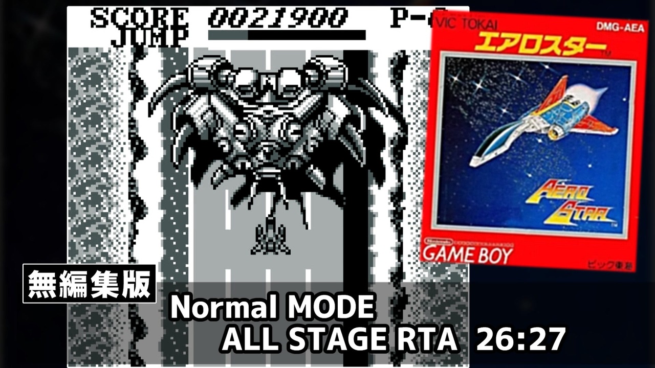 ゲームボーイソフト『エアロスター』のAllStageRTAの無編集版です。<br>エミュレータを使用しているので参考記録です。<br><br>自機が飛行機なのにジャンプして足場を乗り継ぐ、斬新な設定のシューティングです。<br>初見は違和感を覚えるもののプレイしてみると敵配置は考えられていますし、グラも良く、ジャンプのギミックも楽しい。<br>さらにBGMも両曲揃いと隠れた良ゲームだと思います。<br><br>編集つき→<a href="https://www.nicovideo.jp/watch/sm45438275" class="watch">sm45438275</a>(9/24 21:00公開)<br><br>走ったRTAのpart.1まとめ→<a href="https://www.nicovideo.jp/mylist/73222388" target="_blank" rel="noopener">mylist/73222388</a><br>RTA全部まとめ→<a href="https://www.nicovideo.jp/mylist/72786007" target="_blank" rel="noopener">mylist/72786007</a><br><br><u>▽レギュレーション</u><br>タイマー開始:タイトル画面で難易度を選択した瞬間<br>タイマー終了:ラスボスを撃破した瞬間<br>(SpeedRun.comのレギュレーション2準じています)<br><br><u>▽プレイ環境</u><br>エミュレータ使用<br>録画ソフト:ロイロゲームレコーダー<br><br>〇Twitter(現:X)→@Nagisa381rta<br><br>〇欲しいものリスト<br>→<a href="https://www.amazon.jp/hz/wishlist/ls/1S72L30BVRILK?ref_=wl_share" target="_blank" rel="noopener nofollow">https://www.amazon.jp/hz/wishlist/ls/1S72L30BVRILK?ref_=wl_share</a>