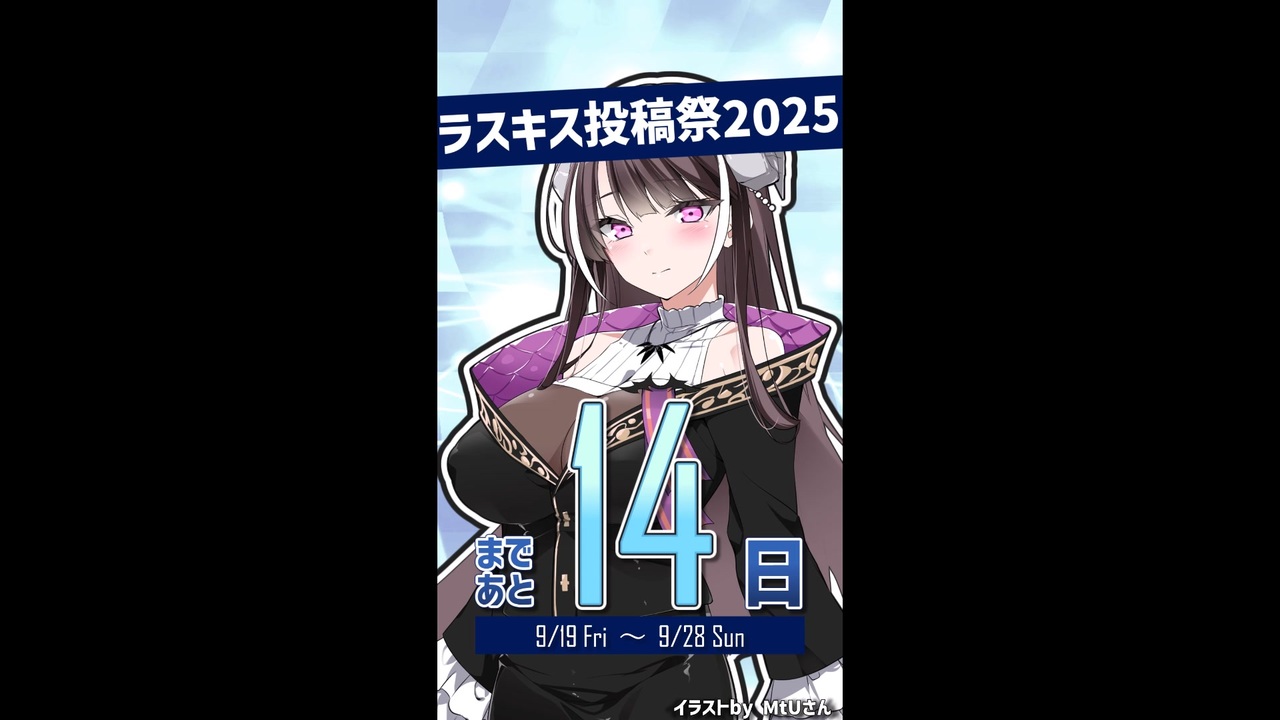 #ラスキス投稿祭2025 までのカウントダウン開始!<br>【9/19】の開催まであと14日だよ💜<br><br>■ラスキス投稿祭2025開催期間<br>2025年9月19日(金)00:00~9月28日(日)23:59<br><br>■投稿祭の詳しい説明はこちら!<br><a href="https://production.lusty-kiss.com/archives/316" target="_blank" rel="noopener nofollow">https://production.lusty-kiss.com/archives/316</a><br><br>■投稿祭に使えるロゴイラスト素材はこちら!<br><a href="https://seiga.nicovideo.jp/seiga/im11642837" target="_blank" rel="noopener nofollow">https://seiga.nicovideo.jp/seiga/im11642837</a><br>※イラスト・ロゴデザイン:サボペン様(@sabti)<br><br>◆アルマちゃん@twitter<br><a href="https://twitter.com/arma_prg" target="_blank" rel="noopener nofollow">https://twitter.com/arma_prg</a><br><br>◆Lusty*Kiss Production 公式サイト<br><a href="https://production.lusty-kiss.com/" target="_blank" rel="noopener nofollow">https://production.lusty-kiss.com/</a><br><br>◆Lusty*Kiss Production YouTubeチャンネル<br><a href="https://www.youtube.com/channel/UCfxvv69Q0j0k2Rvm8x9vEhQ" target="_blank" rel="noopener nofollow">https://www.youtube.com/channel/UCfxvv69Q0j0k2Rvm8x9vEhQ</a><br><br>◆COEIROINK 公式サイト<br><a href="https://coeiroink.com/" target="_blank" rel="noopener nofollow">https://coeiroink.com/</a><br><br>------出演------<br>アンジーさん:アンジーさん@COEIROINK<br><a href="https://coeiroink.com/character/audio-character/andzie-p" target="_blank" rel="noopener nofollow">https://coeiroink.com/character/audio-character/andzie-p</a><br><br>------立ち絵------<br>アンジーさん立ち絵素材(MtU 様)<br><a href="https://seiga.nicovideo.jp/seiga/im11616676" target="_blank" rel="noopener nofollow">https://seiga.nicovideo.jp/seiga/im11616676</a><br><br>------使用素材 ------<br>ディアちゃんの休日<br><a href="https://commons.nicovideo.jp/material/nc266496" target="_blank" rel="noopener nofollow">https://commons.nicovideo.jp/material/nc266496</a>