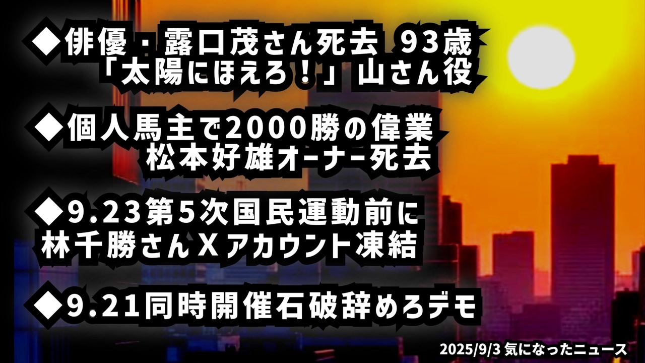 遅くなりました🙏<br><br>◆ 俳優・露口茂さん死去 93歳 「太陽にほえろ!」山さん役◆個人馬主で2000勝の偉業松本好雄オーナー死去◆9.23第5次国民運動前に林千勝さんXアカウント凍結◆9.21同時開催石破辞めろデモ<br><br>あらすじ<br>名優・露口茂さんが93歳で亡くなりました。代表作はドラマ「太陽にほえろ!」の“山さん”役。声優としても「耳をすませば」など多彩な活躍を見せました。2025年は他にも芸能界で著名人の訃報が続き、大きな節目の年となっています。<a href="https://www.asahi.com/articles/AST9200VCT92UCVL02JM.html" target="_blank" rel="noopener nofollow">https://www.asahi.com/articles/AST9200VCT92UCVL02JM.html</a><br><br>また競馬界では「メイショウ」で知られる松本好雄さんが87歳で逝去。<a href="https://topics.smt.docomo.ne.jp/article/dailysports/sports/20250903022" target="_blank" rel="noopener nofollow">https://topics.smt.docomo.ne.jp/article/dailysports/sports/20250903022</a><br>さらに9月には市民による運動やデモも予定され、社会全体が注目する出来事が続いています。<br>①<a href="https://x.com/Coco2Poppin/status/1963249133042405670?t=2we5ZTBPMgm0f02-Z3PMvg&s=19" target="_blank" rel="noopener nofollow">https://x.com/Coco2Poppin/status/1963249133042405670?t=2we5ZTBPMgm0f02-Z3PMvg&s=19</a><br>②<a href="https://x.com/airi_fact_555/status/1962832834982494457?t=hlCCt-g2A9N_6UxJ5G8DFA&s=19" target="_blank" rel="noopener nofollow">https://x.com/airi_fact_555/status/1962832834982494457?t=hlCCt-g2A9N_6UxJ5G8DFA&s=19</a><br><br>◆今回の台本<a href="https://keiichiro8140.hatenablog.com/entry/250904444111" target="_blank" rel="noopener nofollow">https://keiichiro8140.hatenablog.com/entry/250904444111</a><br><br>◆もしも(BAN)の時のためのマイリンク集<a href="https://lit.link/K16_888" target="_blank" rel="noopener nofollow">https://lit.link/K16_888</a><br><br>ご覧いただきありがとうございます<br>m(_ _)m<br>気になったニュース 2025/9/4<br><br />著作権、肖像権に配慮して作成しております。<br><br>◆気になったニュースの台本!?<br>メモ代わりに作った台本をそのままあげてます<br><a href="https://keiichiro8140.hatenablog.com/." target="_blank" rel="noopener nofollow">https://keiichiro8140.hatenablog.com/.</a><br><br><br>ここからはシリーズ紹介<br><br><br>◆ ワクチン解毒・デトックス<br><a href="https://x.gd/fZweg" target="_blank" rel="noopener nofollow">https://x.gd/fZweg</a><br><br>◆ウイリアム・マキス博士のがん治療(イベルメクチン・フェンベンダゾール等)<br><a href="https://x.gd/AtFYS" target="_blank" rel="noopener nofollow">https://x.gd/AtFYS</a><br><br>◆予防接種健康被害救済制度<br><a href="https://x.gd/0xK9x" target="_blank" rel="noopener nofollow">https://x.gd/0xK9x</a><br><br>◆気になったニュース #1501~<br><br>◆ 【ショートver】気になったニュース<br><a href="https://x.gd/7MxXC" target="_blank" rel="noopener nofollow">https://x.gd/7MxXC</a><br><br>◆ 気になったニュース #1001~<br><a href="https://x.gd/Lp8gv" target="_blank" rel="noopener nofollow">https://x.gd/Lp8gv</a><br><br>◆ 気になったニュース #501~<br><a href="https://x.gd/EmbS4" target="_blank" rel="noopener nofollow">https://x.gd/EmbS4</a><br><br>◆ 気になったニュース #1~#500<br><a href="https://x.gd/uPhNb" target="_blank" rel="noopener nofollow">https://x.gd/uPhNb</a><br><br>◆ X(旧Twitter)・テレグラムで気になった情報<br><a href="https://x.gd/YG6FT" target="_blank" rel="noopener nofollow">https://x.gd/YG6FT</a><br><br>◆ 日比谷5万人パレードデ⚪生放送アーカイブ動画<br><a href="https://x.gd/3CHJv" target="_blank" rel="noopener nofollow">https://x.gd/3CHJv</a><br><br>◆日比谷5万人パレード⚪モのマイリスト作ってみました<br><a href="https://nico.ms/mylist/76828848?ref=sp_other" target="_blank" rel="noopener nofollow">https://nico.ms/mylist/76828848?ref=sp_other</a><br><br>◆3.30 令和の百姓⚪⚪<br><a href="https://www.nicovideo.jp/series/511791?ref=garage_share_other" target="_blank" rel="noopener nofollow">https://www.nicovideo.jp/series/511791?ref=garage_share_other</a><br><br>◆ 及川幸久さんの【XNEWS】シリーズ<br><a href="https://x.gd/3k78K" target="_blank" rel="noopener nofollow">https://x.gd/3k78K</a><br><br>◆これまでの動画<a href="https://x.gd/sPXoJ" target="_blank" rel="noopener nofollow">https://x.gd/sPXoJ</a><br><br>◆もしも(BAN)の時のためのマイリンク集<a href="https://lit.link/K-16_News44" target="_blank" rel="noopener nofollow">https://lit.link/K-16_News44</a><br><br>