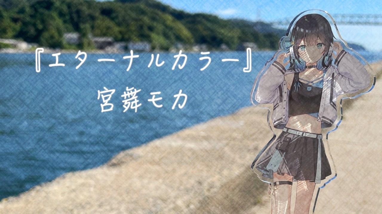 「エターナルカラー」<br>歌:宮舞モカ(SynthesizerV2 AI)<br>作詞・作曲:宮舞モカ、Take-hi(X: <a href="https://twitter.com/takepoo0628" target="_blank" rel="noopener nofollow">https://twitter.com/takepoo0628</a> )<br><br>【歌詞】<br>僕には見えない空があるなら<br>それはどんな色なんだろう<br>誰かに譲れないものがあるなら<br>その色誰にも壊せないよ<br><br>僕には聴こえない音があるなら<br>それはどんな音なんだろう<br>誰にも言えない夢があるから<br>そっと握り締めた<br><br>その声聴かせてよ<br>誰にも秘密にするから<br>この広い世界の中で<br>僕ら出会えたんだ<br>そう、だから<br><br>僕には見えない空があるなら<br>それはどんな色なんだろう<br>誰にも譲れないものは確かに<br>君の世界で響いてるよ<br><br>雨は止まなくて<br>休む事も忘れて<br>走る僕を<br>君は<br>「好き」だと言ってくれた<br><br>いつだって 僕らは一人だ<br>哀しくって 一人で泣いた<br>それでも誰かが 側に居て笑ってくれた<br>いつかの 僕らの未来は<br>色を帯びて 空に浮かんだ<br>その雲を 太陽を<br>僕は守りたいって本気で思うんだ<br><br>僕には見えない空があるなら<br>それはどんな色なんだろう<br>誰かに譲れないものがあるなら<br>その色誰にも壊せないよ<br>