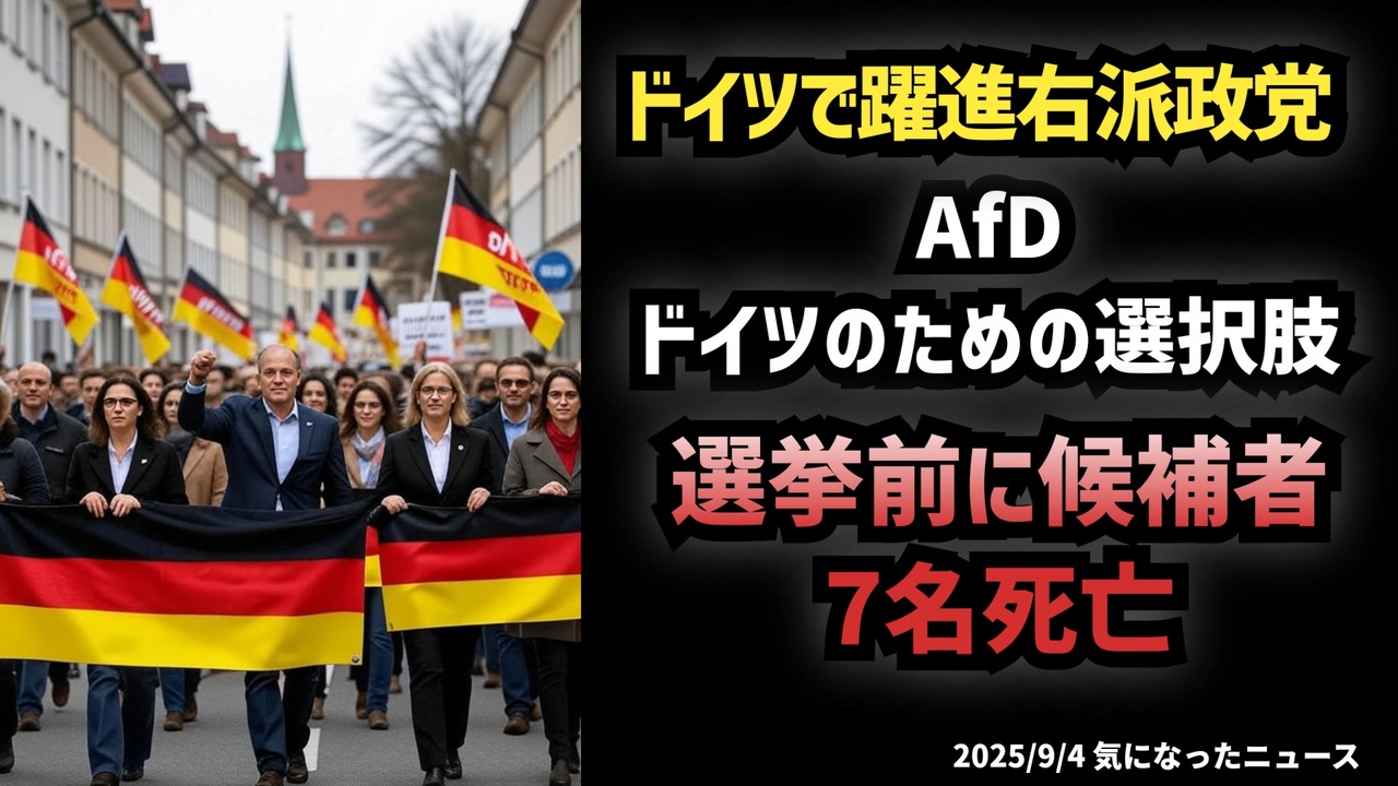 ◆ドイツで躍進中の右派政党『AfD ドイツのための選択肢』 選挙前に候補者 7名死亡<br><br> あらすじ <br>ドイツ最大の工業地帯ノルトライン=ヴェストファーレン州で行われる地方選挙を前に、右派政党AfDの候補者が相次いで死亡しました。現職や補欠を含む6名に加え、長期の病を抱えた候補者1名も亡くなり、合計7名に。警察は不審な点はないと発表していますが、短期間で複数名という異例の事態に社会が揺れています。AfDは反グローバリズムを掲げ支持率を急伸させており、今回の出来事は国内外で大きな注目を集めています。本動画では、選挙準備への影響や国際メディアの報道を整理し、事実ベースで解説します。<a href="https://x.com/oikawa_yukihisa/status/1963403873454100916?t=1m8A8oE4QoYew6r_hn6Dcg&s=19" target="_blank" rel="noopener nofollow">https://x.com/oikawa_yukihisa/status/1963403873454100916?t=1m8A8oE4QoYew6r_hn6Dcg&s=19</a><br><br>◆今回の台本<a href="https://keiichiro8140.hatenablog.com/entry/250904444222" target="_blank" rel="noopener nofollow">https://keiichiro8140.hatenablog.com/entry/250904444222</a><br><br>新チャンネルで再出発! 登録よろしくお願いします┏○)) <a href="https://www.youtube.com/@K16news888" target="_blank" rel="noopener nofollow">https://www.youtube.com/@K16news888</a><br><br>◆もしも(BAN)の時のためのマイリンク集<a href="https://lit.link/K16_888" target="_blank" rel="noopener nofollow">https://lit.link/K16_888</a><br><br>ご覧いただきありがとうございます<br>m(_ _)m<br>気になったニュース 2025/9/4<br><br />著作権、肖像権に配慮して作成しております。<br><br>◆気になったニュースの台本!?<br>メモ代わりに作った台本をそのままあげてます<br><a href="https://keiichiro8140.hatenablog.com/." target="_blank" rel="noopener nofollow">https://keiichiro8140.hatenablog.com/.</a><br><br><br>ここからはシリーズ紹介<br><br><br>◆ ワクチン解毒・デトックス<br><a href="https://x.gd/fZweg" target="_blank" rel="noopener nofollow">https://x.gd/fZweg</a><br><br>◆ウイリアム・マキス博士のがん治療(イベルメクチン・フェンベンダゾール等)<br><a href="https://x.gd/AtFYS" target="_blank" rel="noopener nofollow">https://x.gd/AtFYS</a><br><br>◆予防接種健康被害救済制度<br><a href="https://x.gd/0xK9x" target="_blank" rel="noopener nofollow">https://x.gd/0xK9x</a><br><br>◆気になったニュース #1501~<br><br>◆ 【ショートver】気になったニュース<br><a href="https://x.gd/7MxXC" target="_blank" rel="noopener nofollow">https://x.gd/7MxXC</a><br><br>◆ 気になったニュース #1001~<br><a href="https://x.gd/Lp8gv" target="_blank" rel="noopener nofollow">https://x.gd/Lp8gv</a><br><br>◆ 気になったニュース #501~<br><a href="https://x.gd/EmbS4" target="_blank" rel="noopener nofollow">https://x.gd/EmbS4</a><br><br>◆ 気になったニュース #1~#500<br><a href="https://x.gd/uPhNb" target="_blank" rel="noopener nofollow">https://x.gd/uPhNb</a><br><br>◆ X(旧Twitter)・テレグラムで気になった情報<br><a href="https://x.gd/YG6FT" target="_blank" rel="noopener nofollow">https://x.gd/YG6FT</a><br><br>◆ 日比谷5万人パレードデ⚪生放送アーカイブ動画<br><a href="https://x.gd/3CHJv" target="_blank" rel="noopener nofollow">https://x.gd/3CHJv</a><br><br>◆日比谷5万人パレード⚪モのマイリスト作ってみました<br><a href="https://nico.ms/mylist/76828848?ref=sp_other" target="_blank" rel="noopener nofollow">https://nico.ms/mylist/76828848?ref=sp_other</a><br><br>◆3.30 令和の百姓⚪⚪<br><a href="https://www.nicovideo.jp/series/511791?ref=garage_share_other" target="_blank" rel="noopener nofollow">https://www.nicovideo.jp/series/511791?ref=garage_share_other</a><br><br>◆ 及川幸久さんの【XNEWS】シリーズ<br><a href="https://x.gd/3k78K" target="_blank" rel="noopener nofollow">https://x.gd/3k78K</a><br><br>◆これまでの動画<a href="https://x.gd/sPXoJ" target="_blank" rel="noopener nofollow">https://x.gd/sPXoJ</a><br><br>◆もしも(BAN)の時のためのマイリンク集<a href="https://lit.link/K-16_News44" target="_blank" rel="noopener nofollow">https://lit.link/K-16_News44</a><br><br>