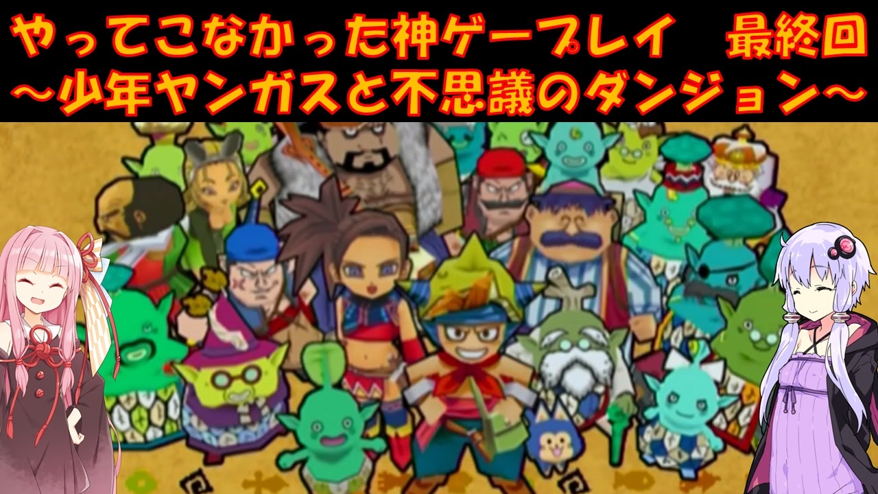 PS2 少年ヤンガスと不思議のダンジョンをプレイ<br>ゆかりさんはメジャーじゃないゲームをやる俺カッケー族だったのでドラクエをやったことがありませんでした(DSのⅤ以外)<br><br>茜:最後のダンジョンはラストにふさわしいボスラッシュやで<br>ゆ:連れてるメンバーもそれなりに頑張って用意しました!<br><br>PART1:<a href="https://www.nicovideo.jp/watch/sm45104666" target="_blank" rel="noopener nofollow">https://www.nicovideo.jp/watch/sm45104666</a><br><br>各DQシリーズ第1回リンク<br>DQ1:<a href="https://www.nicovideo.jp/watch/sm41819145" target="_blank" rel="noopener nofollow">https://www.nicovideo.jp/watch/sm41819145</a><br>DQ2:<a href="https://www.nicovideo.jp/watch/sm41895278" target="_blank" rel="noopener nofollow">https://www.nicovideo.jp/watch/sm41895278</a><br>DQ3:<a href="https://www.nicovideo.jp/watch/sm42034398" target="_blank" rel="noopener nofollow">https://www.nicovideo.jp/watch/sm42034398</a><br>DQ4:<a href="https://www.nicovideo.jp/watch/sm42520974" target="_blank" rel="noopener nofollow">https://www.nicovideo.jp/watch/sm42520974</a><br>DQ5:<a href="https://www.nicovideo.jp/watch/sm42848575" target="_blank" rel="noopener nofollow">https://www.nicovideo.jp/watch/sm42848575</a><br>DQ6:<a href="https://www.nicovideo.jp/watch/sm43080264" target="_blank" rel="noopener nofollow">https://www.nicovideo.jp/watch/sm43080264</a><br>DQ7:<a href="https://www.nicovideo.jp/watch/sm43851863" target="_blank" rel="noopener nofollow">https://www.nicovideo.jp/watch/sm43851863</a><br>DQ8:<a href="https://www.nicovideo.jp/watch/sm44676588" target="_blank" rel="noopener nofollow">https://www.nicovideo.jp/watch/sm44676588</a><br>DQM1:<a href="https://www.nicovideo.jp/watch/sm43525709" target="_blank" rel="noopener nofollow">https://www.nicovideo.jp/watch/sm43525709</a><br>DQMCH:<a href="https://www.nicovideo.jp/watch/sm44443421" target="_blank" rel="noopener nofollow">https://www.nicovideo.jp/watch/sm44443421</a><br><br>動画内で使用させていただいた素材<br>【イラスト】<br>結月ゆかり→ペテン師様:<a href="https://seiga.nicovideo.jp/seiga/im5494168" target="_blank" rel="noopener nofollow">https://seiga.nicovideo.jp/seiga/im5494168</a><br>琴葉茜→ユメのオワリ様:<a href="https://seiga.nicovideo.jp/seiga/im10706241" target="_blank" rel="noopener nofollow">https://seiga.nicovideo.jp/seiga/im10706241</a><br><br>【音声】<br>A.I.Voice:琴葉茜<br><a href="https://aivoice.jp/product/kotonoha/" target="_blank" rel="noopener nofollow">https://aivoice.jp/product/kotonoha/</a><br><br>A.I.Voice:結月ゆかり<br><a href="https://aivoice.jp/product/yukari/" target="_blank" rel="noopener nofollow">https://aivoice.jp/product/yukari/</a><br><br>【その他素材】<br><br>この動画で利用している株式会社スクウェア・エニックスを代表とする共同著作者が権利を所有する著作物及びスギヤマ工房有限会社が権利を所有する楽曲の転載・配布は禁止いたします。<br>© 2006 ARMOR PROJECT/BIRD STUDIO/SQUARE ENIX All Rights Reserved.<br>© SUGIYAMA KOBO