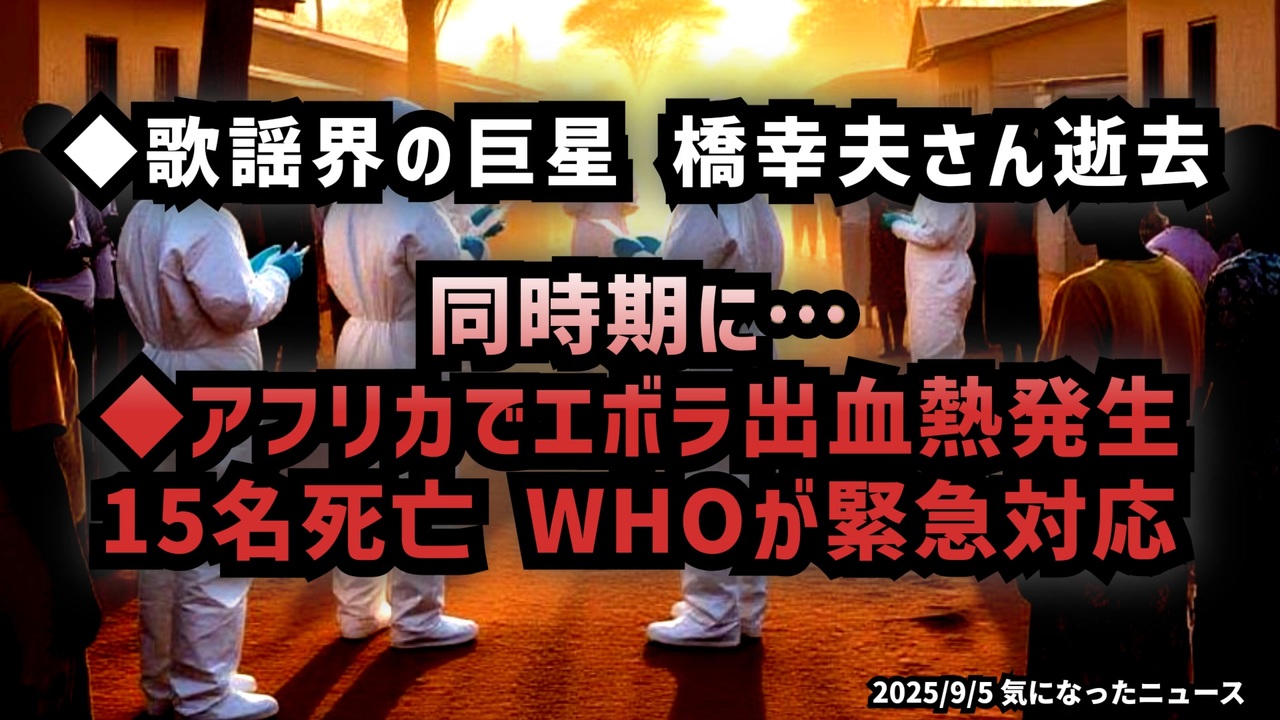 ◆歌謡界の巨星・橋幸夫さん逝去と同時期に…アフリカでエボラ出血熱発生、拡大阻止へWHOが緊急対応<br><br>あらすじ <br>日本歌謡史を代表する歌手、橋幸夫さんが82歳で亡くなりました。「潮来笠」でのデビュー以来、御三家の一人として時代を彩り、多くの名曲を残しました。一方でアフリカ・コンゴ民主共和国では、エボラ出血熱による感染と死亡例が報告され、世界保健機関が緊急チームを派遣しています。SNSでは発生のタイミングや移民政策との関連に注目する声もあり、国際的な感染症の動向と社会の課題が交差しています。今回はその両方のニュースを整理し、冷静にお伝えします。<br><br>◆今回の台本<a href="https://keiichiro8140.hatenablog.com/entry/250905555888999" target="_blank" rel="noopener nofollow">https://keiichiro8140.hatenablog.com/entry/250905555888999</a><br><br>新チャンネルで再出発! 登録よろしくお願いします┏○)) <a href="https://www.youtube.com/@K16news888" target="_blank" rel="noopener nofollow">https://www.youtube.com/@K16news888</a><br><br>◆もしも(BAN)の時のためのマイリンク集<a href="https://lit.link/K16_888" target="_blank" rel="noopener nofollow">https://lit.link/K16_888</a><br><br>ご覧いただきありがとうございました<br>気になったニュース 2025/9/5<br><br />著作権、肖像権に配慮して作成しております。<br><br>◆気になったニュースの台本!?<br>メモ代わりに作った台本をそのままあげてます<br><a href="https://keiichiro8140.hatenablog.com/." target="_blank" rel="noopener nofollow">https://keiichiro8140.hatenablog.com/.</a><br><br><br>ここからはシリーズ紹介<br><br><br>◆ ワクチン解毒・デトックス<br><a href="https://x.gd/fZweg" target="_blank" rel="noopener nofollow">https://x.gd/fZweg</a><br><br>◆ウイリアム・マキス博士のがん治療(イベルメクチン・フェンベンダゾール等)<br><a href="https://x.gd/AtFYS" target="_blank" rel="noopener nofollow">https://x.gd/AtFYS</a><br><br>◆予防接種健康被害救済制度<br><a href="https://x.gd/0xK9x" target="_blank" rel="noopener nofollow">https://x.gd/0xK9x</a><br><br>◆気になったニュース #1501~<br><br>◆ 【ショートver】気になったニュース<br><a href="https://x.gd/7MxXC" target="_blank" rel="noopener nofollow">https://x.gd/7MxXC</a><br><br>◆ 気になったニュース #1001~<br><a href="https://x.gd/Lp8gv" target="_blank" rel="noopener nofollow">https://x.gd/Lp8gv</a><br><br>◆ 気になったニュース #501~<br><a href="https://x.gd/EmbS4" target="_blank" rel="noopener nofollow">https://x.gd/EmbS4</a><br><br>◆ 気になったニュース #1~#500<br><a href="https://x.gd/uPhNb" target="_blank" rel="noopener nofollow">https://x.gd/uPhNb</a><br><br>◆ X(旧Twitter)・テレグラムで気になった情報<br><a href="https://x.gd/YG6FT" target="_blank" rel="noopener nofollow">https://x.gd/YG6FT</a><br><br>◆ 日比谷5万人パレードデ⚪生放送アーカイブ動画<br><a href="https://x.gd/3CHJv" target="_blank" rel="noopener nofollow">https://x.gd/3CHJv</a><br><br>◆日比谷5万人パレード⚪モのマイリスト作ってみました<br><a href="https://nico.ms/mylist/76828848?ref=sp_other" target="_blank" rel="noopener nofollow">https://nico.ms/mylist/76828848?ref=sp_other</a><br><br>◆3.30 令和の百姓⚪⚪<br><a href="https://www.nicovideo.jp/series/511791?ref=garage_share_other" target="_blank" rel="noopener nofollow">https://www.nicovideo.jp/series/511791?ref=garage_share_other</a><br><br>◆ 及川幸久さんの【XNEWS】シリーズ<br><a href="https://x.gd/3k78K" target="_blank" rel="noopener nofollow">https://x.gd/3k78K</a><br><br>◆これまでの動画<a href="https://x.gd/sPXoJ" target="_blank" rel="noopener nofollow">https://x.gd/sPXoJ</a><br><br>◆もしも(BAN)の時のためのマイリンク集<a href="https://lit.link/K-16_News44" target="_blank" rel="noopener nofollow">https://lit.link/K-16_News44</a><br><br>