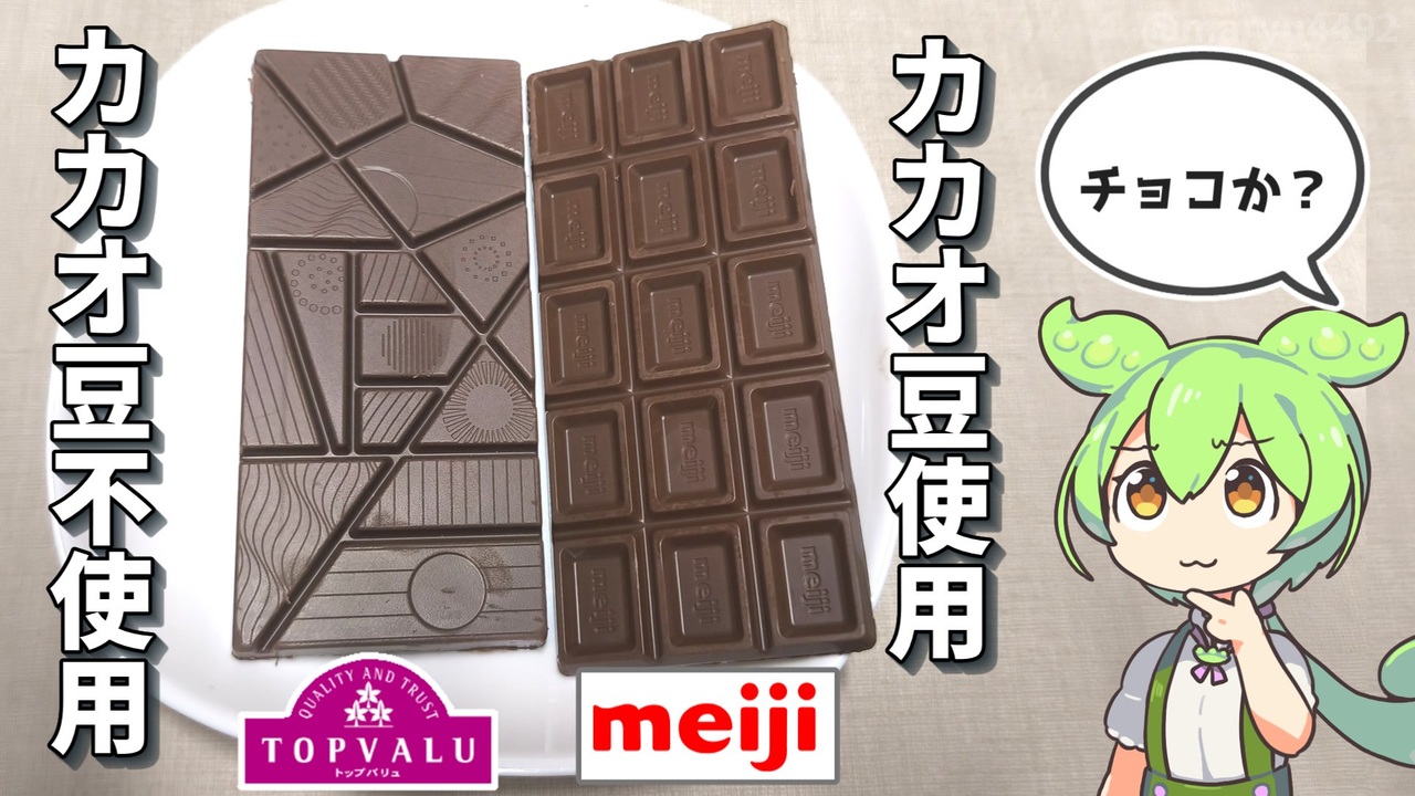 数か月前に、ひまわりの種から作ったチョコレートっぽいものを<br>ビスケットにかけたお菓子を紹介したのですが<br>今回は板チョコになって登場です。<br>輸入国がドイツからポーランドに変わっていましたが<br>どのような味になっているのでしょうか。<br><br><br><br>【関連動画】<br>トップバリュの「ひまわりの種から作ったチョコレートっぽいお菓子(398円)」(2025.06.23)<br><a href="https://www.nicovideo.jp/watch/sm45113297" target="_blank" rel="noopener nofollow">https://www.nicovideo.jp/watch/sm45113297</a><br><br>【参考】<br>チョコか?プレーン※本体価格298円/80g(トップバリュ)<br><a href="https://www.topvalu.net/items/detail/4549414676433/" target="_blank" rel="noopener nofollow">https://www.topvalu.net/items/detail/4549414676433/</a><br>明治ミルクチョコレート 50g(明治)<br><a href="https://www.meiji.co.jp/products/chocolate/04777.html" target="_blank" rel="noopener nofollow">https://www.meiji.co.jp/products/chocolate/04777.html</a><br>「チョコの価格は今後さらに倍に」カカオショックの原因はウイルス!?<br>4億本以上の木が焼き払われる...菓子業界の打開策は?2024.10.18(MBS NEWS)<br><a href="https://www.mbs.jp/news/feature/kansai/article/2024/10/103523.shtml" target="_blank" rel="noopener nofollow">https://www.mbs.jp/news/feature/kansai/article/2024/10/103523.shtml</a><br>バレンタイン、カカオショック・物価高直撃 3人に2人影響 2025.02.06(PR TIMES)<br><a href="https://prtimes.jp/main/html/rd/p/000000253.000036691.html" target="_blank" rel="noopener nofollow">https://prtimes.jp/main/html/rd/p/000000253.000036691.html</a><br>明治ミルクチョコレートの値上げ情報(値上げ権謀六)<br><a href="https://neage.jp/syokuhin/kashi/meiji_milkchoco1.html" target="_blank" rel="noopener nofollow">https://neage.jp/syokuhin/kashi/meiji_milkchoco1.html</a><br><br>【使用した素材】(※敬称略) <br>(合成音声)VOICEVOX/ずんだもん/四国めたん<br><a href="https://voicevox.hiroshiba.jp/" target="_blank" rel="noopener nofollow">https://voicevox.hiroshiba.jp/</a> <br>(立ち絵)坂本アヒル<br> <a href="https://seiga.nicovideo.jp/seiga/im10788496?track" target="_blank" rel="noopener nofollow">https://seiga.nicovideo.jp/seiga/im10788496?track</a><br>(楽曲)甘茶の音楽工房/「楽しい麦畑」「フルーツパフェ」「お城の舞踏会」<br><a href="https://amachamusic.chagasi.com/" target="_blank" rel="noopener nofollow">https://amachamusic.chagasi.com/</a>