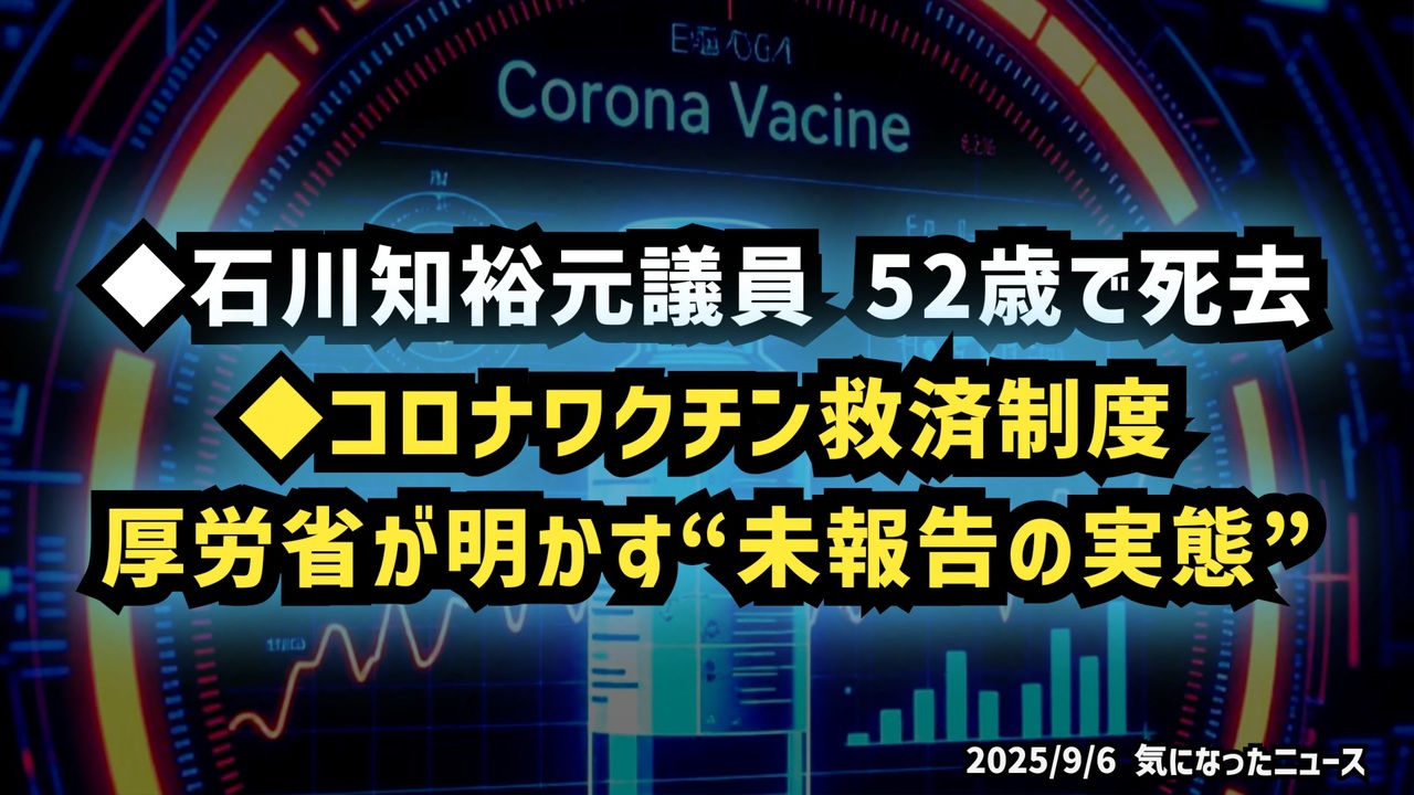 ◆石川知裕元議員 52歳で死去◆コロナワクチン救済制度、厚労省が明かす“未報告の実態”<br><br>あらすじ<br>6日朝、元衆議院議員の石川知裕さんが52歳で亡くなりました。大腸がんステージ4を公表し闘病していましたが、都内の病院で息を引き取りました。<a href="https://www.htb.co.jp/news/archives_33366.html" target="_blank" rel="noopener nofollow">https://www.htb.co.jp/news/archives_33366.html</a><br>厚労省は新型コロナワクチンの健康被害救済制度で、死亡認定1,032人のうち726人が副反応疑い報告未報告だったと公表。<a href="https://x.com/JINKOUZOUKA_jp/status/1964122478042894814?t=F9JKg-xltN1a3_Q0K4S9VA&s=19" target="_blank" rel="noopener nofollow">https://x.com/JINKOUZOUKA_jp/status/1964122478042894814?t=F9JKg-xltN1a3_Q0K4S9VA&s=19</a><br>10月から定期接種を継続する方針も示されました。アメリカCDCが定期接種を終了する中、日本の対応はどう評価されるのか、注目が集まります。<br><br>◆今回の台本<a href="https://keiichiro8140.hatenablog.com/entry/25090666222" target="_blank" rel="noopener nofollow">https://keiichiro8140.hatenablog.com/entry/25090666222</a><br><br>◆もしも(BAN)の時のためのマイリンク集<a href="https://lit.link/K16_888" target="_blank" rel="noopener nofollow">https://lit.link/K16_888</a><br><br>ご覧いただきありがとうございます<br>m(_ _)m<br>気になったニュース 2025/9/6<br><br />著作権、肖像権に配慮して作成しております。<br><br>◆気になったニュースの台本!?<br>メモ代わりに作った台本をそのままあげてます<br><a href="https://keiichiro8140.hatenablog.com/." target="_blank" rel="noopener nofollow">https://keiichiro8140.hatenablog.com/.</a><br><br><br>ここからはシリーズ紹介<br><br><br>◆ ワクチン解毒・デトックス<br><a href="https://x.gd/fZweg" target="_blank" rel="noopener nofollow">https://x.gd/fZweg</a><br><br>◆ウイリアム・マキス博士のがん治療(イベルメクチン・フェンベンダゾール等)<br><a href="https://x.gd/AtFYS" target="_blank" rel="noopener nofollow">https://x.gd/AtFYS</a><br><br>◆予防接種健康被害救済制度<br><a href="https://x.gd/0xK9x" target="_blank" rel="noopener nofollow">https://x.gd/0xK9x</a><br><br>◆気になったニュース #1501~<br><br>◆ 【ショートver】気になったニュース<br><a href="https://x.gd/7MxXC" target="_blank" rel="noopener nofollow">https://x.gd/7MxXC</a><br><br>◆ 気になったニュース #1001~<br><a href="https://x.gd/Lp8gv" target="_blank" rel="noopener nofollow">https://x.gd/Lp8gv</a><br><br>◆ 気になったニュース #501~<br><a href="https://x.gd/EmbS4" target="_blank" rel="noopener nofollow">https://x.gd/EmbS4</a><br><br>◆ 気になったニュース #1~#500<br><a href="https://x.gd/uPhNb" target="_blank" rel="noopener nofollow">https://x.gd/uPhNb</a><br><br>◆ X(旧Twitter)・テレグラムで気になった情報<br><a href="https://x.gd/YG6FT" target="_blank" rel="noopener nofollow">https://x.gd/YG6FT</a><br><br>◆ 日比谷5万人パレードデ⚪生放送アーカイブ動画<br><a href="https://x.gd/3CHJv" target="_blank" rel="noopener nofollow">https://x.gd/3CHJv</a><br><br>◆日比谷5万人パレード⚪モのマイリスト作ってみました<br><a href="https://nico.ms/mylist/76828848?ref=sp_other" target="_blank" rel="noopener nofollow">https://nico.ms/mylist/76828848?ref=sp_other</a><br><br>◆3.30 令和の百姓⚪⚪<br><a href="https://www.nicovideo.jp/series/511791?ref=garage_share_other" target="_blank" rel="noopener nofollow">https://www.nicovideo.jp/series/511791?ref=garage_share_other</a><br><br>◆ 及川幸久さんの【XNEWS】シリーズ<br><a href="https://x.gd/3k78K" target="_blank" rel="noopener nofollow">https://x.gd/3k78K</a><br><br>◆これまでの動画<a href="https://x.gd/sPXoJ" target="_blank" rel="noopener nofollow">https://x.gd/sPXoJ</a><br><br>◆もしも(BAN)の時のためのマイリンク集<a href="https://lit.link/K-16_News44" target="_blank" rel="noopener nofollow">https://lit.link/K-16_News44</a><br><br>