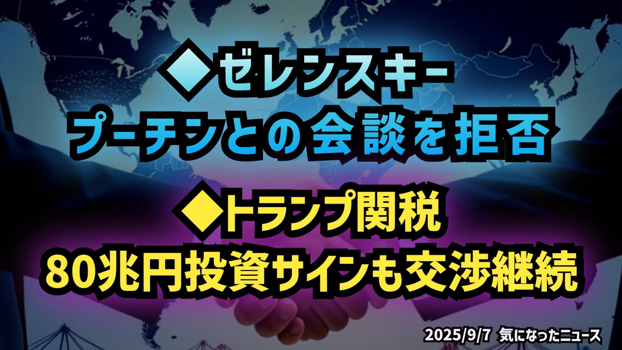 ◆ゼレンスキー、プーチンとの会談を拒否◆トランプ関税80兆円投資サインも交渉継続<br><br>あらすじ<br>ウクライナのゼレンスキー大統領は、ロシアのプーチン大統領が提案したモスクワでの首脳会談を拒否しました。ゼレンスキー氏は首都訪問のリスクや和平提案の信頼性に疑問を示しています。<a href="https://x.com/sate_tv/status/1964468634606338527?t=YDRsHqkxrf7ZqoSibk0b4w&s=19" target="_blank" rel="noopener nofollow">https://x.com/sate_tv/status/1964468634606338527?t=YDRsHqkxrf7ZqoSibk0b4w&s=19</a><br><br>一方、米国ではトランプ大統領が日本からの自動車・部品関税引き下げに署名し、赤澤経済再生相が約80兆円規模の投資・購入を約束。しかし、関税交渉はまだ継続中で、成果は部分的です。<a href="https://x.com/bokuno107257/status/1964466452989431846?t=N5pfKkLym4Uu-zjsfcMJvg&s=19" target="_blank" rel="noopener nofollow">https://x.com/bokuno107257/status/1964466452989431846?t=N5pfKkLym4Uu-zjsfcMJvg&s=19</a><br><br>◆新チャンネルで再出発! 登録よろしくお願いします┏○)) <a href="https://www.youtube.com/@K16news888" target="_blank" rel="noopener nofollow">https://www.youtube.com/@K16news888</a><br><br>◆今回の台本<a href="https://keiichiro8140.hatenablog.com/entry/25090777111" target="_blank" rel="noopener nofollow">https://keiichiro8140.hatenablog.com/entry/25090777111</a><br><br>◆もしも(BAN)の時のためのマイリンク集<a href="https://lit.link/K16_888" target="_blank" rel="noopener nofollow">https://lit.link/K16_888</a><br><br>ご覧いただきありがとうございます<br>m(_ _)m<br>気になったニュース 2025/9/7<br><br />著作権、肖像権に配慮して作成しております。<br><br>◆気になったニュースの台本!?<br>メモ代わりに作った台本をそのままあげてます<br><a href="https://keiichiro8140.hatenablog.com/." target="_blank" rel="noopener nofollow">https://keiichiro8140.hatenablog.com/.</a><br><br><br>ここからはシリーズ紹介<br><br><br>◆ ワクチン解毒・デトックス<br><a href="https://x.gd/fZweg" target="_blank" rel="noopener nofollow">https://x.gd/fZweg</a><br><br>◆ウイリアム・マキス博士のがん治療(イベルメクチン・フェンベンダゾール等)<br><a href="https://x.gd/AtFYS" target="_blank" rel="noopener nofollow">https://x.gd/AtFYS</a><br><br>◆予防接種健康被害救済制度<br><a href="https://x.gd/0xK9x" target="_blank" rel="noopener nofollow">https://x.gd/0xK9x</a><br><br>◆気になったニュース #1501~<br><br>◆ 【ショートver】気になったニュース<br><a href="https://x.gd/7MxXC" target="_blank" rel="noopener nofollow">https://x.gd/7MxXC</a><br><br>◆ 気になったニュース #1001~<br><a href="https://x.gd/Lp8gv" target="_blank" rel="noopener nofollow">https://x.gd/Lp8gv</a><br><br>◆ 気になったニュース #501~<br><a href="https://x.gd/EmbS4" target="_blank" rel="noopener nofollow">https://x.gd/EmbS4</a><br><br>◆ 気になったニュース #1~#500<br><a href="https://x.gd/uPhNb" target="_blank" rel="noopener nofollow">https://x.gd/uPhNb</a><br><br>◆ X(旧Twitter)・テレグラムで気になった情報<br><a href="https://x.gd/YG6FT" target="_blank" rel="noopener nofollow">https://x.gd/YG6FT</a><br><br>◆ 日比谷5万人パレードデ⚪生放送アーカイブ動画<br><a href="https://x.gd/3CHJv" target="_blank" rel="noopener nofollow">https://x.gd/3CHJv</a><br><br>◆日比谷5万人パレード⚪モのマイリスト作ってみました<br><a href="https://nico.ms/mylist/76828848?ref=sp_other" target="_blank" rel="noopener nofollow">https://nico.ms/mylist/76828848?ref=sp_other</a><br><br>◆3.30 令和の百姓⚪⚪<br><a href="https://www.nicovideo.jp/series/511791?ref=garage_share_other" target="_blank" rel="noopener nofollow">https://www.nicovideo.jp/series/511791?ref=garage_share_other</a><br><br>◆ 及川幸久さんの【XNEWS】シリーズ<br><a href="https://x.gd/3k78K" target="_blank" rel="noopener nofollow">https://x.gd/3k78K</a><br><br>◆これまでの動画<a href="https://x.gd/sPXoJ" target="_blank" rel="noopener nofollow">https://x.gd/sPXoJ</a><br><br>◆もしも(BAN)の時のためのマイリンク集<a href="https://lit.link/K-16_News44" target="_blank" rel="noopener nofollow">https://lit.link/K-16_News44</a><br><br>