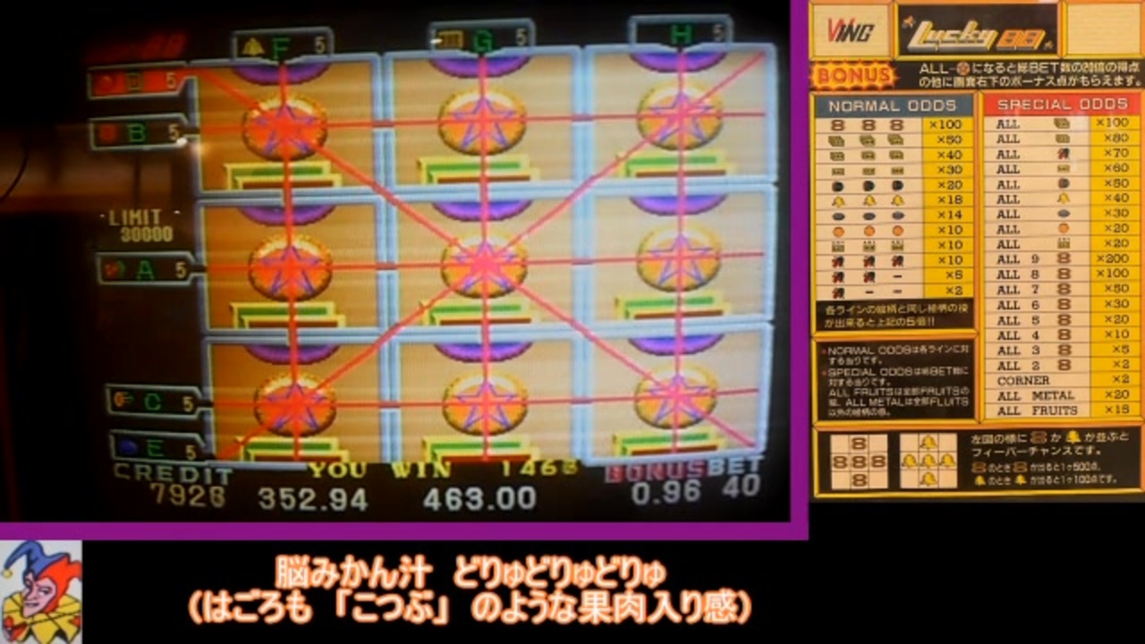 いろいろ(エレメカ)<br>「Lucky 88」<br><br>最近括約筋の衰えを感じていて<br>いつか大惨事が訪れる気しかしない(恐怖)<br><br>前 <a href="https://www.nicovideo.jp/watch/sm45258074" target="_blank" rel="noopener nofollow">https://www.nicovideo.jp/watch/sm45258074</a><br>次 <a href="https://www.nicovideo.jp/watch/sm45453887" target="_blank" rel="noopener nofollow">https://www.nicovideo.jp/watch/sm45453887</a><br><br><br />YouTubeアーカイブ<br><a href="https://www.youtube.com/channel/UCSKcMjzIKtm-7Ky0Vk4GE1Q" target="_blank" rel="noopener nofollow">https://www.youtube.com/channel/UCSKcMjzIKtm-7Ky0Vk4GE1Q</a><br><br>Twitter<br><a href="http://twitter.com/chari_videpo" target="_blank" rel="noopener nofollow">http://twitter.com/chari_videpo</a><br><br>ゆっくりがビデオポーカーをプレイ その1 <a href="https://www.nicovideo.jp/watch/sm29696383" target="_blank" rel="noopener nofollow">https://www.nicovideo.jp/watch/sm29696383</a><br>メダルゲーム探訪① <a href="https://www.nicovideo.jp/watch/sm31391259" target="_blank" rel="noopener nofollow">https://www.nicovideo.jp/watch/sm31391259</a><br>探訪オムニバス① <a href="https://www.nicovideo.jp/watch/sm33158187" target="_blank" rel="noopener nofollow">https://www.nicovideo.jp/watch/sm33158187</a><br>ゲーム探訪フリーダム① <a href="https://www.nicovideo.jp/watch/sm34744231" target="_blank" rel="noopener nofollow">https://www.nicovideo.jp/watch/sm34744231</a><br>週刊メダルゲーム① <a href="https://www.nicovideo.jp/watch/sm36639952" target="_blank" rel="noopener nofollow">https://www.nicovideo.jp/watch/sm36639952</a><br><br>マイリスト <a href="https://www.nicovideo.jp/mylist/67997897" target="_blank" rel="noopener nofollow">https://www.nicovideo.jp/mylist/67997897</a><br>うp主ブログ <a href="https://chari-videpo.hatenablog.com/" target="_blank" rel="noopener nofollow">https://chari-videpo.hatenablog.com/</a>