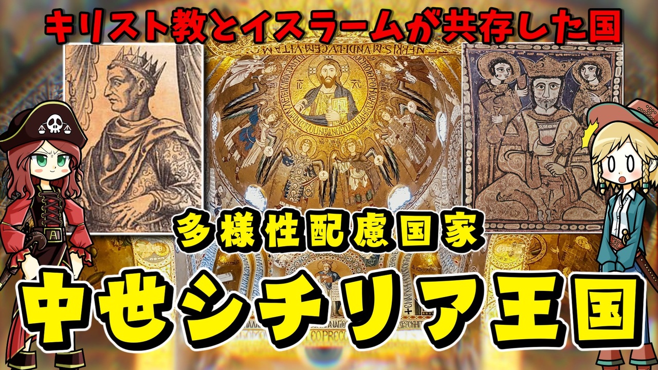 かつて、カトリックとイスラームとギリシア文化が共存する国があった(仲良くとは言ってない)。中世の地中海に存在したシチリア王国である。 <br>西洋史の中でもわりとマイナーな部類に入るような気もするけど、なにげにヨーロッパ全体に大きな影響を与えた国だったりします。 <br>そんなフワッとしか知らないシチリア王国についての話。 <br><br>限定動画ありのニコニコチャンネル『モンド・ヒストリカの離宮』→ <a href="https://ch.nicovideo.jp/mond-historica" target="_blank" rel="noopener nofollow">https://ch.nicovideo.jp/mond-historica</a><br><br>今回の主要参考文献: <br>高山博(1999)『中世シチリア王国』 講談社<br>高山博(2007)『ヨーロッパとイスラーム世界』山川出版社<br>山辺規子(2009)『ノルマン騎士の地中海興亡史』白水社<br>ジャン・ユレ(2013)『シチリアの歴史』幸田礼雅訳 白水社<br>イブン・ジュバイル(2009)『イブン・ジュバイルの旅行記』藤本勝次・池田修監訳 講談社<br><br>その他 Wikipediaなど <br><br>twitter | <a href="https://twitter.com/Yukkuri_mond" target="_blank" rel="noopener nofollow">https://twitter.com/Yukkuri_mond</a><br />━━━━━━━━━━━━━━━━━━━━━<br><br>この動画はクリエイティブ・コモンズ継承(CC-BY-SA)ライセンスの素材を使用して制作しています。(<a href="https://creativecommons.org/licenses/by-sa/4.0/)" target="_blank" rel="noopener nofollow">https://creativecommons.org/licenses/by-sa/4.0/)</a><br>規約に基づき、この動画もCC-BY-SA 4.0 のもとで公開します。<br><br>投稿者共通情報☆彡<br><br>BGM, SE:ニコニ・コモンズ様<br><a href="http://commons.nicovideo.jp/" target="_blank" rel="noopener nofollow">http://commons.nicovideo.jp/</a><br>魔王魂様<br><a href="https://maoudamashii.jokersounds.com/" target="_blank" rel="noopener nofollow">https://maoudamashii.jokersounds.com/</a><br>Audiostock様<br><a href="https://audiostock.jp/" target="_blank" rel="noopener nofollow">https://audiostock.jp/</a><br><br>立ち絵 霊夢・魔理沙(黒子式):nicotalk様<br><a href="http://www.nicotalk.com/charasozai.html" target="_blank" rel="noopener nofollow">http://www.nicotalk.com/charasozai.html</a><br><br>立ち絵 パトラ、マリー、アン、メアリ:ライフライフ様<br><a href="https://0801lifelife.tumblr.com/" target="_blank" rel="noopener nofollow">https://0801lifelife.tumblr.com/</a><br><br>使用ツール1:ゆっくりムービーメーカー4<br><a href="https://manjubox.net/ymm4/" target="_blank" rel="noopener nofollow">https://manjubox.net/ymm4/</a><br><br>使用ツール2:AviUtl<br><a href="http://spring-fragrance.mints.ne.jp/aviutl/" target="_blank" rel="noopener nofollow">http://spring-fragrance.mints.ne.jp/aviutl/</a><br><br>各時代の地図 : World History Maps & Timelines <br><a href="http://geacron.com/home-en/" target="_blank" rel="noopener nofollow">http://geacron.com/home-en/</a><br><br>ゆっくりボイスについて:AquesTalkライセンス取得済み<br><br>キャラクターボイス<br>アン・ボニー:羽ノ華(A.I.VOICE)<br>メアリ・リード:琴葉 葵(A.I.VOICE)<br>クレオパトラ:結月ゆかり(VOICEROID2)<br>マリー‐アントワネット:東北きりたん (VOICEROID EX)<br>その他キャラ:青山龍星(A.I.VOICE)、伊織弓鶴(A.I.VOICE2)、栗田まろん(A.I.VOICE)、宮舞モカ(VOICEPEAK)、フリモメン(VOICEPEAK)<br><br><br><br>その他フリー素材ご提供元の皆様に圧倒的感謝<br>