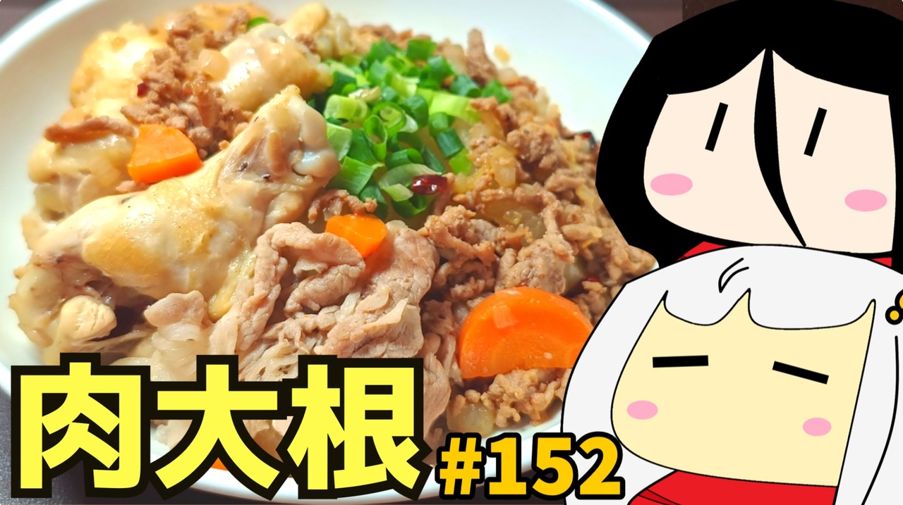 前→<a href="https://www.nicovideo.jp/watch/sm45382282" class="watch">sm45382282</a> (151_じゃがボロネーゼ)<br><br>どうも、私です。<br>手羽元・豚こま・合挽肉と大根で煮物を作って食べるよ~<br>152_肉大根_ゆっくりヘイホー<br>マイリス→<a href="https://www.nicovideo.jp/mylist/63910205" target="_blank" rel="noopener">mylist/63910205</a> (ラーメン食べ歩き日本一周 グルメ 車 その他)<br><br>~~~クレジット~~~<br>ボイスロイド・ソフトウェアトーク<br>VOICEROID2: 紲星あかり<br>VOICEVOX: 中国うさぎ<br><br>YMM4 ゆっくりMovieMaker4<br><a href="https://manjubox.net/ymm4/" target="_blank" rel="noopener nofollow">https://manjubox.net/ymm4/</a><br><br>BGM<br>After-Five<br><a href="https://dova-s.jp/bgm/play22169.html" target="_blank" rel="noopener nofollow">https://dova-s.jp/bgm/play22169.html</a><br>ーーーーーーーーーーーー
