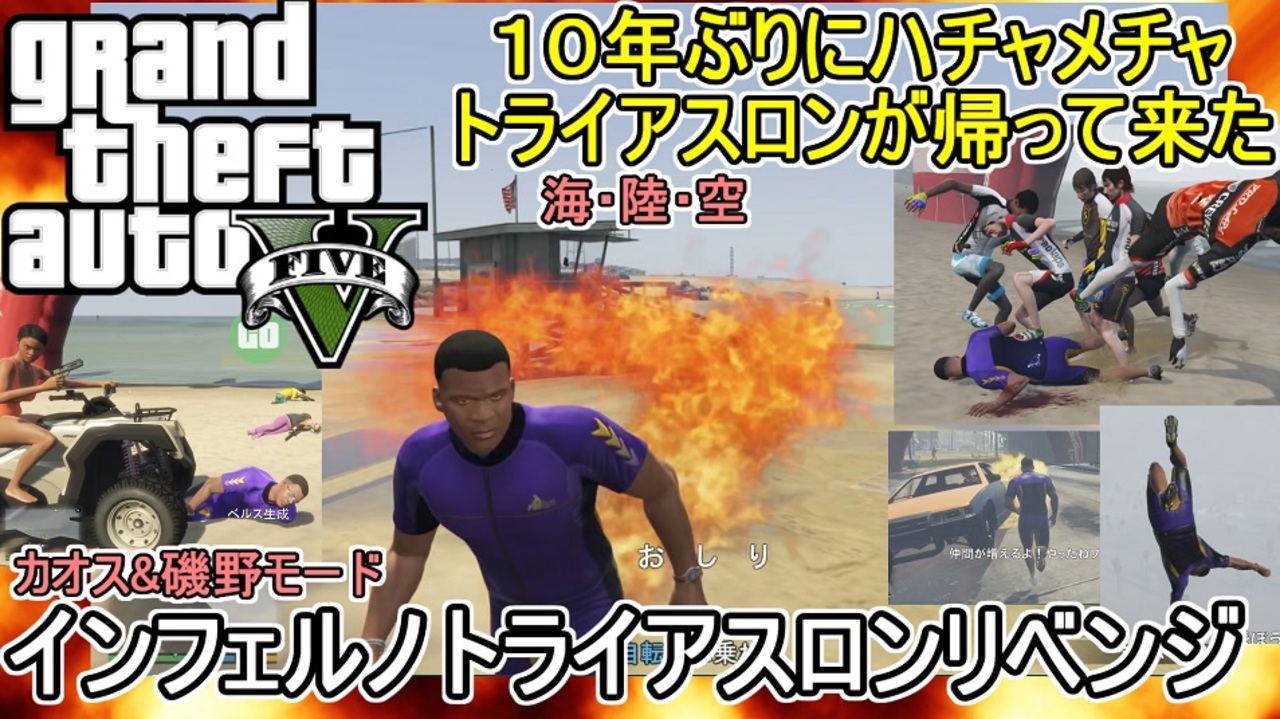 トライアスロンを約10年ぶりにインフェルノ+磯野モードでプレイ<br>10年前( <a href="https://www.nicovideo.jp/watch/sm28657348" class="watch">sm28657348</a> )の時よりさらにカオスコマンドが増えたので<br>さらにカオスなことになったぜ!<br><br>磯野モードは定期的に配信で行っているので興味がある人は遊びに来てね!<br><a href="https://www.nicovideo.jp/user/2620730/live_programs?ref=pc_userpage_menu" target="_blank" rel="noopener nofollow">https://www.nicovideo.jp/user/2620730/live_programs?ref=pc_userpage_menu</a><br><br>超会議2025グッズ通販(pixivBooth)<br><a href="https://nagio-gta25252.booth.pm/" target="_blank" rel="noopener nofollow">https://nagio-gta25252.booth.pm/</a><br><br>凪尾マイクラ等サーバー参加方法<br>ニコニコ凪尾チャンネル・クリエイターサポート加入者・NicoFTパス所持者 YouTubeメンバーシップゴールド以上の方々が参加できます! 分からないことがあったら気軽に質問してください!<br>ニコニコチャンネル<br><a href="https://ch.nicovideo.jp/nagio-gta?ref=pc_mypage_top" target="_blank" rel="noopener nofollow">https://ch.nicovideo.jp/nagio-gta?ref=pc_mypage_top</a><br>クリエイターサポート<br><a href="https://creator-support.nicovideo.jp/registration/2620730" target="_blank" rel="noopener nofollow">https://creator-support.nicovideo.jp/registration/2620730</a><br><br>YouTube高画質版:<a href="https://youtu.be/WCz2dxkNlhU" target="_blank" rel="noopener nofollow">https://youtu.be/WCz2dxkNlhU</a><br>Twitter::<a href="https://twitter.com/naoreisen" target="_blank" rel="noopener nofollow">https://twitter.com/naoreisen</a><br><br>次回 第二回ふにんがすガンダムファイブボンバーPart1:<a href="https://www.nicovideo.jp/watch/sm45399922" class="watch">sm45399922</a><br><br>前回 ふにんがす:筋肉VS化け狸編:<a href="https://www.nicovideo.jp/watch/sm45383884" class="watch">sm45383884</a><br>前回 ガンダムファイブボンバーPart3:<a href="https://www.nicovideo.jp/watch/sm45364582" class="watch">sm45364582</a><br>前回 GTA5:カオス磯野モード:地獄研究所前編:<a href="https://www.nicovideo.jp/watch/sm45316442" class="watch">sm45316442</a><br>前回 ふにんがすR.E.P.O.:破壊神もち子編:<a href="https://www.nicovideo.jp/watch/sm45236397" class="watch">sm45236397</a><br>前回 パーティアニマルズ:イタズラ妨害狸編:<a href="https://www.nicovideo.jp/watch/sm45113701" class="watch">sm45113701</a><br>前回 GTA5手配度MAX:ガンダムジークアクス編:<a href="https://www.nicovideo.jp/watch/sm44705857" class="watch">sm44705857</a><br>前回 凪尾クラフト:トライアルチャンバー編:<a href="https://www.nicovideo.jp/watch/sm44573824" class="watch">sm44573824</a><br>前回 猫ミームブラック企業動画:<a href="https://www.nicovideo.jp/watch/sm43364794" class="watch">sm43364794</a><br>前回 GTA動画:KICK BACK PV再現:<a href="https://www.nicovideo.jp/watch/sm41527305" class="watch">sm41527305</a><br><br>ふにんがす動画マイリスト <a href="https://www.nicovideo.jp/mylist/71314393" target="_blank" rel="noopener">mylist/71314393</a><br>GTA5手配度MAXシリーズ <a href="https://www.nicovideo.jp/mylist/18374381" target="_blank" rel="noopener">mylist/18374381</a><br>