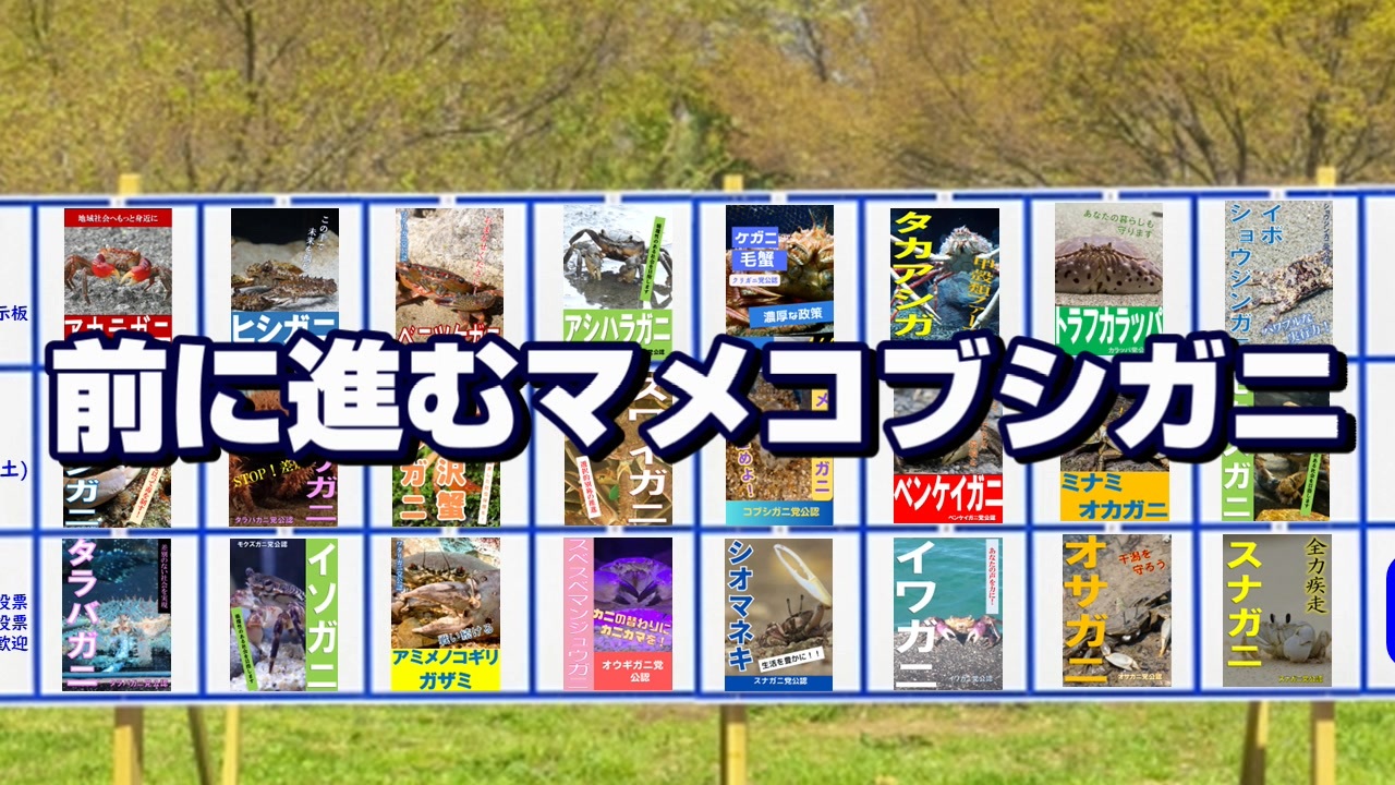 動物ソング投稿祭2025主催のunuiです<br>3回目となりました動物ソング投稿祭を今年も開催させていただきます<br>他の参加作もよろしくお願いします<br><br>生物シリーズ第80弾となる今作はマメコブシガニがテーマ<br>横歩きが多いカニには珍しく前に向かって進むそうです<br>そっから妄想を広げて<br>カニの国会議員が<br>「対決より解決」「右でも左でもなく前へ」<br>って感じで右往左往する議論を前に進める歌にしてみました<br><br>【テーマ:物語】<br><br>作詞・曲:unui( <a href="https://x.com/unui" target="_blank" rel="noopener nofollow">https://x.com/unui</a> )<br>アレンジ:tatmos( <a href="https://x.com/tatmos" target="_blank" rel="noopener nofollow">https://x.com/tatmos</a> )<br>歌:重音テト<br><br><br>【写真】<br>photoACさん( <a href="https://www.photo-ac.com/main" target="_blank" rel="noopener nofollow">https://www.photo-ac.com/main</a> )から<br>良さげなカニの写真をピックアップして<br>カニの選挙ポスターを作らせていただきました<br><br><br><br>今年から10月4日は動物ソングの日と公認されましたので<br>そちらも一緒に盛り上げていきましょう<br><br><br><歌詞><br>右へずっと歩き続けても<br>現状の枠を出られない<br><br>前へと前へと前へと進めよ<br>前へと前へと前へと進めよ<br><br>左へずっと歩き続けても<br>理想郷にはたどり着けない<br><br>前へと前へと前へと進めよ<br>前へと前へと前へと進めよ<br><br>マメコブシガニはそれらを踏まえて<br>生き方を決めたのかな<br>妄想してみよう<br><br>多数決ですべて決まる<br>民主主義に則ったら<br>カニは横に歩く案が可決<br>多様性を謳うならば<br>前へならえじゃダメでしょう<br>マメコブシガニは対案示す<br><br>話し合いを前に進めてゆくカニ<br><br>右往左往ばかりしていたら<br>時間ばっか浪費していくよ<br><br>前へと前へと前へと進めよ<br>前へと前へと前へと進めよ<br><br>横に歩くカニは受け継がれたもの<br>大切にしたいのかな<br>妄想してみよう<br><br>横に歩くということが<br>カニのアイデンティティでしょ<br>保守派のカニがこぶし振り上げる<br>少数派を反故にしたら<br>民主主義は崩壊する<br>マメコブシガニは主張を語る<br><br>白熱の議論の行く末はいかに<br><br>対立ばかりしていたら<br>何も解決しないでしょ<br>世論が徐々に形成されてく<br>例え違う方へ進んでも<br>同じ方は見ていけるでしょ<br>マメコブシガニはゆっくり前に進む<br><br>いつか当たり前に<br>笑い合えるまでに<br>前に前に前に進んでゆくカニ