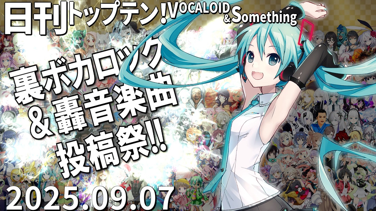 前日(9/6)←<a href="https://www.nicovideo.jp/watch/sm45388463" class="watch">sm45388463</a> <a href="https://www.nicovideo.jp/watch/sm45394513" class="watch">sm45394513</a>→翌日(9/8)<br>★各エンディングをXでまとめて確認できます!<a href="https://tinyurl.com/4pz498rk" target="_blank" rel="noopener nofollow">https://tinyurl.com/4pz498rk</a><br>【お詫び】10年前のピックアップの日付がずれています。本来の9/7の作品は前号で紹介してしまいました。<br><br>★トップテン<br>10:<a href="https://www.nicovideo.jp/watch/sm45369680" class="watch">sm45369680</a> 9:<a href="https://www.nicovideo.jp/watch/sm45377150" class="watch">sm45377150</a> 8:<a href="https://www.nicovideo.jp/watch/sm45374571" class="watch">sm45374571</a> 7:<a href="https://www.nicovideo.jp/watch/sm45371103" class="watch">sm45371103</a> <br>6:<a href="https://www.nicovideo.jp/watch/sm45368040" class="watch">sm45368040</a> 5:<a href="https://www.nicovideo.jp/watch/sm45369648" class="watch">sm45369648</a> 4:<a href="https://www.nicovideo.jp/watch/sm45359764" class="watch">sm45359764</a> 3:<a href="https://www.nicovideo.jp/watch/sm45372932" class="watch">sm45372932</a> 2:<a href="https://www.nicovideo.jp/watch/sm45371919" class="watch">sm45371919</a> 1:<a href="https://www.nicovideo.jp/watch/sm45365091" class="watch">sm45365091</a> <br><br>★ピックアップ(B~あは超新着枠)<br>B:<a href="https://www.nicovideo.jp/watch/sm45374407" class="watch">sm45374407</a> C:<a href="https://www.nicovideo.jp/watch/sm45367367" class="watch">sm45367367</a> D:<a href="https://www.nicovideo.jp/watch/sm45374606" class="watch">sm45374606</a> E:<a href="https://www.nicovideo.jp/watch/sm45374451" class="watch">sm45374451</a> F:<a href="https://www.nicovideo.jp/watch/sm45372100" class="watch">sm45372100</a> G:<a href="https://www.nicovideo.jp/watch/sm45372907" class="watch">sm45372907</a> <br>H:<a href="https://www.nicovideo.jp/watch/sm45373391" class="watch">sm45373391</a> I:<a href="https://www.nicovideo.jp/watch/sm45374325" class="watch">sm45374325</a> J:<a href="https://www.nicovideo.jp/watch/sm45374588" class="watch">sm45374588</a> K:<a href="https://www.nicovideo.jp/watch/sm45373413" class="watch">sm45373413</a> L:<a href="https://www.nicovideo.jp/watch/sm45270754" class="watch">sm45270754</a> M:<a href="https://www.nicovideo.jp/watch/sm45365152" class="watch">sm45365152</a> <br>N:<a href="https://www.nicovideo.jp/watch/sm45341858" class="watch">sm45341858</a> O:<a href="https://www.nicovideo.jp/watch/sm45358351" class="watch">sm45358351</a> P:<a href="https://www.nicovideo.jp/watch/sm45371505" class="watch">sm45371505</a> Q:<a href="https://www.nicovideo.jp/watch/sm45373683" class="watch">sm45373683</a> R:<a href="https://www.nicovideo.jp/watch/sm45356361" class="watch">sm45356361</a> S:<a href="https://www.nicovideo.jp/watch/sm45371633" class="watch">sm45371633</a> <br>T:<a href="https://www.nicovideo.jp/watch/sm45371216" class="watch">sm45371216</a> U:<a href="https://www.nicovideo.jp/watch/sm45370574" class="watch">sm45370574</a> V:<a href="https://www.nicovideo.jp/watch/sm45374245" class="watch">sm45374245</a> W:<a href="https://www.nicovideo.jp/watch/sm45374190" class="watch">sm45374190</a> X:<a href="https://www.nicovideo.jp/watch/sm45367912" class="watch">sm45367912</a> Y:<a href="https://www.nicovideo.jp/watch/sm45366060" class="watch">sm45366060</a> <br>Z:<a href="https://www.nicovideo.jp/watch/sm45323052" class="watch">sm45323052</a> あ:<a href="https://www.nicovideo.jp/watch/sm45377069" class="watch">sm45377069</a> い:<a href="https://www.nicovideo.jp/watch/sm45299423" class="watch">sm45299423</a> う:<a href="https://www.nicovideo.jp/watch/sm45354638" class="watch">sm45354638</a> え:<a href="https://www.nicovideo.jp/watch/sm45357509" class="watch">sm45357509</a> お:<a href="https://www.nicovideo.jp/watch/sm45357860" class="watch">sm45357860</a> <br><br>★プレイバック <br>A(1年前):<a href="https://www.nicovideo.jp/watch/sm44077556" class="watch">sm44077556</a> 十(10年前):<a href="https://www.nicovideo.jp/watch/sm27113849" class="watch">sm27113849</a> 前日の第1位: <a href="https://www.nicovideo.jp/watch/sm45353732" class="watch">sm45353732</a>(初音ミク)<br><br>☆集計対象:2025/8/31~9/7 5時投稿の作品(9/7 5時集計)<br>★計算式:再生×1+コメント×最大12+いいね!×12+マイリスト×8<br>☆プレイリスト:<u><a href="https://nikkantop10.hatenablog.com/entry/ar20250907" target="_blank" rel="noopener nofollow">https://nikkantop10.hatenablog.com/entry/ar20250907</a></u> 、 <a href="https://www.nicovideo.jp/mylist/49271984" target="_blank" rel="noopener">mylist/49271984</a> <br>★1年前トップテン:<a href="https://www.nicovideo.jp/watch/sm44076251" class="watch">sm44076251</a><br />★日刊トップテン動画一覧マイリスト:<a href="https://www.nicovideo.jp/mylist/47849908" target="_blank" rel="noopener">mylist/47849908</a><br>☆ルールや計算式の詳細:<a href="https://nikkantop10-sub.hatenablog.com/entry/top10_rule" target="_blank" rel="noopener nofollow">https://nikkantop10-sub.hatenablog.com/entry/top10_rule</a><br><span style="color: #262626;">★K!!te Playlist LINK!:<a href="https://kiite.jp/user/AIST_playlist_bot" target="_blank" rel="noopener nofollow">https://kiite.jp/user/AIST_playlist_bot</a><br>☆Twitter:<a href="https://twitter.com/VOCALO_NEWRANK" target="_blank" rel="noopener nofollow">https://twitter.com/VOCALO_NEWRANK</a><br>★Thread:<a href="https://www.threads.net/@lukanan_p" target="_blank" rel="noopener nofollow">https://www.threads.net/@lukanan_p</a></span><br><br><span style="color: #0000ff;"><strong>◆今後の動画投稿イベント情報</strong></span><br>2025/12/29~31 <strong>先端映像音楽表現投稿祭</strong> <a href="https://twipla.jp/events/678401" target="_blank" rel="noopener nofollow">https://twipla.jp/events/678401</a><br>2026/1/1~4 <strong>ボカ