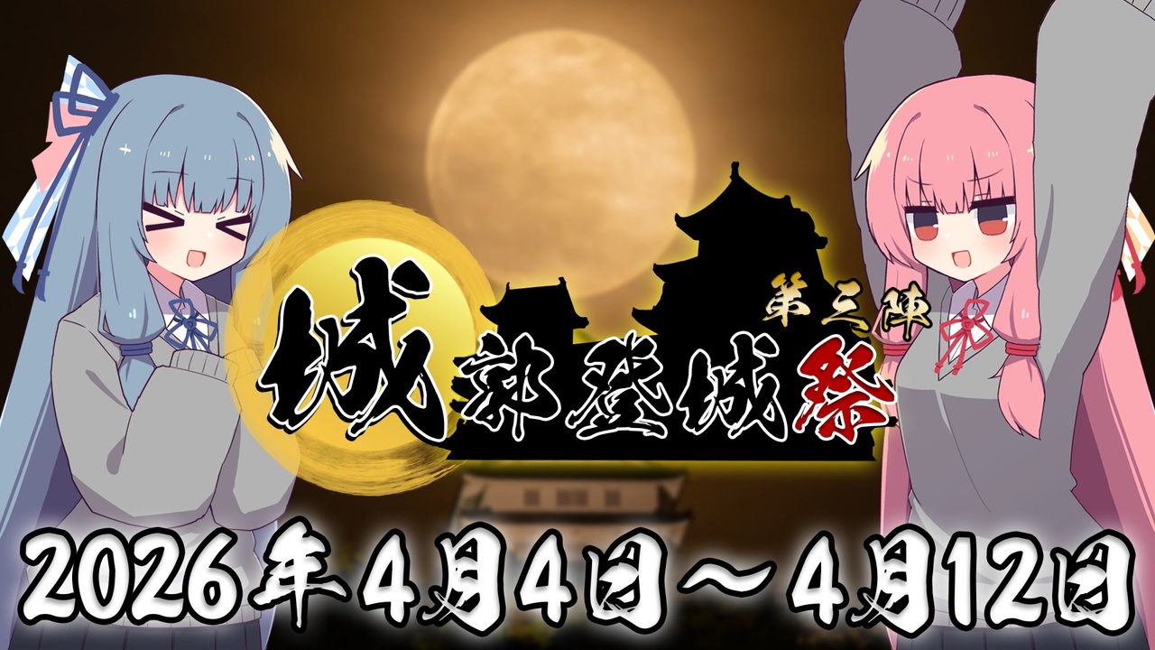 <span style="color: #cc0000; font-size: 18px;"><strong>三度目の城郭登城祭!やるぞー!</strong></span><br><br>◆開催期間<br>2026年4月4日(土) 0:00 ~ 4月12日(日) 23:59<br><br>◆レギュレーション<br>・国内・海外問わずお城巡りの動画であること。<br>・訪れたお城の(簡単な)解説要素を入れる 。<br>・ソフトウェアトーク(歌唱ソフト、ボイチェンソフト可)を使用すること。<br>・訪れたお城の名前と県名(海外であれば国名)を、動画説明欄に記載。(強制ではありません)<br><br>詳細は動画をご確認ください!<br><br>旅行祭としてゆる~い感じを想定してるので、お城が分からなくてもお気軽にご参加ください!<br>被りは気にせず、主催の動画や、前回の祭り動画の追走でも大歓迎です!<br><br><span style="color: #ff0000;"><strong>・注意事項追記:</strong></span><br>※けが等、万が一問題が発生した場合、責任は取れませんのでご了承お願いします。<br><br>◆ロゴ<br><a href="https://commons.nicovideo.jp/works/nc434898" target="_blank" rel="noopener">nc434898</a><br><br>◆100名城 &続100名城 (+α)にピン立てしたmap<br><a href="https://www.google.com/maps/d/u/0/edit?mid=1L0SWHUF2rpWhJdyoA_kQl79OsaZHxbM" target="_blank" rel="noopener nofollow">https://www.google.com/maps/d/u/0/edit?mid=1L0SWHUF2rpWhJdyoA_kQl79OsaZHxbM</a><br><br>◆過去の城郭登城祭で皆様が訪れたお城にピン立てしたmap<br><a href="https://www.google.com/maps/d/u/0/edit?hl=ja&mid=11Z4iiQtLYONHhcd8TkORFJ45pRhXQAw&ll" target="_blank" rel="noopener nofollow">https://www.google.com/maps/d/u/0/edit?hl=ja&mid=11Z4iiQtLYONHhcd8TkORFJ45pRhXQAw&ll</a><br><br>◆質問返答<br>・地名の情報は多い方がいい?→県・国別の数を集計したいだけなので県・国名だけで大丈夫です<br>・トーチカは?→個人的には無しです...。でも同じく個人的に無しな洋式要塞に対馬要塞を例として挙げてしまっているのでガバガバ感ありますね...。もし今後があれば近代戦争遺構を覗くなど基準を改めようと思います。ごめんなさい。<br><br>◆タイムスタンプ<br>開催期間 <a href="#" class="seekTime" data-seekTime="0:52" onclick="seekNicoPlayer('#0:52'); return false;">#0:52</a><br>開催の目的 <a href="#" class="seekTime" data-seekTime="1:26" onclick="seekNicoPlayer('#1:26'); return false;">#1:26</a><br>参加方法 <a href="#" class="seekTime" data-seekTime="1:47" onclick="seekNicoPlayer('#1:47'); return false;">#1:47</a><br>レギュレーション: <a href="#" class="seekTime" data-seekTime="2:18" onclick="seekNicoPlayer('#2:18'); return false;">#2:18</a><br>お城の定義 <a href="#" class="seekTime" data-seekTime="4:48" onclick="seekNicoPlayer('#4:48'); return false;">#4:48</a><br>注意事項 <a href="#" class="seekTime" data-seekTime="6:32" onclick="seekNicoPlayer('#6:32'); return false;">#6:32</a><br>その他の内容 <a href="#" class="seekTime" data-seekTime="7:08" onclick="seekNicoPlayer('#7:08'); return false;">#7:08</a><br>ロゴ <a href="#" class="seekTime" data-seekTime="7:35" onclick="seekNicoPlayer('#7:35'); return false;">#7:35</a><br>サポート <a href="#" class="seekTime" data-seekTime="8:45" onclick="seekNicoPlayer('#8:45'); return false;">#8:45</a><br>