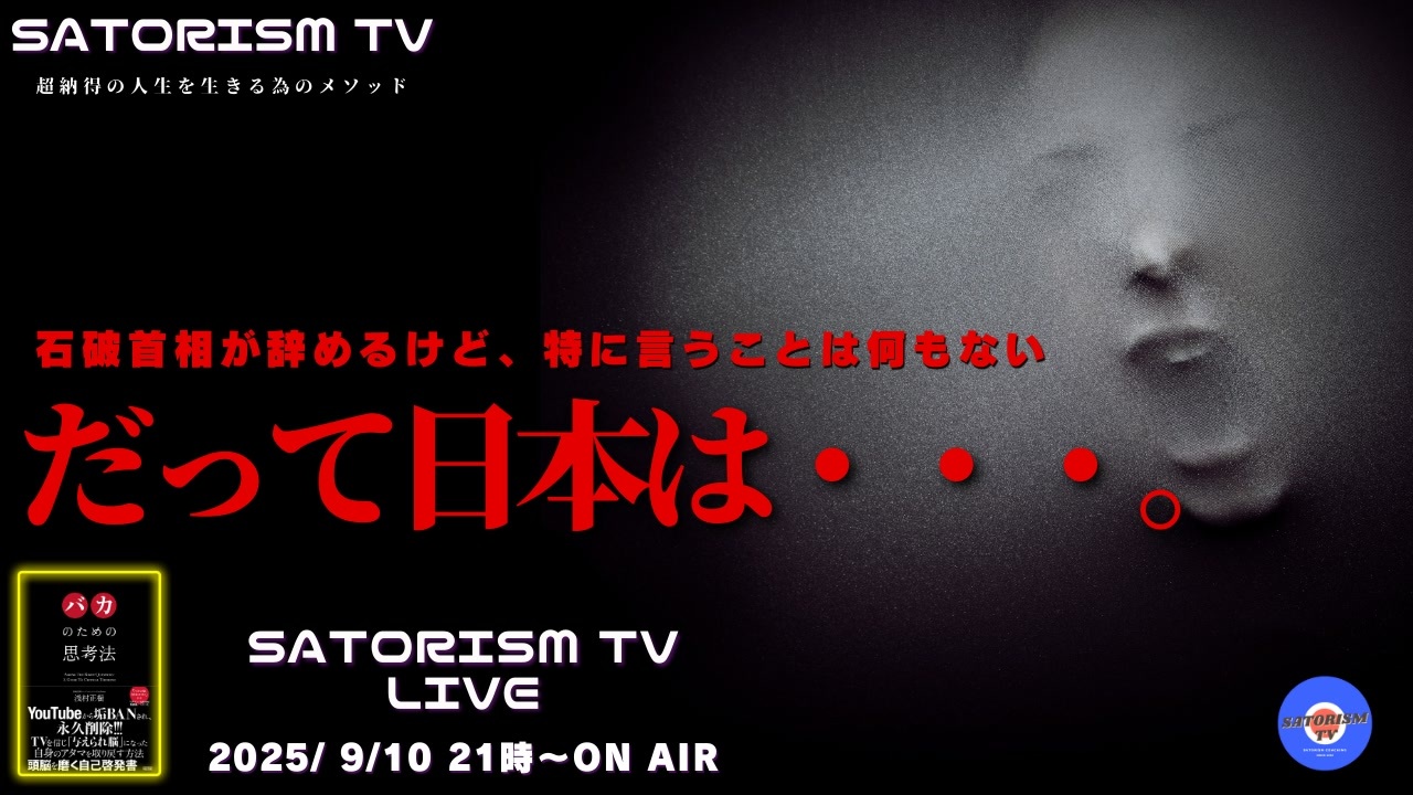 ■有料会員制 動画チャンネル「SATORISM GOLDEN TV」<br>特別動画配信中!<br>入会はコチラ <a href="https://nicochannel.jp/satorism-premium/welcome" target="_blank" rel="noopener nofollow">https://nicochannel.jp/satorism-premium/welcome</a><br><br>■有料会員様でログインできない等の不具合がある会員様へ<br>ドワンゴ苦情窓口はコチラ <a href="https://help.nicochannel.jp/hc/ja/requests/new?ticket_form_id=4414714831513" target="_blank" rel="noopener nofollow">https://help.nicochannel.jp/hc/ja/requests/new?ticket_form_id=4414714831513</a><br><br>■ANGLE磁気ネックレス 公式オンラインショップ<br><a href="https://c.affitch.com/?ref=PM9XTQJ6QGME" target="_blank" rel="noopener nofollow">https://c.affitch.com/?ref=PM9XTQJ6QGME</a><br><br>■ロックバンドClaps!情報<br><br>■イベント情報<br>NEW!!2025年10月16日(木) WEBセミナー さくらインベスト主催「国家の戦争とあなたの副業」 参加費無料! 参加ご予約 <a href="https://seminar2.sakura-inv.com/yt/" target="_blank" rel="noopener nofollow">https://seminar2.sakura-inv.com/yt/</a><br><br>NEW!!2025年10月18日(土) サンワード証券主催 「戦争とカネ」in浜松市 初静岡! 参加費無料!<br>参加ご予約 <a href="https://www.sunward-t.co.jp/seminar/2025/10/18_3/index_k.html" target="_blank" rel="noopener nofollow">https://www.sunward-t.co.jp/seminar/2025/10/18_3/index_k.html</a><br><br>2025年9月14日 雷神サトリズムBBQ&LIVE in岡山<br>チケット予約はコチラ <a href="https://peatix.com/event/4512858" target="_blank" rel="noopener nofollow">https://peatix.com/event/4512858</a><br><br>2025年9月28日(日)サトリズム歴史考察「広島長崎の9.11」in名古屋<br>チケット予約はコチラ <a href="https://satorism0928nagoya.peatix.com" target="_blank" rel="noopener nofollow">https://satorism0928nagoya.peatix.com</a><br>※合法アドレノクロム会員の方も予約だけで行ってください。<br><br>2025年9月23日(祝) 「博士とサトリズムの近未来講座with坪内先生」in東京<br>チケット予約はコチラ <a href="https://seminar20250923.peatix.com/" target="_blank" rel="noopener nofollow">https://seminar20250923.peatix.com/</a><br>懇親会予約はコチラ <a href="https://party20250923.peatix.com/" target="_blank" rel="noopener nofollow">https://party20250923.peatix.com/</a><br><br>■合法アドレノクロム説明会をご希望の方 <a href="https://satorism-tv.com/home/contact/" target="_blank" rel="noopener nofollow">https://satorism-tv.com/home/contact/</a>