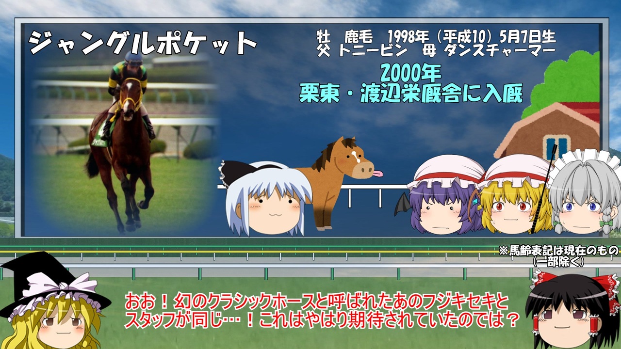 /前作<a href="https://www.nicovideo.jp/watch/sm45250366" class="watch">sm45250366</a> 次 牝馬シリーズマイリス<a href="https://www.nicovideo.jp/mylist/65869255" target="_blank" rel="noopener">mylist/65869255</a> 競馬解説マイリス<a href="https://www.nicovideo.jp/mylist/64207040" target="_blank" rel="noopener">mylist/64207040</a> <br><br>つべ<a href="https://youtu.be/s5ymb6TXIzQ" target="_blank" rel="noopener nofollow">https://youtu.be/s5ymb6TXIzQ</a><br><br>名馬解説第54弾、府中の申し子ジャングルポケットです!<br>個性豊かな2001年クラシック世代を代表する野生児!<br><br>BGM:甘茶の音楽工房様<br>画像提供元:TURF☆DUST 様(もがみますみ様)うまぽっと様 いらすとや様 きつねゆっくり様 ニコニコモンズ様<br>参考HP:優駿達の蹄跡様 Wikipedia JBISサーチ ピクシブ百科事典 ニコニコ大百科 JRA<br>