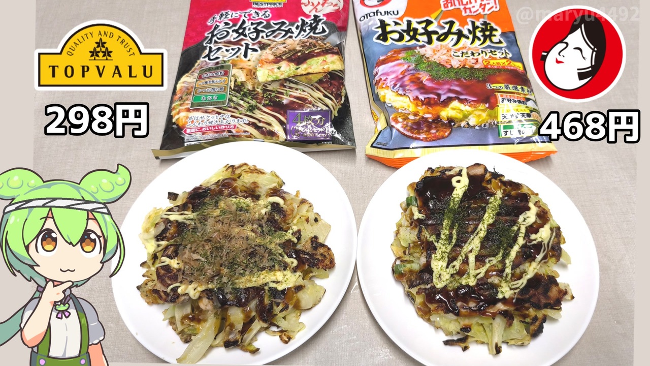 トップバリュ(298円)とオタフクソース(468円)のお好み焼きセットがあるのですが<br>値段は約170円違います。<br>何がどう違うのかを食べ比べて調べていきます。<br><br><br>【関連動画】<br>激安スーパー、ラ・ムーの「ホットドック マスタード(100円)」2025.09.09<br><a href="https://www.nicovideo.jp/watch/sm45383010" target="_blank" rel="noopener nofollow">https://www.nicovideo.jp/watch/sm45383010</a><br>ラ・ムーの「クロワッサンサンド3種(各100円)」2025.04.30<br><a href="https://www.nicovideo.jp/watch/sm44923306" target="_blank" rel="noopener nofollow">https://www.nicovideo.jp/watch/sm44923306</a><br>ラ・ムーの「焼きそばパンとポテトサラダパン」2024.06.04<br><a href="https://www.nicovideo.jp/watch/sm43872291" target="_blank" rel="noopener nofollow">https://www.nicovideo.jp/watch/sm43872291</a><br><br>【参考】<br>手軽にできるお好み焼セット ※本体価格298円(トップバリュ)<br><a href="https://www.topvalu.net/items/detail/4549741905930/" target="_blank" rel="noopener nofollow">https://www.topvalu.net/items/detail/4549741905930/</a><br>だしが決め手のお好みソース ※本体価格300g(トップバリュ)<br><a href="https://www.topvalu.net/items/detail/4549741805568/" target="_blank" rel="noopener nofollow">https://www.topvalu.net/items/detail/4549741805568/</a><br>お好み焼こだわりセット ※購入価格468円(オタフク)<br><a href="https://www.otafuku.co.jp/product/detail/998.html" target="_blank" rel="noopener nofollow">https://www.otafuku.co.jp/product/detail/998.html</a><br>スター食品工業<br><a href="http://www.starfood.co.jp/index.html" target="_blank" rel="noopener nofollow">http://www.starfood.co.jp/index.html</a><br>ハグルマ<br><a href="https://k-haguruma.co.jp/" target="_blank" rel="noopener nofollow">https://k-haguruma.co.jp/</a><br>寺沼星文選手 東京ヴェルディへ完全移籍のお知らせ(水戸ホーリーホック)<br><a href="https://www.mito-hollyhock.net/news/p=45196/" target="_blank" rel="noopener nofollow">https://www.mito-hollyhock.net/news/p=45196/</a><br>大黒天物産株式会社 店舗検索<br><a href="https://www.dkt-s.com/index.html" target="_blank" rel="noopener nofollow">https://www.dkt-s.com/index.html</a><br>価格高騰で「キャベツ離れ」日本人の食卓に大変化 2025.02.04(東洋経済ONLINE)<br><a href="https://toyokeizai.net/articles/-/856239?display=b" target="_blank" rel="noopener nofollow">https://toyokeizai.net/articles/-/856239?display=b</a><br><br>【使用した素材】(※敬称略) <br>(合成音声)VOICEVOX/ずんだもん/四国めたん/春日部つむぎ<br><a href="https://voicevox.hiroshiba.jp/" target="_blank" rel="noopener nofollow">https://voicevox.hiroshiba.jp/</a> <br>(立ち絵)坂本アヒル<br> <a href="https://seiga.nicovideo.jp/seiga/im10788496?track" target="_blank" rel="noopener nofollow">https://seiga.nicovideo.jp/seiga/im10788496?track</a><br>(楽曲)甘茶の音楽工房/「のほほん喫茶」「お城の舞踏会」<br><a href="https://amachamusic.chagasi.com/" target="_blank" rel="noopener nofollow">https://amachamusic.chagasi.com/</a>