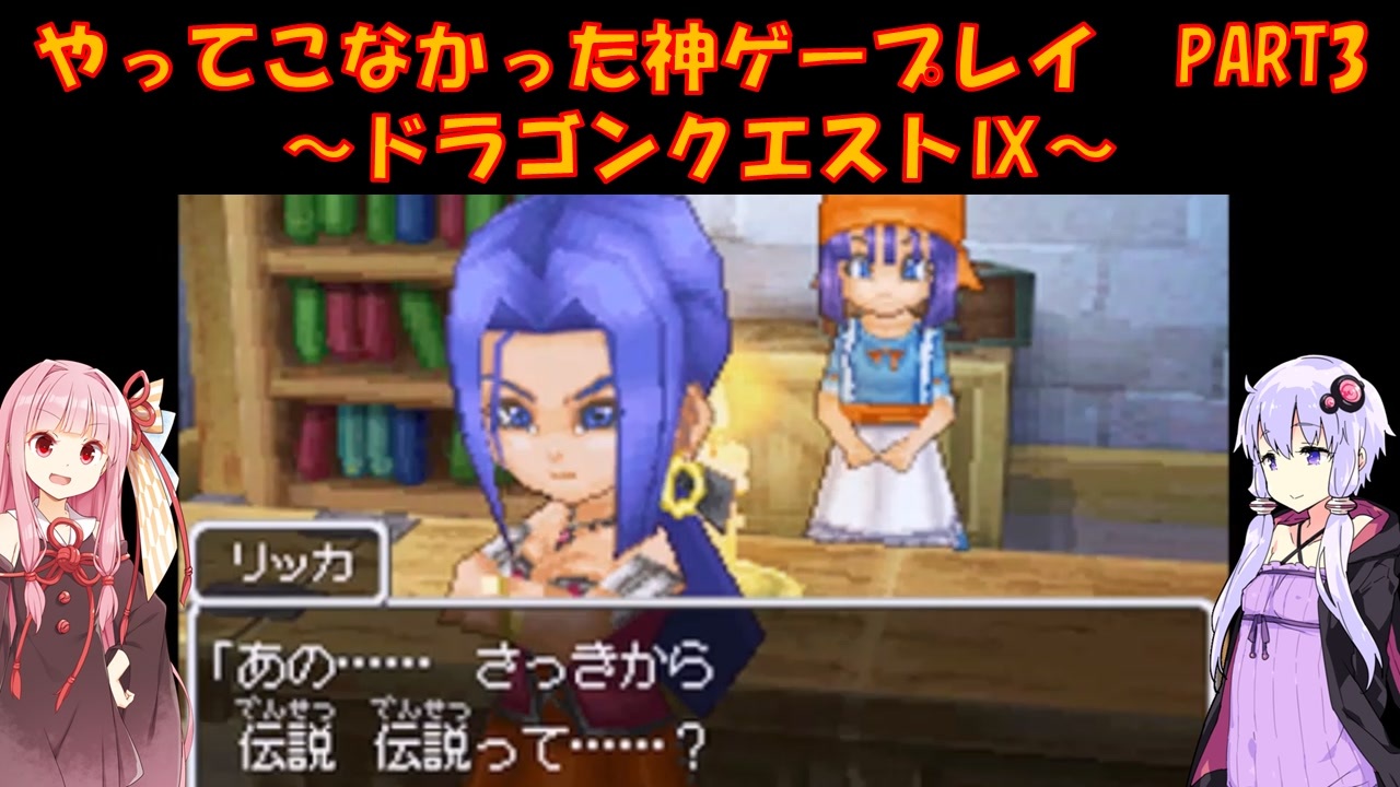 ニンテンドーDS ドラゴンクエストⅨをプレイ<br>ゆかりさんはメジャーじゃないゲームをやる俺カッケー族だったのでドラクエをやったことがありませんでした(DSのⅤ以外)<br><br>茜:伝説って?<br>ゆ:ああ!<br><br>PART1:<a href="https://www.nicovideo.jp/watch/sm45383595" target="_blank" rel="noopener nofollow">https://www.nicovideo.jp/watch/sm45383595</a><br><br>各DQシリーズ再生リスト<br><a href="https://garage.nicovideo.jp/niconico-garage/video/series/390298" target="_blank" rel="noopener nofollow">https://garage.nicovideo.jp/niconico-garage/video/series/390298</a><br><br>動画内で使用させていただいた素材<br>【イラスト】<br>結月ゆかり→ペテン師様:<a href="https://seiga.nicovideo.jp/seiga/im5494168" target="_blank" rel="noopener nofollow">https://seiga.nicovideo.jp/seiga/im5494168</a><br>琴葉茜→ユメのオワリ様:<a href="https://seiga.nicovideo.jp/seiga/im10706241" target="_blank" rel="noopener nofollow">https://seiga.nicovideo.jp/seiga/im10706241</a><br><br>【音声】<br>A.I.Voice:琴葉茜<br><a href="https://aivoice.jp/product/kotonoha/" target="_blank" rel="noopener nofollow">https://aivoice.jp/product/kotonoha/</a><br><br>A.I.Voice:結月ゆかり<br><a href="https://aivoice.jp/product/yukari/" target="_blank" rel="noopener nofollow">https://aivoice.jp/product/yukari/</a><br><br>【その他素材】<br><br>この動画で利用している株式会社スクウェア・エニックスを代表とする共同著作者が権利を所有する著作物及びスギヤマ工房有限会社が権利を所有する楽曲の転載・配布は禁止いたします。<br>© 2009 ARMOR PROJECT/BIRD STUDIO/LEVEL-5/SQUARE ENIX All Rights Reserved.<br>© SUGIYAMA KOBO<br>Ⓟ SUGIYAMA KOBO