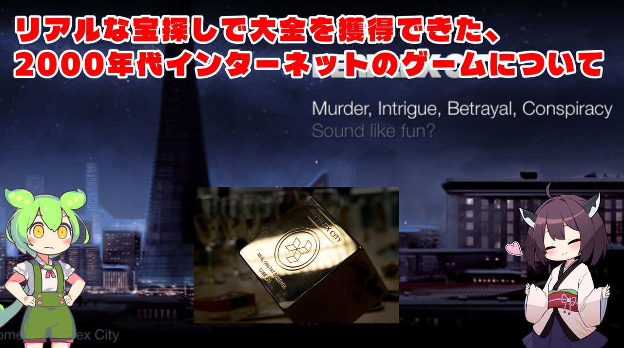 後編: <a href="https://www.nicovideo.jp/watch/sm45448771" class="watch">sm45448771</a><br>2,000年代、カードに隠された謎を解き、埋められたキューブを掘り起こすことで賞金を獲得できたARG、Perplex cityについて。<br>このゲームはまた、キューブ発見後も未解決になっていたカードに写る人物、「サトシ」を世界中のプレイヤーが約15年間も追い求めた結果発見され、しかも日本に住んでいた話でも有名です。<br><br>※動画製作者の本でも、ARGを解説しています!<br>『危険だからこそ知っておくべきカルトマーケティング』<br> <a href="https://amzn.to/47XUpnJ" target="_blank" rel="noopener nofollow">https://amzn.to/47XUpnJ</a><br><br>【BGM】<br>昼下がり気分<br><a href="https://dova-s.jp/bgm/play4712.html" target="_blank" rel="noopener nofollow">https://dova-s.jp/bgm/play4712.html</a><br>Garetoco- 探偵、調査する<br><a href="https://garetoco.com/material/243/" target="_blank" rel="noopener nofollow">https://garetoco.com/material/243/</a><br>Music from #Uppbeat (free for Creators!): <a href="https://uppbeat.io/t/simon-folwar/i-need-your-love" target="_blank" rel="noopener nofollow">https://uppbeat.io/t/simon-folwar/i-need-your-love</a> License code: EXSMO3RES7LNRJZJ<br><br>【効果音】<br>効果音ラボ <a href="https://soundeffect-lab.info/" target="_blank" rel="noopener nofollow">https://soundeffect-lab.info/</a><br><br>【音声】<br>VOICEROID+: 東北きりたん<br>VOICEBOX: ずんだもん<br><br>【キャラクター立ち絵、素材】<br>坂本アヒル様<br><a href="https://seiga.nicovideo.jp/seiga/im11206626" target="_blank" rel="noopener nofollow">https://seiga.nicovideo.jp/seiga/im11206626</a><br>でぃーえる様<br><a href="https://seiga.nicovideo.jp/seiga/im11014330" target="_blank" rel="noopener nofollow">https://seiga.nicovideo.jp/seiga/im11014330</a><br>