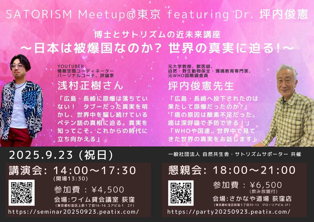 2025年9月23日(祝) 「博士とサトリズムの近未来講座with坪内先生」in東京<br>チケット予約はコチラ <a href="https://seminar20250923.peatix.com/" target="_blank" rel="noopener nofollow">https://seminar20250923.peatix.com/</a><br>懇親会予約はコチラ <a href="https://party20250923.peatix.com/" target="_blank" rel="noopener nofollow">https://party20250923.peatix.com/</a>