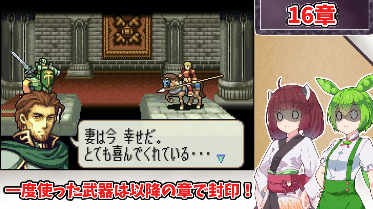 <span style="color: #85200c; font-size: 24px;"><strong><i>この動画をエンコードしてる最中に<br>FE最新作がニンテンドーダイレクトで発表されました<br>やったぜ!</i></strong></span><br><br><br><span style="font-size: 16px;"><strong>1:一度使用した武器種は、以降の章で使用する事を禁止する。<br>2:武器の使用の定義は『その武器を装備した状態で敵との戦闘が発生したタイミング』<br>または『その武器を売却したタイミング』<br>杖の場合は『対象に対して使用した時点(命中の可否は問わない)』とする。 </strong></span><br><span style="color: #ff0000; font-size: 16px;"><strong>※同盟軍、演出による戦闘イベントでは使用した判定にはならないこととする。</strong></span><span style="font-size: 16px;"><strong> <br>3:仲間候補のユニットを全員加入、生存させた状態でゲームをクリアする。<br>4:上級クラスのユニットは「武器を装備した状態」での戦闘を禁止する。<br>5:バグ技禁止</strong></span><br><br>この動画シリーズ【<a href="https://www.nicovideo.jp/series/516459" target="_blank" rel="noopener">series/516459</a>】<br>『トラ7』の同縛りプレイ【<a href="https://www.nicovideo.jp/series/482976" target="_blank" rel="noopener">series/482976</a>】<br>『烈火』の同縛りプレイ【<a href="https://www.nicovideo.jp/series/406473" target="_blank" rel="noopener">series/406473</a>】<br>『封印』の同縛りプレイ【<a href="https://www.nicovideo.jp/series/316824" target="_blank" rel="noopener">series/316824</a>】<br><br>前:【<a href="https://www.nicovideo.jp/watch/sm45370621" class="watch">sm45370621</a>】次:【<a href="https://www.nicovideo.jp/watch/sm45421225" class="watch">sm45421225</a>】<br><br><strong>使用したソフト</strong><br>VOICEROID+東北きりたんEX<br>VOICEVOX:ずんだもん<br>VOICEPEAK:ずんだもん<br><strong>お借りした素材</strong><br>ニコニコモンズの皆様(コンテンツツリー参照)
