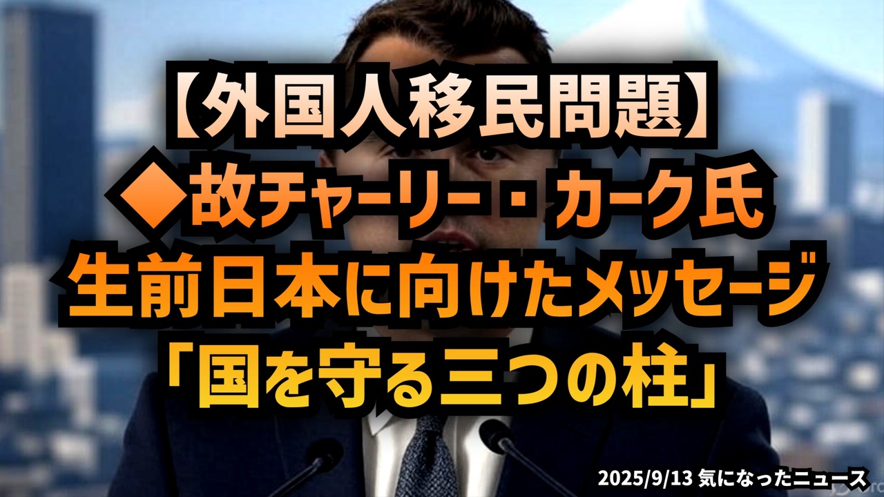【外国人移民問題】◆故チャーリー・カーク氏、生前日本に向けたメッセージ「国を守る三つの柱」<br><br> あらすじ <br>アメリカで大きな影響力を持った保守系活動家、チャーリー・カーク氏。彼は「国家とは何か」を三つの柱で語り、世界の変化に警鐘を鳴らしました。移民問題や国際的な潮流に揺れる日本にとっても、その言葉は他人事ではありません。今回の動画では、彼が残したメッセージを紹介しつつ、私たちが未来を守るために必要な視点を考えます。<a href="https://x.com/tenkataihei369/status/1966367776865742883?t=QaeZPOM4wWroVAHivy20bg&s=19" target="_blank" rel="noopener nofollow">https://x.com/tenkataihei369/status/1966367776865742883?t=QaeZPOM4wWroVAHivy20bg&s=19</a><br><br>◆今回の台本<a href="https://keiichiro8140.hatenablog.com/entry/25091333111" target="_blank" rel="noopener nofollow">https://keiichiro8140.hatenablog.com/entry/25091333111</a><br><br>◆YouTubeチャンネル登録よろしくお願いします🙏 <a href="https://www.youtube.com/@K16news888" target="_blank" rel="noopener nofollow">https://www.youtube.com/@K16news888</a><br><br>①東京都庁第一庁舎前で「エジプト合意撤回デモ」<a href="https://x.com/poluuu/status/1965722904878080324?t=mf2eS6mTFmSGSwJVgQjQYA&s=19" target="_blank" rel="noopener nofollow">https://x.com/poluuu/status/1965722904878080324?t=mf2eS6mTFmSGSwJVgQjQYA&s=19</a><br><br>②福岡イスラム教の公園使用に対する抗議街宣<a href="https://x.com/kimurice/status/1965592157483610247?t=h-r0LLRiYoWI10BIioyn3g&s=19" target="_blank" rel="noopener nofollow">https://x.com/kimurice/status/1965592157483610247?t=h-r0LLRiYoWI10BIioyn3g&s=19</a><br><br>◆もしも(BAN)の時のためのマイリンク集<a href="https://lit.link/K16_888" target="_blank" rel="noopener nofollow">https://lit.link/K16_888</a><br><br><br>ご覧いただきありがとうございます<br>m(_ _)m<br>気になったニュース 2025/9/13<br><br />著作権、肖像権に配慮して作成しております。<br><br>◆気になったニュースの台本!?<br>メモ代わりに作った台本をそのままあげてます<br><a href="https://keiichiro8140.hatenablog.com/." target="_blank" rel="noopener nofollow">https://keiichiro8140.hatenablog.com/.</a><br><br><br>ここからはシリーズ紹介<br><br><br>◆ ワクチン解毒・デトックス<br><a href="https://x.gd/fZweg" target="_blank" rel="noopener nofollow">https://x.gd/fZweg</a><br><br>◆ウイリアム・マキス博士のがん治療(イベルメクチン・フェンベンダゾール等)<br><a href="https://x.gd/AtFYS" target="_blank" rel="noopener nofollow">https://x.gd/AtFYS</a><br><br>◆予防接種健康被害救済制度<br><a href="https://x.gd/0xK9x" target="_blank" rel="noopener nofollow">https://x.gd/0xK9x</a><br><br>◆気になったニュース #1501~<br><br>◆ 【ショートver】気になったニュース<br><a href="https://x.gd/7MxXC" target="_blank" rel="noopener nofollow">https://x.gd/7MxXC</a><br><br>◆ 気になったニュース #1001~<br><a href="https://x.gd/Lp8gv" target="_blank" rel="noopener nofollow">https://x.gd/Lp8gv</a><br><br>◆ 気になったニュース #501~<br><a href="https://x.gd/EmbS4" target="_blank" rel="noopener nofollow">https://x.gd/EmbS4</a><br><br>◆ 気になったニュース #1~#500<br><a href="https://x.gd/uPhNb" target="_blank" rel="noopener nofollow">https://x.gd/uPhNb</a><br><br>◆ X(旧Twitter)・テレグラムで気になった情報<br><a href="https://x.gd/YG6FT" target="_blank" rel="noopener nofollow">https://x.gd/YG6FT</a><br><br>◆ 日比谷5万人パレードデ⚪生放送アーカイブ動画<br><a href="https://x.gd/3CHJv" target="_blank" rel="noopener nofollow">https://x.gd/3CHJv</a><br><br>◆日比谷5万人パレード⚪モのマイリスト作ってみました<br><a href="https://nico.ms/mylist/76828848?ref=sp_other" target="_blank" rel="noopener nofollow">https://nico.ms/mylist/76828848?ref=sp_other</a><br><br>◆3.30 令和の百姓⚪⚪<br><a href="https://www.nicovideo.jp/series/511791?ref=garage_share_other" target="_blank" rel="noopener nofollow">https://www.nicovideo.jp/series/511791?ref=garage_share_other</a><br><br>◆ 及川幸久さんの【XNEWS】シリーズ<br><a href="https://x.gd/3k78K" target="_blank" rel="noopener nofollow">https://x.gd/3k78K</a><br><br>◆これまでの動画<a href="https://x.gd/sPXoJ" target="_blank" rel="noopener nofollow">https://x.gd/sPXoJ</a><br><br>◆もしも(BAN)の時のためのマイリンク集<a href="https://lit.link/K-16_News44" target="_blank" rel="noopener nofollow">https://lit.link/K-16_News44</a><br><br>