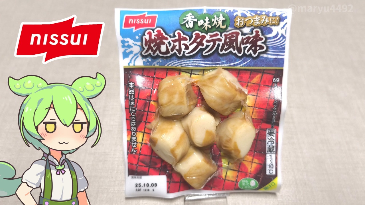 カニカマの隣にあったので買ってみることにしました。<br><br><br>【参考】<br>香味焼 焼ホタテ風味(ニッスイ)<br><a href="https://www.nissui.co.jp/product/00583.html" target="_blank" rel="noopener nofollow">https://www.nissui.co.jp/product/00583.html</a><br>「香味焼 焼ホタテ風味」発売(日本水産)2016.02.22(日本食糧新聞)<br><a href="https://news.nissyoku.co.jp/foodsnews/trend20160216111026125" target="_blank" rel="noopener nofollow">https://news.nissyoku.co.jp/foodsnews/trend20160216111026125</a><br>バーチャル工場長体験(ニッスイ)<br><a href="https://yakioni.jp/factory/" target="_blank" rel="noopener nofollow">https://yakioni.jp/factory/</a><br><br>【使用した素材】(※敬称略) <br>(合成音声)VOICEVOX/ずんだもん/四国めたん<br><a href="https://voicevox.hiroshiba.jp/" target="_blank" rel="noopener nofollow">https://voicevox.hiroshiba.jp/</a> <br>(立ち絵)坂本アヒル<br> <a href="https://seiga.nicovideo.jp/seiga/im10788496?track" target="_blank" rel="noopener nofollow">https://seiga.nicovideo.jp/seiga/im10788496?track</a><br>(楽曲)甘茶の音楽工房/「楽しい麦畑」「フルーツパフェ」「お城の舞踏会」<br><a href="https://amachamusic.chagasi.com/" target="_blank" rel="noopener nofollow">https://amachamusic.chagasi.com/</a>