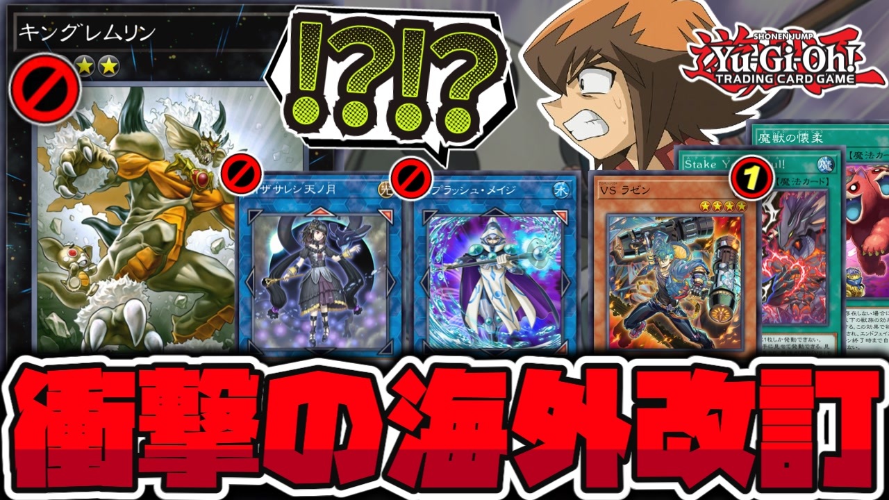 海外の改訂で4枚が禁止カードに!!え、キングレムリン!?!? <br>スプラッシュメイジ禁止も凄いけど、サロスナンナの禁止はありそうでなった世界線だ…<br />YouTubeの動画を後出しでニコニコに投稿しています。<br><a href="https://www.youtube.com/@yukurach" target="_blank" rel="noopener nofollow">https://www.youtube.com/@yukurach</a><br><br>©スタジオ・ダイス/集英社・テレビ東京・KONAMI ©Konami Digital Entertainment