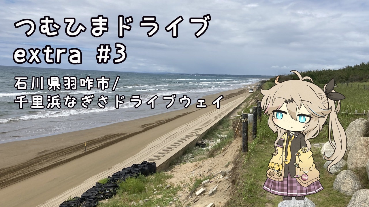 つむひまドライブ、ほぼスマホ撮りの番外編的な位置付けの予定になるextra編です。<br><br>動画は、2024年8月12日に北陸旅行に行って撮影したもので、つむひまextra#2の続きになります。<br>今回の目的地は、石川県羽咋市にある千里浜なぎさドライブウェイです。<br><br>前々回→<a href="https://www.nicovideo.jp/watch/sm45247302" class="watch">sm45247302</a><br>前回→<a href="https://www.nicovideo.jp/watch/sm45363761" class="watch">sm45363761</a><br>次→<a href="https://www.nicovideo.jp/watch/sm45531920" class="watch">sm45531920</a><br><br><br>千里浜なぎさドライブウェイ<br>石川県羽咋郡宝達志水町から羽咋市千里浜町までの、8Km程度に渡る浜辺を走行できる道路。<br>自動車やバイクなどの車両が走行できる浜辺は、日本でここだけ。<br><br><br>クレジット<br><br>VOICEVOX<br><a href="https://voicevox.hiroshiba.jp/" target="_blank" rel="noopener nofollow">https://voicevox.hiroshiba.jp/</a><br>・春日部つむぎ@VOICEVOX<br><br>春日部つむぎ<br><a href="https://tsumugi-official.studio.site/rule" target="_blank" rel="noopener nofollow">https://tsumugi-official.studio.site/rule</a><br><br>効果音ラボ<br><a href="https://soundeffect-lab.info/" target="_blank" rel="noopener nofollow">https://soundeffect-lab.info/</a>