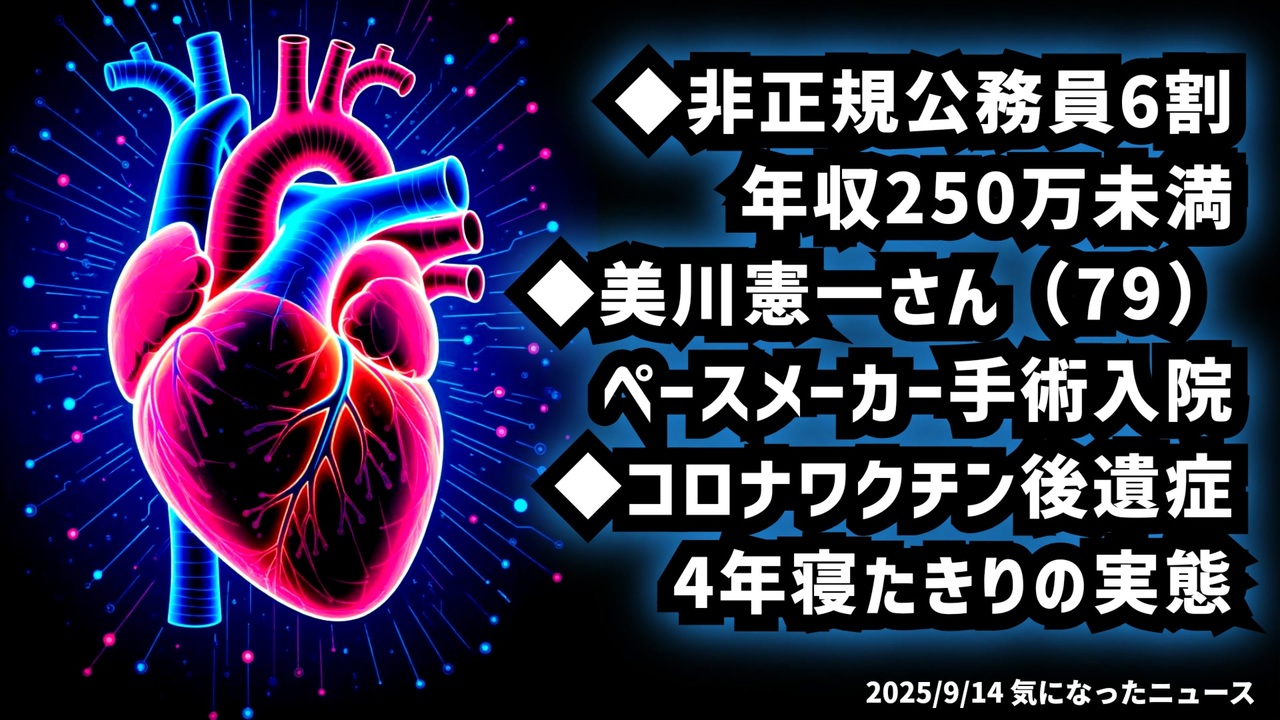 ◆非正規公務員の6割が年収250万円未満 94%が女性の現実◆美川憲一さん79歳 ペースメーカー手術で入院 洞不全症候群とは◆コロナワクチン後遺症 4年間寝たきりに苦しむ患者の声と救済の壁<br><br>あらすじ<br>今、日本社会の“見えにくい現実”が次々と明らかになっています。<br>非正規公務員の多くは低賃金かつ不安定な雇用に置かれ、生活の基盤を揺さぶられています。<a href="https://x.com/hide_Q_/status/1966807732071158191?t=8XXC_jNKDee1ioPM4kvi7g&s=19" target="_blank" rel="noopener nofollow">https://x.com/hide_Q_/status/1966807732071158191?t=8XXC_jNKDee1ioPM4kvi7g&s=19</a><br><br>一方で、長年ステージに立ち続けてきた大物歌手が、心臓の病で入院し、健康の大切さを改めて考えさせられます。<a href="https://x.com/fraisst/status/1966855201002066058?t=PZDcNm3RNgRLL--EfH3hdA&s=19" target="_blank" rel="noopener nofollow">https://x.com/fraisst/status/1966855201002066058?t=PZDcNm3RNgRLL--EfH3hdA&s=19</a><br><br>さらに、新型コロナワクチン接種後に深刻な体調不良を訴える人々の声も報じられ、制度の壁に直面する姿が浮き彫りになっています。<a href="https://news.yahoo.co.jp/articles/573b5fcd13bc8ea610843acd4bdf89aa5098fd3a" target="_blank" rel="noopener nofollow">https://news.yahoo.co.jp/articles/573b5fcd13bc8ea610843acd4bdf89aa5098fd3a</a><br><br>働き方・医療・健康――私たち一人ひとりが無関係ではいられない問題をどう受け止め、どんな一歩を踏み出せるのか。今、考える時が来ています。<br><br>◆今回の台本<a href="https://keiichiro8140.hatenablog.com/entry/24091444111" target="_blank" rel="noopener nofollow">https://keiichiro8140.hatenablog.com/entry/24091444111</a><br><br>◆YouTubeチャンネル登録よろしくお願いします🙏 <a href="https://www.youtube.com/@K16news888" target="_blank" rel="noopener nofollow">https://www.youtube.com/@K16news888</a><br><br>◆もしも(BAN)の時のためのマイリンク集<a href="https://lit.link/K16_888" target="_blank" rel="noopener nofollow">https://lit.link/K16_888</a><br><br>ご覧いただきありがとうございます<br>m(_ _)m<br>気になったニュース 2025/9/14<br><br />著作権、肖像権に配慮して作成しております。<br><br>◆気になったニュースの台本!?<br>メモ代わりに作った台本をそのままあげてます<br><a href="https://keiichiro8140.hatenablog.com/." target="_blank" rel="noopener nofollow">https://keiichiro8140.hatenablog.com/.</a><br><br><br>ここからはシリーズ紹介<br><br><br>◆ ワクチン解毒・デトックス<br><a href="https://x.gd/fZweg" target="_blank" rel="noopener nofollow">https://x.gd/fZweg</a><br><br>◆ウイリアム・マキス博士のがん治療(イベルメクチン・フェンベンダゾール等)<br><a href="https://x.gd/AtFYS" target="_blank" rel="noopener nofollow">https://x.gd/AtFYS</a><br><br>◆予防接種健康被害救済制度<br><a href="https://x.gd/0xK9x" target="_blank" rel="noopener nofollow">https://x.gd/0xK9x</a><br><br>◆気になったニュース #1501~<br><br>◆ 【ショートver】気になったニュース<br><a href="https://x.gd/7MxXC" target="_blank" rel="noopener nofollow">https://x.gd/7MxXC</a><br><br>◆ 気になったニュース #1001~<br><a href="https://x.gd/Lp8gv" target="_blank" rel="noopener nofollow">https://x.gd/Lp8gv</a><br><br>◆ 気になったニュース #501~<br><a href="https://x.gd/EmbS4" target="_blank" rel="noopener nofollow">https://x.gd/EmbS4</a><br><br>◆ 気になったニュース #1~#500<br><a href="https://x.gd/uPhNb" target="_blank" rel="noopener nofollow">https://x.gd/uPhNb</a><br><br>◆ X(旧Twitter)・テレグラムで気になった情報<br><a href="https://x.gd/YG6FT" target="_blank" rel="noopener nofollow">https://x.gd/YG6FT</a><br><br>◆ 日比谷5万人パレードデ⚪生放送アーカイブ動画<br><a href="https://x.gd/3CHJv" target="_blank" rel="noopener nofollow">https://x.gd/3CHJv</a><br><br>◆日比谷5万人パレード⚪モのマイリスト作ってみました<br><a href="https://nico.ms/mylist/76828848?ref=sp_other" target="_blank" rel="noopener nofollow">https://nico.ms/mylist/76828848?ref=sp_other</a><br><br>◆3.30 令和の百姓⚪⚪<br><a href="https://www.nicovideo.jp/series/511791?ref=garage_share_other" target="_blank" rel="noopener nofollow">https://www.nicovideo.jp/series/511791?ref=garage_share_other</a><br><br>◆ 及川幸久さんの【XNEWS】シリーズ<br><a href="https://x.gd/3k78K" target="_blank" rel="noopener nofollow">https://x.gd/3k78K</a><br><br>◆これまでの動画<a href="https://x.gd/sPXoJ" target="_blank" rel="noopener nofollow">https://x.gd/sPXoJ</a><br><br>◆もしも(BAN)の時のためのマイリンク集<a href="https://lit.link/K-16_News44" target="_blank" rel="noopener nofollow">https://lit.link/K-16_News44</a><br><br>