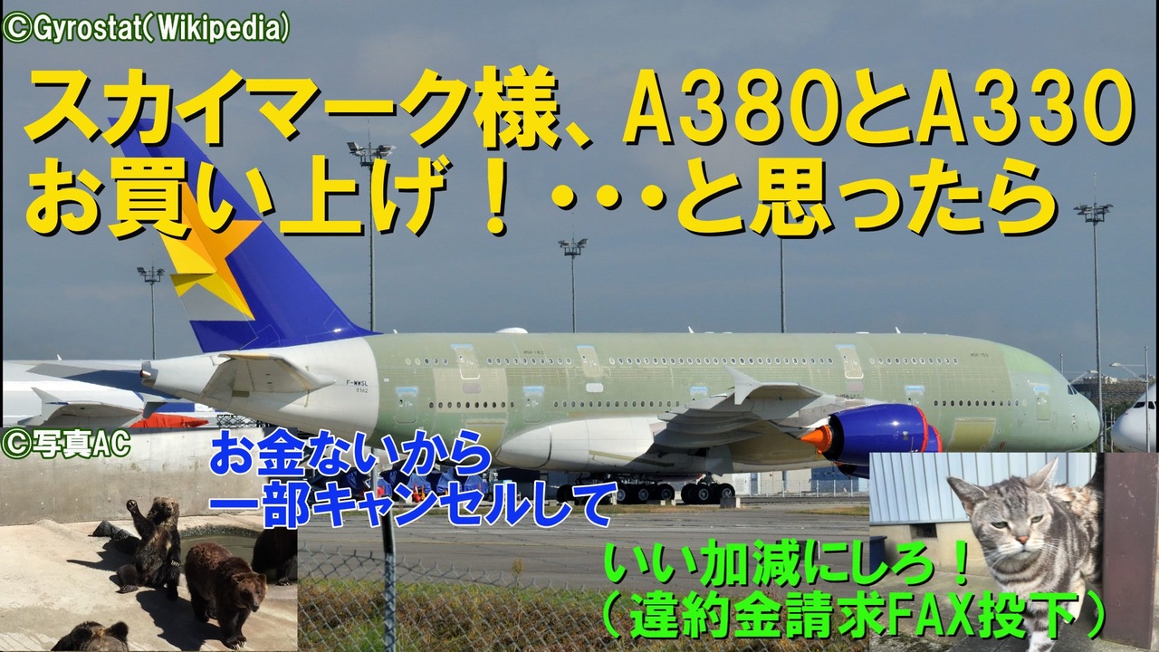JALのA300全機売却とANAのA320退役で崖っぷちだったエアバスの日本市場でしたが、Peachを始めとした和製LCCが相次いでA320を採用したことで徐々に反転攻勢に出ます。更にスカイマークからもまさかのA380発注をゲットし、思わぬ新規顧客ラッシュにエアバスは大歓喜。しかしこのスカイマークのA380は会社の体力を大きく超えた無謀な発注であり、日本で初めてエアバスがブチ切れる事態に発展するのです。詳しくは本編で。 <br><br>日本でのLCC立ち上げについてはこちら→<a href="https://www.nicovideo.jp/watch/sm33481097" class="watch">sm33481097</a><br>スカイマークのしくじりについてはこちらもどうぞ→<br><br> 第一話→<a href="https://www.nicovideo.jp/watch/sm45157348" class="watch">sm45157348</a><br>第二話→<a href="https://www.nicovideo.jp/watch/sm45198354" class="watch">sm45198354</a><br>第三話→<a href="https://www.nicovideo.jp/watch/sm45249347" class="watch">sm45249347</a><br>第四話→<a href="https://www.nicovideo.jp/watch/sm45329995" class="watch">sm45329995</a><br /><span style="color: #000000; font-size: 14px;">迷航空会社列伝</span><span style="color: #006699; font-size: 14px;"><a href="https://www.nicovideo.jp/mylist/24098760" target="_blank" rel="noopener">mylist/24098760</a></span><span style="color: #000000; font-size: 14px;"> 迷列車北陸編</span><span style="color: #006699; font-size: 14px;"><a href="https://www.nicovideo.jp/mylist/19084652" target="_blank" rel="noopener">mylist/19084652</a> </span><span style="color: #000000; font-size: 14px;">東海道交通戦争</span><span style="color: #006699; font-size: 14px;"><a href="https://www.nicovideo.jp/mylist/57958388" target="_blank" rel="noopener">mylist/57958388</a></span><span style="color: #000000; font-size: 14px;"> 交通機関の栄枯盛衰 </span><a href="https://www.nicovideo.jp/mylist/66898301" target="_blank" rel="noopener">mylist/66898301</a><br><span style="color: #000000; font-size: 14px;">ブログ→</span><span style="color: #006699; font-size: 14px;"><a href="http://www.meihokuriku-alps.com" target="_blank" rel="noopener nofollow">http://www.meihokuriku-alps.com</a></span><br>note→<a href="https://note.com/meihokuriku" target="_blank" rel="noopener nofollow">https://note.com/meihokuriku</a><br><span style="color: #000000; font-size: 14px;">使用BGM<br>甘茶の音楽工房様 </span><span style="color: #006699; font-size: 14px;"><a href="http://amachamusic.chagasi.com/index.html" target="_blank" rel="noopener nofollow">http://amachamusic.chagasi.com/index.html</a></span><br><span style="color: #000000; font-size: 14px;">魔王魂様 </span><span style="color: #006699; font-size: 14px;"><a href="https://maoudamashii.jokersounds.com/list/bgm5.html" target="_blank" rel="noopener nofollow">https://maoudamashii.jokersounds.com/list/bgm5.html</a></span>