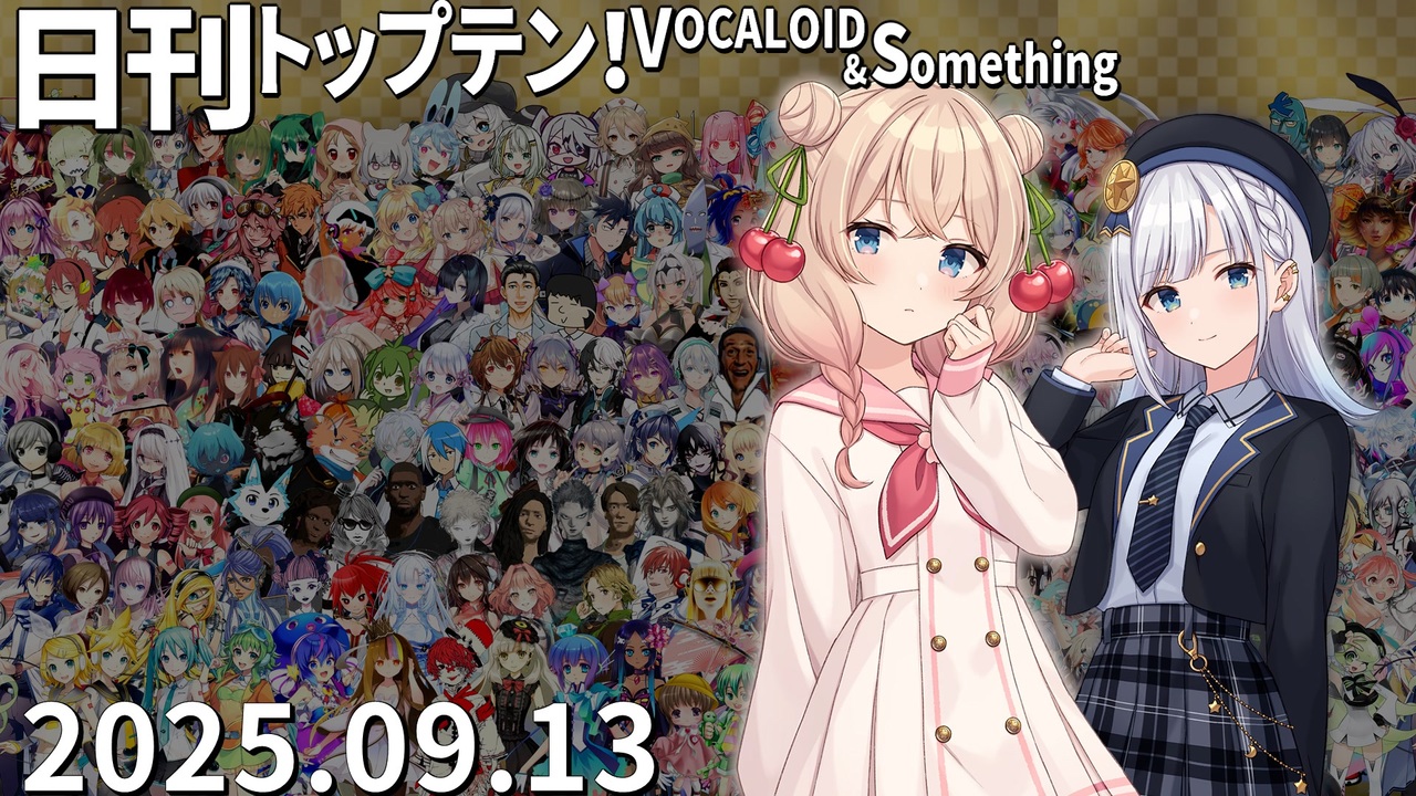 前日(9/12)←<a href="https://www.nicovideo.jp/watch/sm45408784" class="watch">sm45408784</a> <a href="https://www.nicovideo.jp/watch/sm45414935" class="watch">sm45414935</a>→翌日(9/14)<br>★Mixi2にもいます。<a href="https://mixi.social/@LUKANAN_P" target="_blank" rel="noopener nofollow">https://mixi.social/@LUKANAN_P</a><br><br>★チャプター<br>昨日1位<a href="#" class="seekTime" data-seekTime="0:00" onclick="seekNicoPlayer('#0:00'); return false;">#0:00</a> TOP10<a href="#" class="seekTime" data-seekTime="0:36" onclick="seekNicoPlayer('#0:36'); return false;">#0:36</a> 1年前<a href="#" class="seekTime" data-seekTime="2:56" onclick="seekNicoPlayer('#2:56'); return false;">#2:56</a> TOP3<a href="#" class="seekTime" data-seekTime="3:24" onclick="seekNicoPlayer('#3:24'); return false;">#3:24</a> 10年前<a href="#" class="seekTime" data-seekTime="4:55" onclick="seekNicoPlayer('#4:55'); return false;">#4:55</a> PICKUP<a href="#" class="seekTime" data-seekTime="5:23" onclick="seekNicoPlayer('#5:23'); return false;">#5:23</a> <br><br>★トップテン<br>10:<a href="https://www.nicovideo.jp/watch/sm45374668" class="watch">sm45374668</a> 9:<a href="https://www.nicovideo.jp/watch/sm45378158" class="watch">sm45378158</a> 8:<a href="https://www.nicovideo.jp/watch/sm45386683" class="watch">sm45386683</a> 7:<a href="https://www.nicovideo.jp/watch/sm45363297" class="watch">sm45363297</a> <br>6:<a href="https://www.nicovideo.jp/watch/sm45366127" class="watch">sm45366127</a> 5:<a href="https://www.nicovideo.jp/watch/sm45359583" class="watch">sm45359583</a> 4:<a href="https://www.nicovideo.jp/watch/so45391327" class="watch">so45391327</a> 3:<a href="https://www.nicovideo.jp/watch/sm45396713" class="watch">sm45396713</a> 2:<a href="https://www.nicovideo.jp/watch/sm45392058" class="watch">sm45392058</a> 1:<a href="https://www.nicovideo.jp/watch/sm45391043" class="watch">sm45391043</a> <br><br>★ピックアップ(B~Fは超新着枠)<br>B:<a href="https://www.nicovideo.jp/watch/sm45396588" class="watch">sm45396588</a> C:<a href="https://www.nicovideo.jp/watch/sm45394499" class="watch">sm45394499</a> D:<a href="https://www.nicovideo.jp/watch/sm45377769" class="watch">sm45377769</a> E:<a href="https://www.nicovideo.jp/watch/sm45393858" class="watch">sm45393858</a> F:<a href="https://www.nicovideo.jp/watch/sm45370985" class="watch">sm45370985</a> G:<a href="https://www.nicovideo.jp/watch/sm45376667" class="watch">sm45376667</a> <br>H:<a href="https://www.nicovideo.jp/watch/sm45304109" class="watch">sm45304109</a> I:<a href="https://www.nicovideo.jp/watch/sm45377495" class="watch">sm45377495</a> J:<a href="https://www.nicovideo.jp/watch/sm45370877" class="watch">sm45370877</a> K:<a href="https://www.nicovideo.jp/watch/sm45374611" class="watch">sm45374611</a> L:<a href="https://www.nicovideo.jp/watch/sm45388843" class="watch">sm45388843</a> M:<a href="https://www.nicovideo.jp/watch/sm45342526" class="watch">sm45342526</a> <br>N:<a href="https://www.nicovideo.jp/watch/sm45351905" class="watch">sm45351905</a> O:<a href="https://www.nicovideo.jp/watch/sm45374430" class="watch">sm45374430</a> P:<a href="https://www.nicovideo.jp/watch/sm45374910" class="watch">sm45374910</a> Q:<a href="https://www.nicovideo.jp/watch/sm45368864" class="watch">sm45368864</a> R:<a href="https://www.nicovideo.jp/watch/sm45374584" class="watch">sm45374584</a> <br><br>★プレイバック <br>A(1年前):<a href="https://www.nicovideo.jp/watch/sm44093612" class="watch">sm44093612</a> 十(10年前):<a href="https://www.nicovideo.jp/watch/sm27147527" class="watch">sm27147527</a> 前日の第1位: <a href="https://www.nicovideo.jp/watch/sm45383003" class="watch">sm45383003</a>(彩澄しゅお・彩澄りりせ)<br><br>☆集計対象:2025/9/6~13 5時投稿の作品(9/13 5時集計)<br>★計算式:再生×1+コメント×最大12+いいね!×14+マイリスト×11<br>☆プレイリスト:<u><a href="https://nikkantop10.hatenablog.com/entry/ar20250913" target="_blank" rel="noopener nofollow">https://nikkantop10.hatenablog.com/entry/ar20250913</a></u> 、 <a href="https://www.nicovideo.jp/mylist/49271984" target="_blank" rel="noopener">mylist/49271984</a> <br>★1年前トップテン:<a href="https://www.nicovideo.jp/watch/sm44099801" class="watch">sm44099801</a><br />★日刊トップテン動画一覧マイリスト:<a href="https://www.nicovideo.jp/mylist/47849908" target="_blank" rel="noopener">mylist/47849908</a><br>☆ルールや計算式の詳細:<a href="https://nikkantop10-sub.hatenablog.com/entry/top10_rule" target="_blank" rel="noopener nofollow">https://nikkantop10-sub.hatenablog.com/entry/top10_rule</a><br><span style="color: #262626;">★K!!te Playlist LINK!:<a href="https://kiite.jp/user/AIST_playlist_bot" target="_blank" rel="noopener nofollow">https://kiite.jp/user/AIST_playlist_bot</a><br>☆Twitter:<a href="https://twitter.com/VOCALO_NEWRANK" target="_blank" rel="noopener nofollow">https://twitter.com/VOCALO_NEWRANK</a><br>★Thread:<a href="https://www.threads.net/@lukanan_p" target="_blank" rel="noopener nofollow">https://www.threads.net/@lukanan_p</a></span><br><br><span style="color: #0000ff;"><strong>◆今後の動画投稿イベント情報</strong></span><br>2025/12/29~31 <strong>先端映像音楽表現投稿祭</strong> <a href="https://twipla.jp/events/678401" target="_blank" rel="noopener nofollow">https://twipla.jp/events/678401</a><br>2026/1/1~4 <strong>ボカロサビ投稿祭2026 </strong><a href="https://twipla.jp/events/705936" target="_blank" rel="noopener nofollow">https://twipla.jp/events/705936</a> ※既存曲は新規投稿で参加可<br>2026/1/10~12 <strong>ポストロック投稿祭 </strong><a href="https://twipla.jp/events/694939" target="_blank" rel="noopener nofollow">https://twipla.jp/events/694939</a>