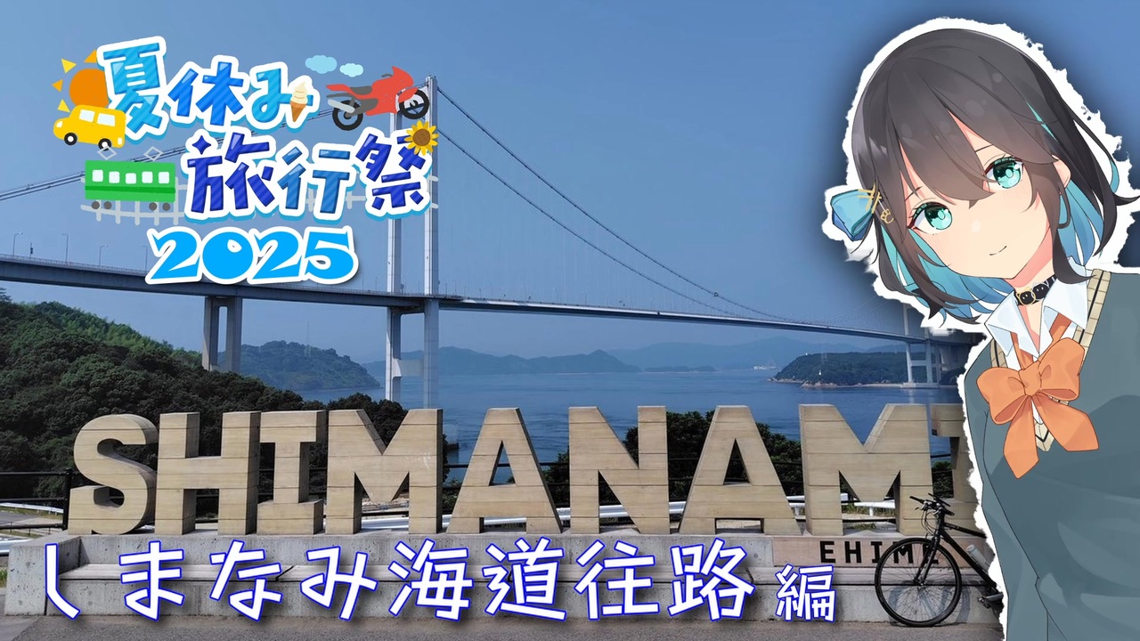 <span style="color: #ff0000;"><strong>本作品は湊(みなと) 様主催の夏休み旅行祭の参加作品です。</strong></span><br><br><br>私の夏休み旅行。<br><br>一度は走ってみたい、と思っていたことをやってみました。<br><br>尾道から今治まで、しまなみ海道70㎞を自転車で往復しました。<br>その往路編。<br><br>渡船にのり、島を走り、橋を渡り、景色を楽しみました。<br><br>宮舞モカさんには日記のような口調で話していただきました。<br /><br>〈立ち絵など〉<br>・Mo.きづち 様の『宮舞モカ』をお借りしました<br>・デムサト様の『アイコンアニメ素材フルセット版』<br><br>〈使用ツール〉<br>・編集ソフト:DaVinci Resolve(FREE)<br>・VOICEPEAK 宮舞モカ フリモメン<br>・PPgarage:<a href="https://www.fanbox.cc/@shihabuki/posts/8364157" target="_blank" rel="noopener nofollow">https://www.fanbox.cc/@shihabuki/posts/8364157</a><br>・ニコ動がの宣伝者さんをリストアップツール