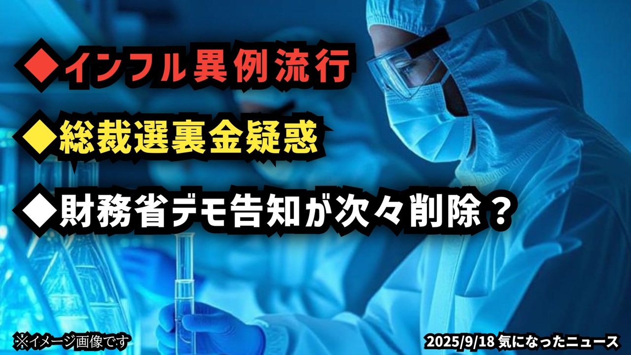 ◆インフル異例流行◆総裁選裏金疑惑◆財務省デモ告知が次々削除?<br><br>あらすじ<br>今年の日本を揺るがす動きが次々と報じられています。福岡では例年より2か月も早くインフルエンザが流行期に入り、学級閉鎖が相次ぎました。さらに、自民党総裁選に挑む有力候補には巨額資金の不透明な処理が報じられ、政治不信を呼んでいます。そして東京では「財務省解体」を掲げるデモが告知され、その情報がSNS上で次々と削除されているとの声も。生活と政治、そして社会の動きが交錯する今、私たちが何を考えるべきか。最新の出来事を分かりやすくお伝えします。<br><br>◆今回の台本<a href="https://keiichiro8140.hatenablog.com/entry/25091888222" target="_blank" rel="noopener nofollow">https://keiichiro8140.hatenablog.com/entry/25091888222</a><br><br>◆YouTubeチャンネル登録よろしくお願いします🙏 <a href="https://www.youtube.com/@K16news888" target="_blank" rel="noopener nofollow">https://www.youtube.com/@K16news888</a><br><br>◆もしも(BAN)の時のためのマイリンク集<a href="https://lit.link/K16_888" target="_blank" rel="noopener nofollow">https://lit.link/K16_888</a><br><br>ご覧いただきありがとうございます<br>m(_ _)m<br>気になったニュース 2025/9/18<br><br />著作権、肖像権に配慮して作成しております。<br><br>◆気になったニュースの台本!?<br>メモ代わりに作った台本をそのままあげてます<br><a href="https://keiichiro8140.hatenablog.com/." target="_blank" rel="noopener nofollow">https://keiichiro8140.hatenablog.com/.</a><br><br><br>ここからはシリーズ紹介<br><br><br>◆ ワクチン解毒・デトックス<br><a href="https://x.gd/fZweg" target="_blank" rel="noopener nofollow">https://x.gd/fZweg</a><br><br>◆ウイリアム・マキス博士のがん治療(イベルメクチン・フェンベンダゾール等)<br><a href="https://x.gd/AtFYS" target="_blank" rel="noopener nofollow">https://x.gd/AtFYS</a><br><br>◆予防接種健康被害救済制度<br><a href="https://x.gd/0xK9x" target="_blank" rel="noopener nofollow">https://x.gd/0xK9x</a><br><br>◆気になったニュース #1501~<br><br>◆ 【ショートver】気になったニュース<br><a href="https://x.gd/7MxXC" target="_blank" rel="noopener nofollow">https://x.gd/7MxXC</a><br><br>◆ 気になったニュース #1001~<br><a href="https://x.gd/Lp8gv" target="_blank" rel="noopener nofollow">https://x.gd/Lp8gv</a><br><br>◆ 気になったニュース #501~<br><a href="https://x.gd/EmbS4" target="_blank" rel="noopener nofollow">https://x.gd/EmbS4</a><br><br>◆ 気になったニュース #1~#500<br><a href="https://x.gd/uPhNb" target="_blank" rel="noopener nofollow">https://x.gd/uPhNb</a><br><br>◆ X(旧Twitter)・テレグラムで気になった情報<br><a href="https://x.gd/YG6FT" target="_blank" rel="noopener nofollow">https://x.gd/YG6FT</a><br><br>◆ 日比谷5万人パレードデ⚪生放送アーカイブ動画<br><a href="https://x.gd/3CHJv" target="_blank" rel="noopener nofollow">https://x.gd/3CHJv</a><br><br>◆日比谷5万人パレード⚪モのマイリスト作ってみました<br><a href="https://nico.ms/mylist/76828848?ref=sp_other" target="_blank" rel="noopener nofollow">https://nico.ms/mylist/76828848?ref=sp_other</a><br><br>◆3.30 令和の百姓⚪⚪<br><a href="https://www.nicovideo.jp/series/511791?ref=garage_share_other" target="_blank" rel="noopener nofollow">https://www.nicovideo.jp/series/511791?ref=garage_share_other</a><br><br>◆ 及川幸久さんの【XNEWS】シリーズ<br><a href="https://x.gd/3k78K" target="_blank" rel="noopener nofollow">https://x.gd/3k78K</a><br><br>◆これまでの動画<a href="https://x.gd/sPXoJ" target="_blank" rel="noopener nofollow">https://x.gd/sPXoJ</a><br><br>◆もしも(BAN)の時のためのマイリンク集<a href="https://lit.link/K-16_News44" target="_blank" rel="noopener nofollow">https://lit.link/K-16_News44</a><br><br>
