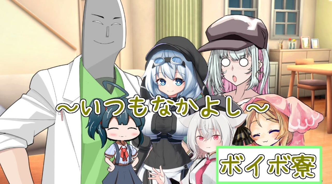 ボイボ寮も人がたくさん増えましたね<br><br>〇登場人物<br>VOICEVOX<br>模型娘のもち子さん(CV:明日葉よもぎ)→立ち絵:セーバー様(<a href="https://seiga.nicovideo.jp/seiga/im11195311" target="_blank" rel="noopener">im11195311</a>)<br>もち公→立ち絵:もちぞら模型店公式(<a href="https://seiga.nicovideo.jp/seiga/im11229179" target="_blank" rel="noopener">im11229179</a>)<br>剣崎雌雄→立ち絵:moiky様(<a href="https://seiga.nicovideo.jp/seiga/im11000058" target="_blank" rel="noopener">im11000058</a>)<br>小夜→立ち絵:ぴぴ様(<a href="https://seiga.nicovideo.jp/seiga/im11104083" target="_blank" rel="noopener">im11104083</a>)<br>櫻歌ミコ→立ち絵:一止月サノツキ様(<a href="https://seiga.nicovideo.jp/seiga/im11174163" target="_blank" rel="noopener">im11174163</a>)<br>No.7→立ち絵:シャドウ商事様(<a href="https://seiga.nicovideo.jp/seiga/im11041480" target="_blank" rel="noopener">im11041480</a>)<br>後鬼→立ち絵:ついなちゃん公式<br>春日部つむぎ→立ち絵:もふもふさん様(<a href="https://seiga.nicovideo.jp/seiga/im11125654" target="_blank" rel="noopener">im11125654</a>)<br>離途→立ち絵:moiky様(<a href="https://seiga.nicovideo.jp/seiga/im11625959" target="_blank" rel="noopener">im11625959</a>)<br>黒沢冴白→立ち絵:moiky様(<a href="https://seiga.nicovideo.jp/seiga/im11625367" target="_blank" rel="noopener">im11625367</a>)<br><br><br>A.I.VOICE<br>タンゲコトエ:立ち絵→からい様(<a href="https://seiga.nicovideo.jp/seiga/im11193251" target="_blank" rel="noopener">im11193251</a>)<br><br>Voiceroid<br>ついなちゃん:こーすけさんたまりあ様(<a href="https://seiga.nicovideo.jp/seiga/im9773679" target="_blank" rel="noopener">im9773679</a>)<br>MyCoeiroink<br>葦江音綺→立ち絵:がろろん様(<a href="https://seiga.nicovideo.jp/seiga/im11465888" target="_blank" rel="noopener">im11465888</a>)<br>その他<br>山野マコト(CV代役:朱花(Coeiroink))→立ち絵:ぜーげん様(<a href="https://seiga.nicovideo.jp/seiga/im11668536" target="_blank" rel="noopener">im11668536</a>)<br><br><br>使用素材(敬称略)<br><br>ニコニコモンズ<br>Otologic<br>みんちりえ( <a href="https://min-chi.material.jp/" target="_blank" rel="noopener nofollow">https://min-chi.material.jp/</a> )<br>いらすとや